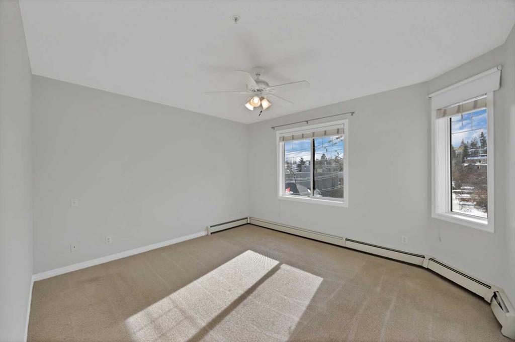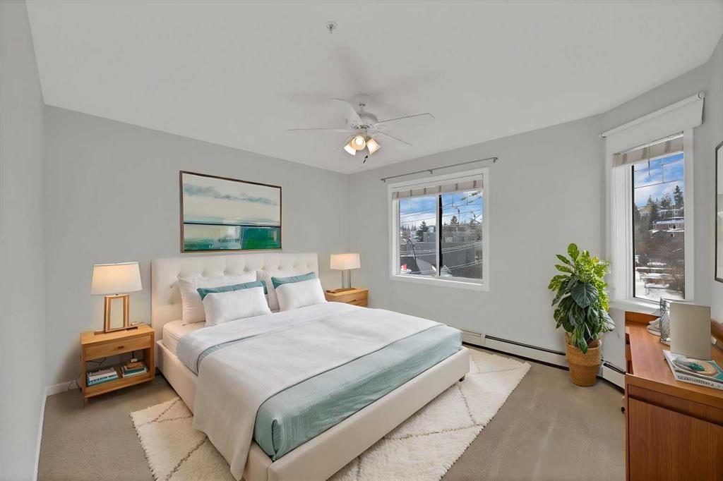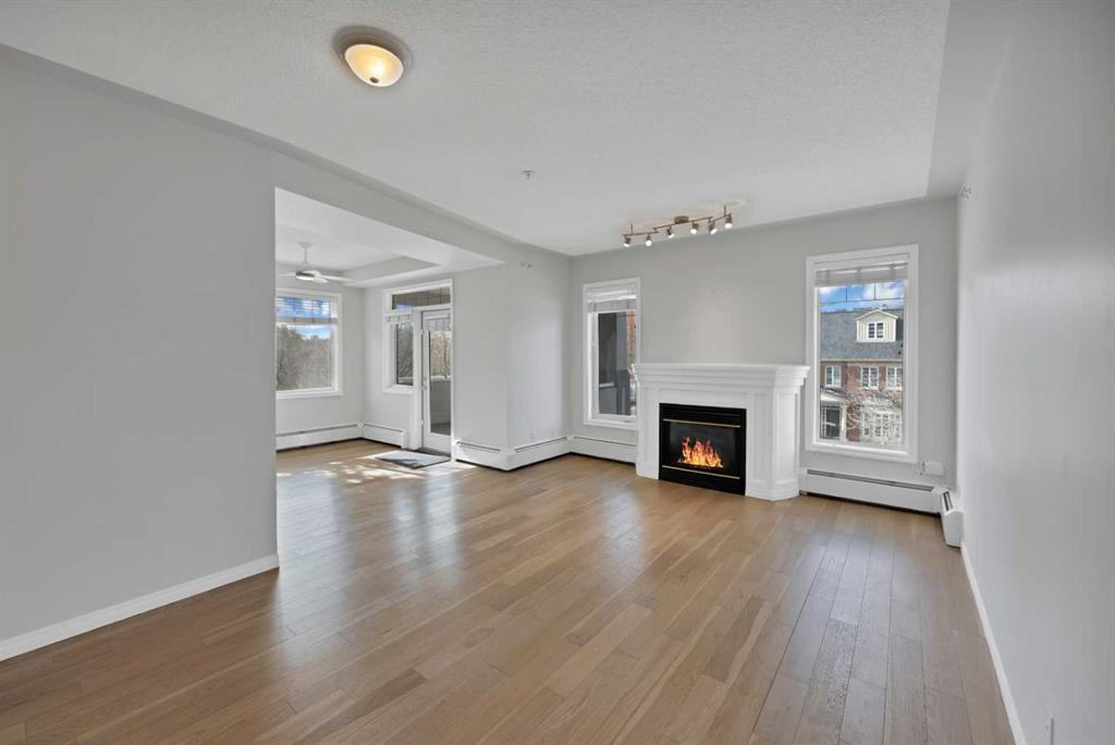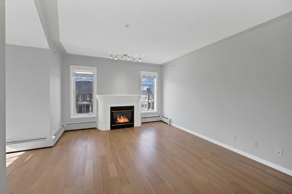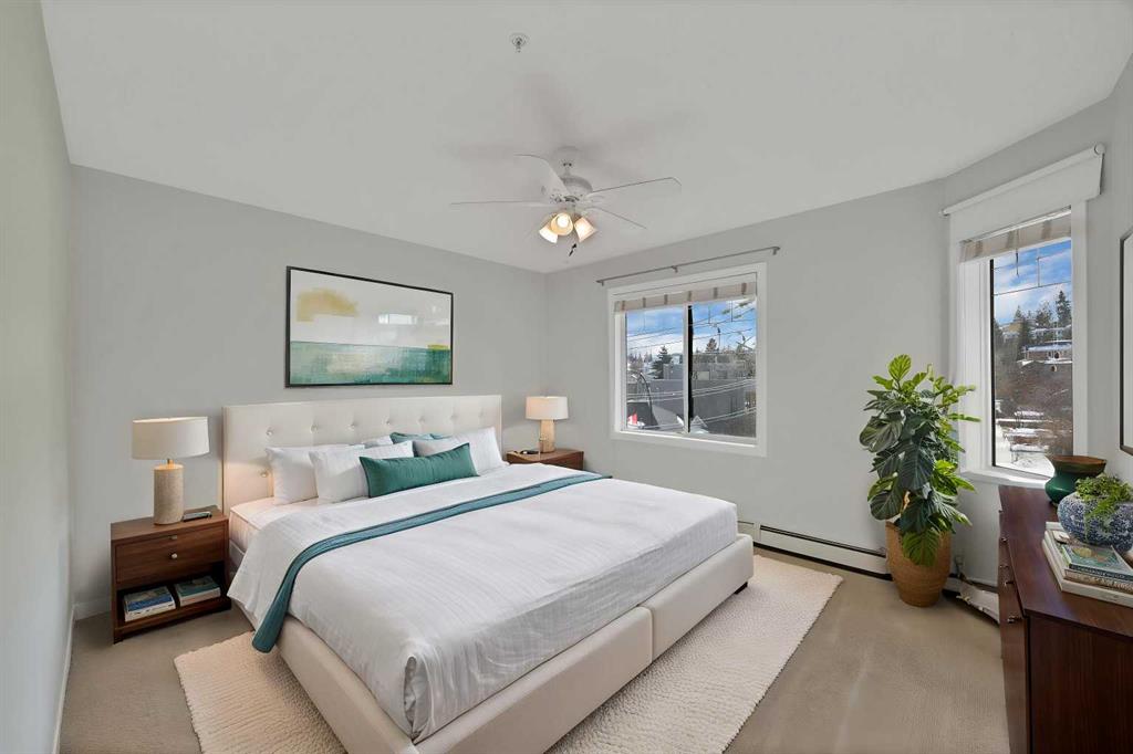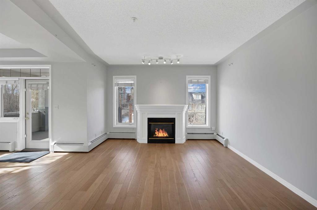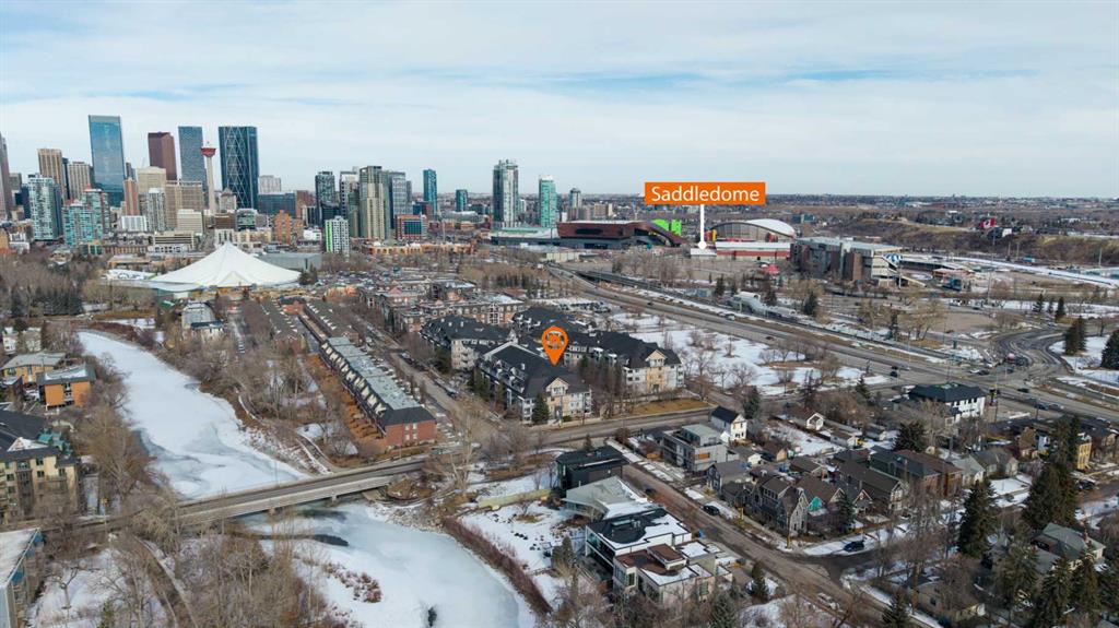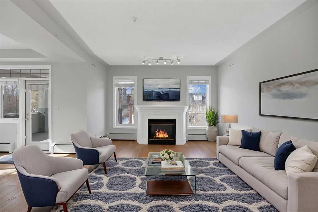 Welcome to this corner unit with River and skyline views from this spacious two bedroom, two bathroom condo in The Waterford of Erlton, offering over 1,100 sq. ft. of living space on the third floor featuring 2 titled underground parkings. The open concept layout features 9 ft. ceilings, updated hardwood flooring, and a bright living area with a gas fireplace. The kitchen is equipped with upgraded stainless steel appliances and ample cabinetry. Both generously sized bedrooms include their own ensuite bathrooms and large walk-in closets. Additional features include a large covered balcony with separate storage overlooking the Elbow River, as well as a dedicated in-suite laundry room with washer and dryer. The unit also comes with two heated underground parking stalls. Building amenities include bicycle storage, a car wash bay, visitor parking, and a reservable courtyard pavilion with a party room for larger gatherings. Ideally located within walking distance to the MNP Community & Sport Centre, the Saddledome, Mission District restaurants, 17th Avenue, East Village, and downtown. Convenient access to public transit with the Erlton LRT Station located directly across the street.