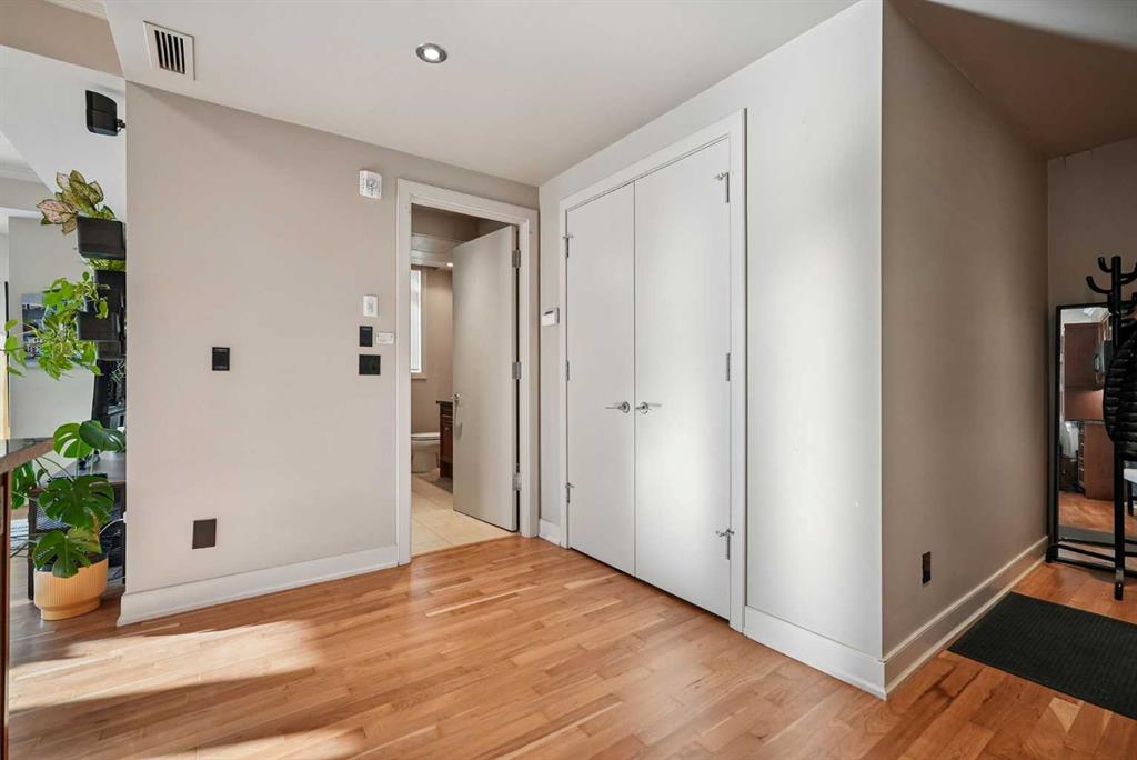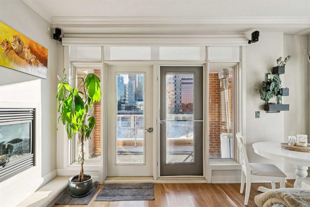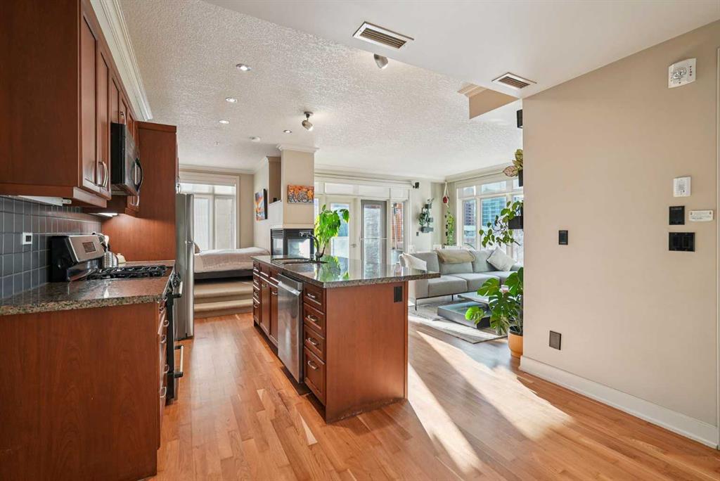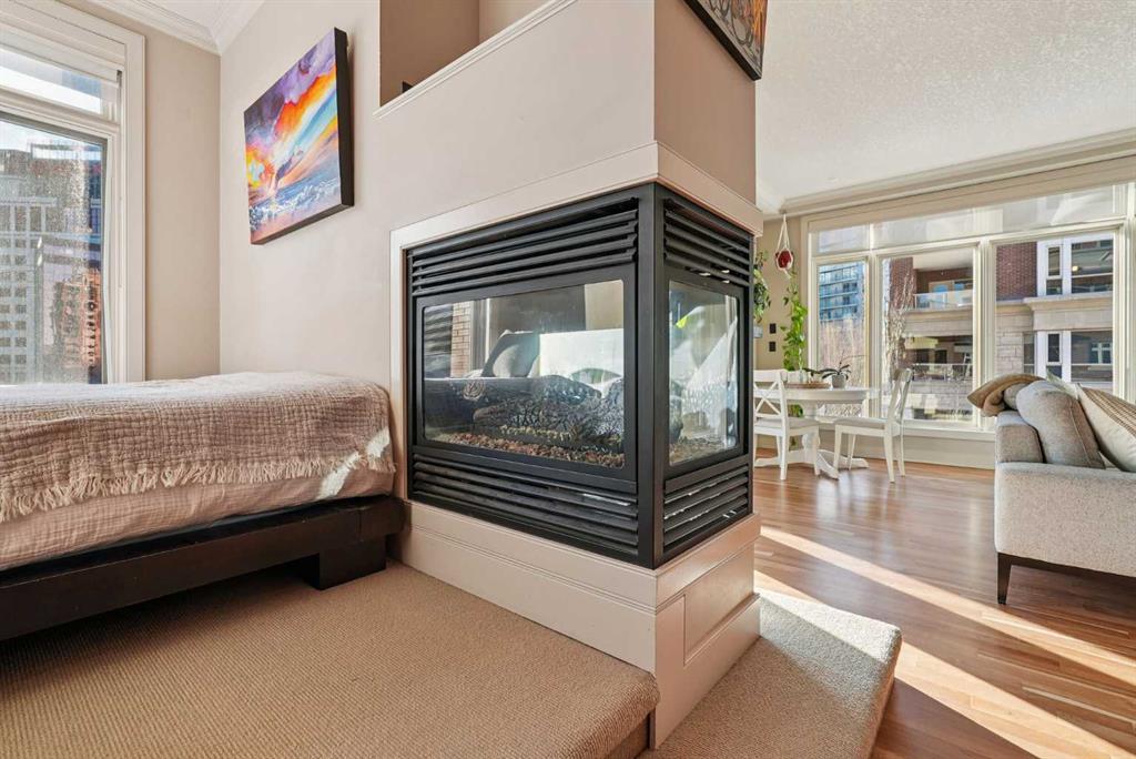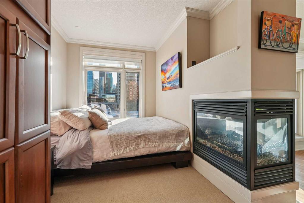 Luxurious upscale studio apartment condo in the prestigious Princeton Cityscape! Exceptional bright southwest corner location with large south and west windows providing plenty of natural light while enhancing the city views. Open concept with high ceilings, hardwood floors, granite counter tops, stainless steel appliances, gas stove, new fridge & dishwasher, built-in vacuum system, 3 sided gas fireplace, 5 built-in speakers, subwoofer and components, large south-facing covered balcony, balcony has rough-in for speakers, spacious 3 pce bathroom with large shower stall, in-suite laundry with stacked washer/dryer and large closet with built-in organizers. Comes with central air conditioning, in-floor heating, secure underground titled parking and storage locker, inner courtyard, visitor parking, underground carwash bay and recently renovated common areas. Extraordinary Heart of Eau Claire location nestled along the south bank of the Bow River next to beautiful Prince’s Island Park and the World-Class Pathway System! Close to great restaurants and Cafe’s, fine dining, plus 15 skywalk system, transportation & LRT, Peace Bridge and just a short walk to Kensington Shops, Safeway and Calgary’s vibrant City Center. Amazing opportunity to call this prestigious building your home while living the ultimate downtown urban lifestyle!