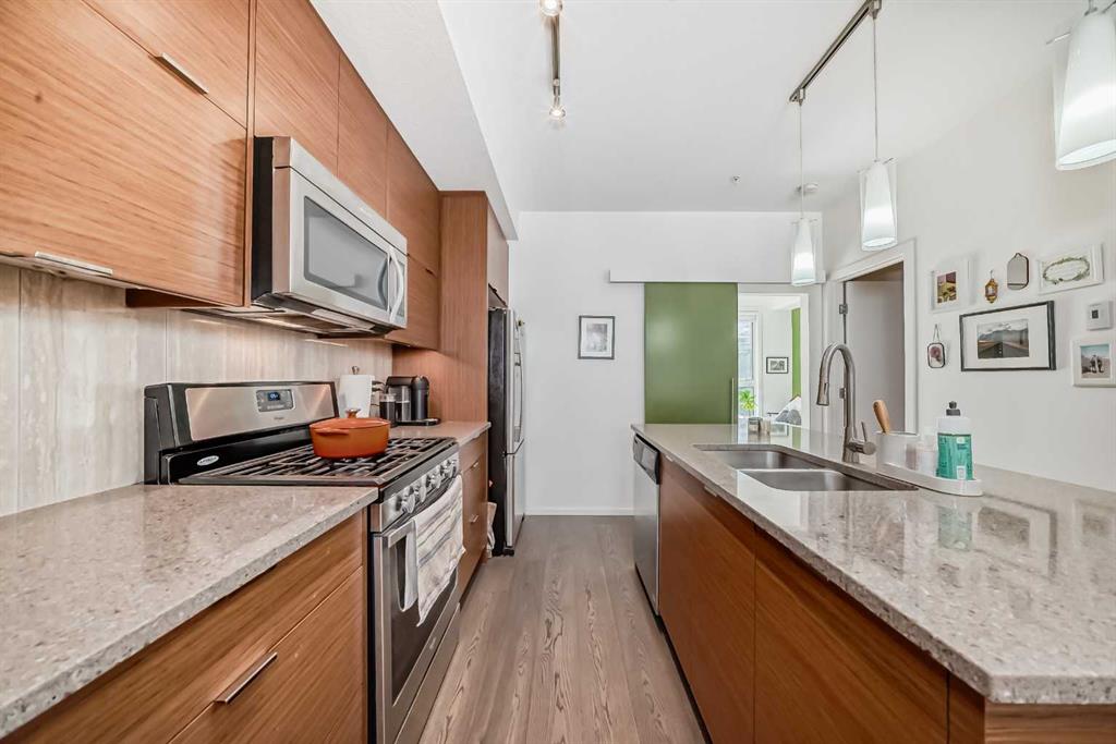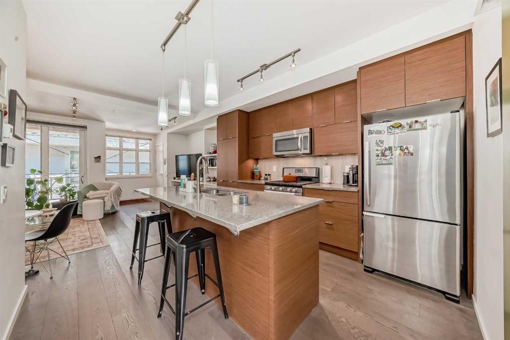 Welcome to ‘The Block’. This one-bedroom condo showcases modern style in the heart of Lower Mount Royal, just steps away from the vibrant and trendy 17th Ave. Designed for the urban professional, this condo features high ceilings, a bright and open layout, newly installed engineered hardwood floors, and a kitchen that boasts sleek cabinets, quartz countertops, a gas stove, tile backsplash, under-mount lighting, and ample pantry storage. The spacious bedroom includes a surprisingly large walk-in closet. The bathroom exudes luxury with high-end finishes, floor-to-ceiling tile, and a glass shower. Additional amenities include in-suite laundry, TITLED underground parking, an assigned storage locker, and attractive condo fees. The complex is thoughtfully designed with a beautifully landscaped inner courtyard, elevator, and secure door access for added safety. This unbeatable location is just steps away from Urban Fare, Vine Arts, Canadian Tire, Made by Marcus, bike paths, parks, the river, and all the other fantastic 17th Ave amenities. This is a unique opportunity to enjoy the best the city has to offer.