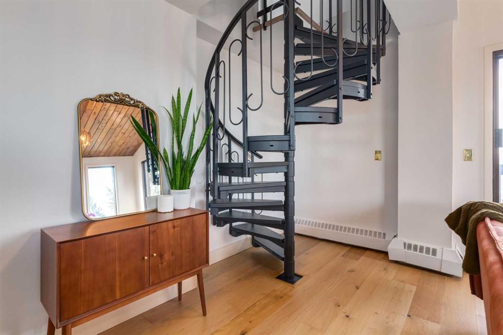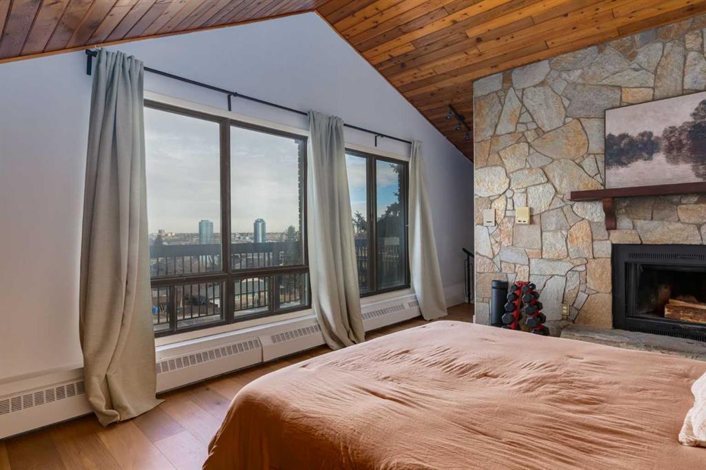Two bedrooms and a beautifully renovated bathroom with Italian marble complete the main floor. A dramatic spiral staircase leads to the upper loft,with a wood-burning fireplace—perfect as a family room, office, or studio—with access to a second balcony overlooking downtown.