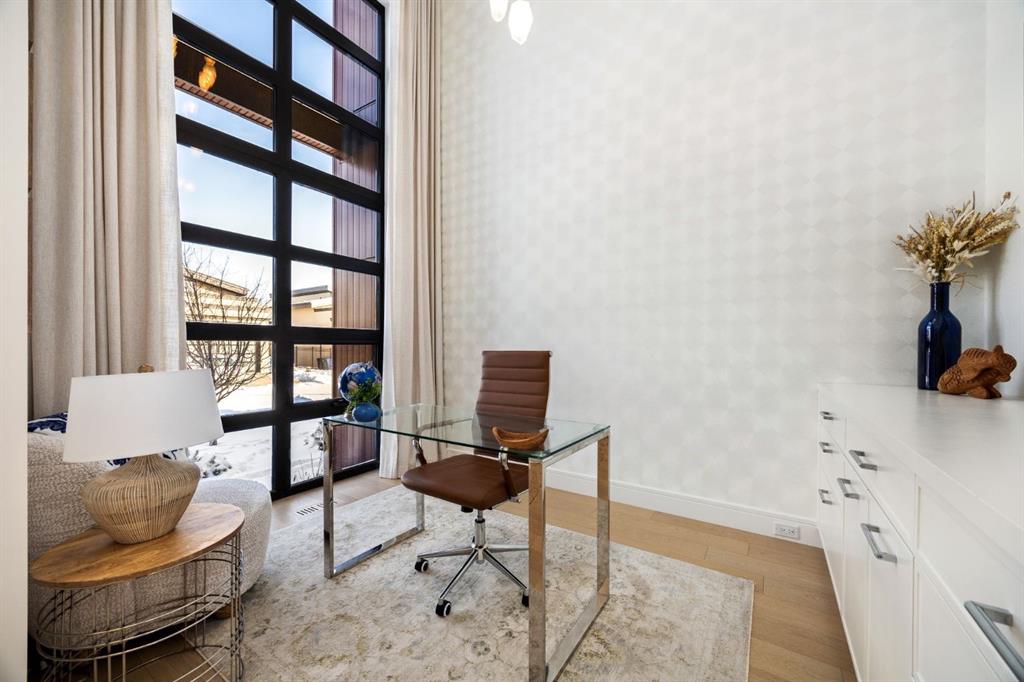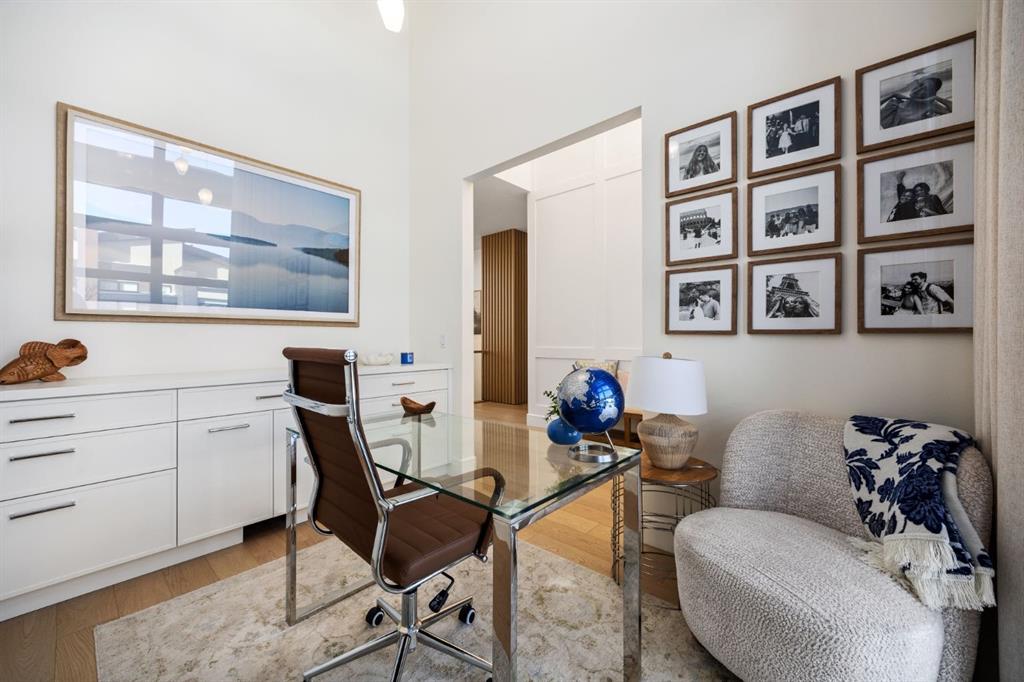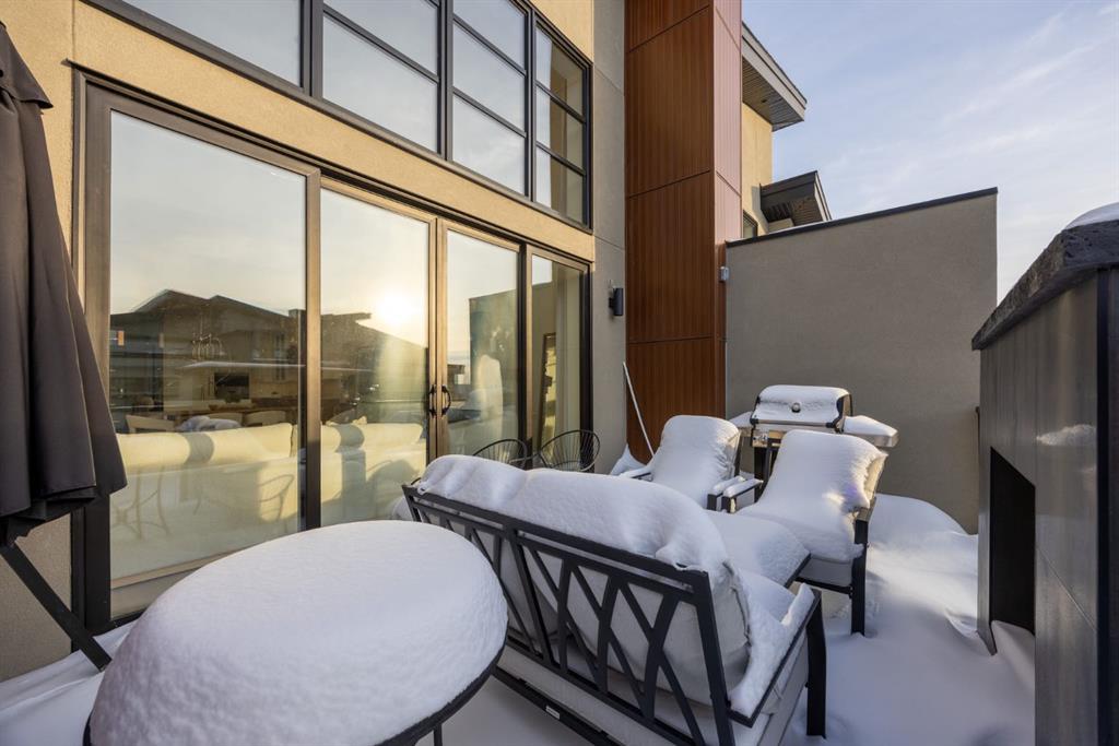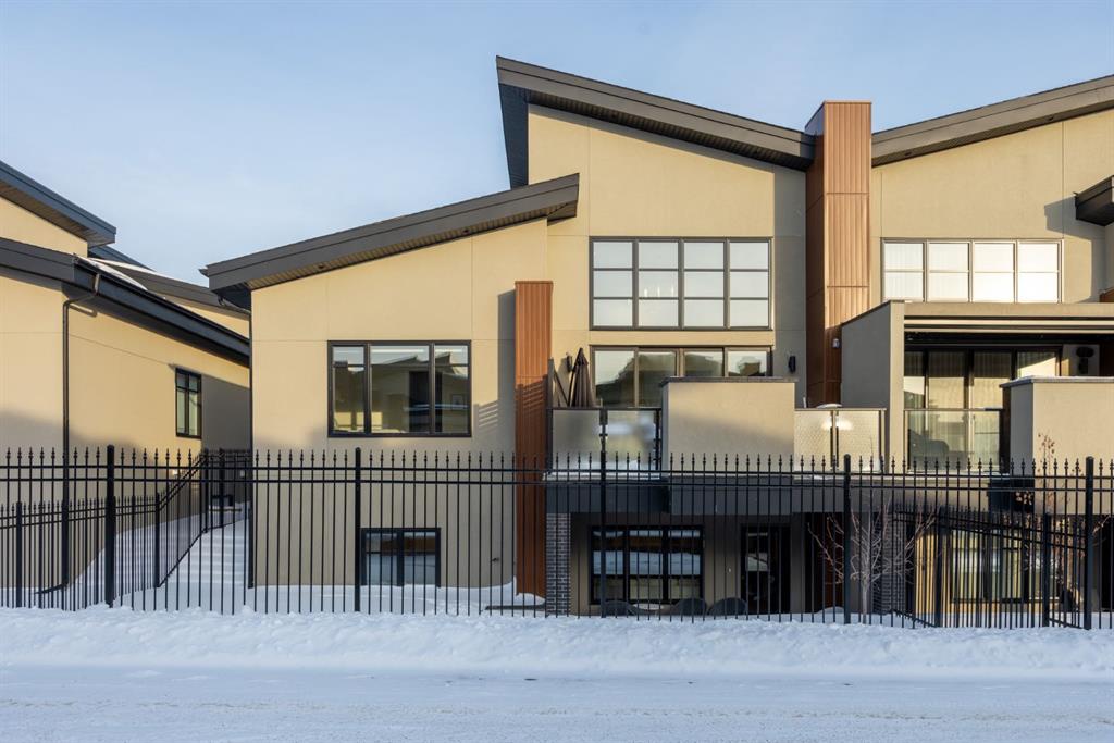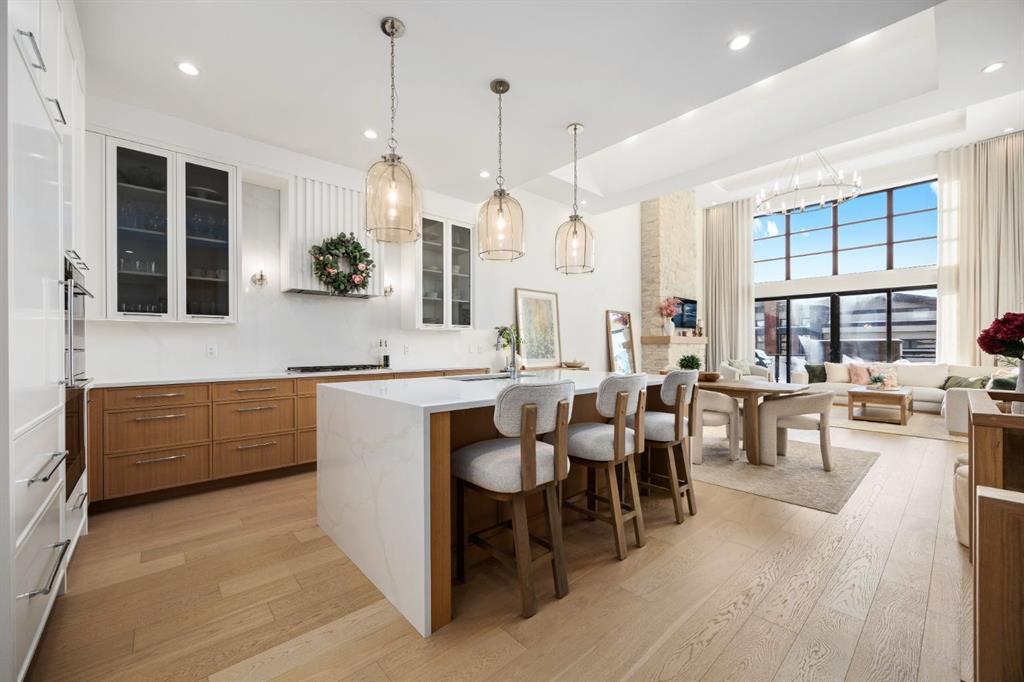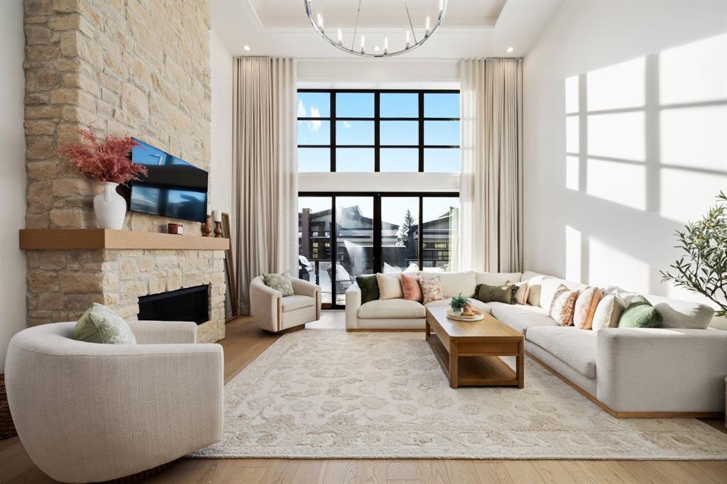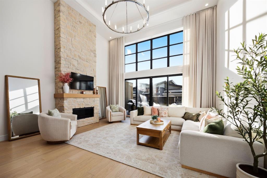 Open House Saturday March 14th 12-2pm. Introducing a rare offering in the sold out luxury bungalow community of Elveden Court on Calgary’s coveted west side, made up of only 26 units. This refined residence represents the pinnacle of lock-and-leave living, designed for discerning homeowners who appreciate exquisite craftsmanship paired with the ease of a low-maintenance, lock and leave lifestyle. This unit is elegantly finished with tile, flooring, millwork, wallpaper and stone upgrades from an already elevated build quality to create a serene, warm and inviting atmosphere. Builder owned, rest assured, every detail has been carefully executed! The open-concept main level is warm and inviting, with light oak hardwood flooring, soaring ceilings, ample skylights and expansive windows that flood the entire living space with natural light. A striking hand built stone fireplace anchors the great room under 16’ ceilings, while large doors open to a west facing patio with a built-in gas fireplace, perfect for indoor-outdoor entertaining. The kitchen is a true showpiece, appointed with a premium Wolf & Sub-Zero appliance package. Custom cabinetry including an enhanced walk up pantry design is complemented by an upgraded quartz backsplash and a waterfall island creating both visual impact and exceptional functionality. The main level primary suite offers a tranquil retreat, featuring a spacious bedroom, walk-in dressing room, and a spa-inspired ensuite with in-floor heat, upgraded tile selections, dual vanities, a freestanding soaker tub, and an oversized 10mm glass shower. Custom, elegantly exciting wallpaper feature walls adorn many of the tranquil spaces throughout the home. A beautifully appointed den with custom millwork, a powder room and a well appointed laundry area complete the main floor. The fully developed walk-up level with 9’ ceilings is designed for entertaining and lifestyle flexibility. A spacious recreation area is highlighted by an upgraded gas fireplace and a wet bar. Two additional bedrooms with custom closets and a full three-piece bath provide ideal accommodation for guests or older children. This lower level also has a thoughtfully upgraded home gym, and additional storage in the mechanical room. The oversized double attached garage features a heated slab, epoxy flooring, transom windows for natural light, and a custom storage mezzanine. Built to an exceptional standard, the home was constructed with full Insulated Concrete Forms (ICF) to the soffit line, including the party wall, delivering superior thermal efficiency, sound attenuation, and long-term durability. Triple-glazed windows and skylights enhance comfort and natural light further exemplifying the quality of construction. Minutes to Aspen Landing, Westside Recreation Centre, Stoney Trail, and the Rocky Mountains, this villa community offers an un offers an unparalleled blend of privacy, quality, and convenience.
