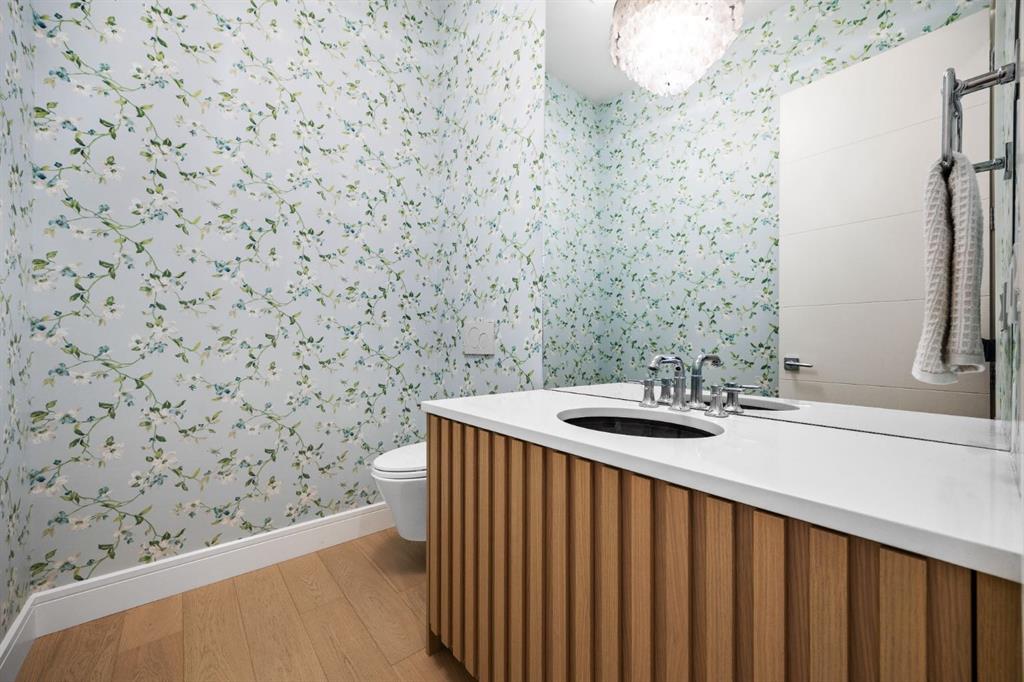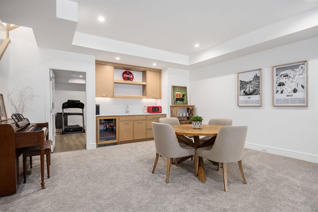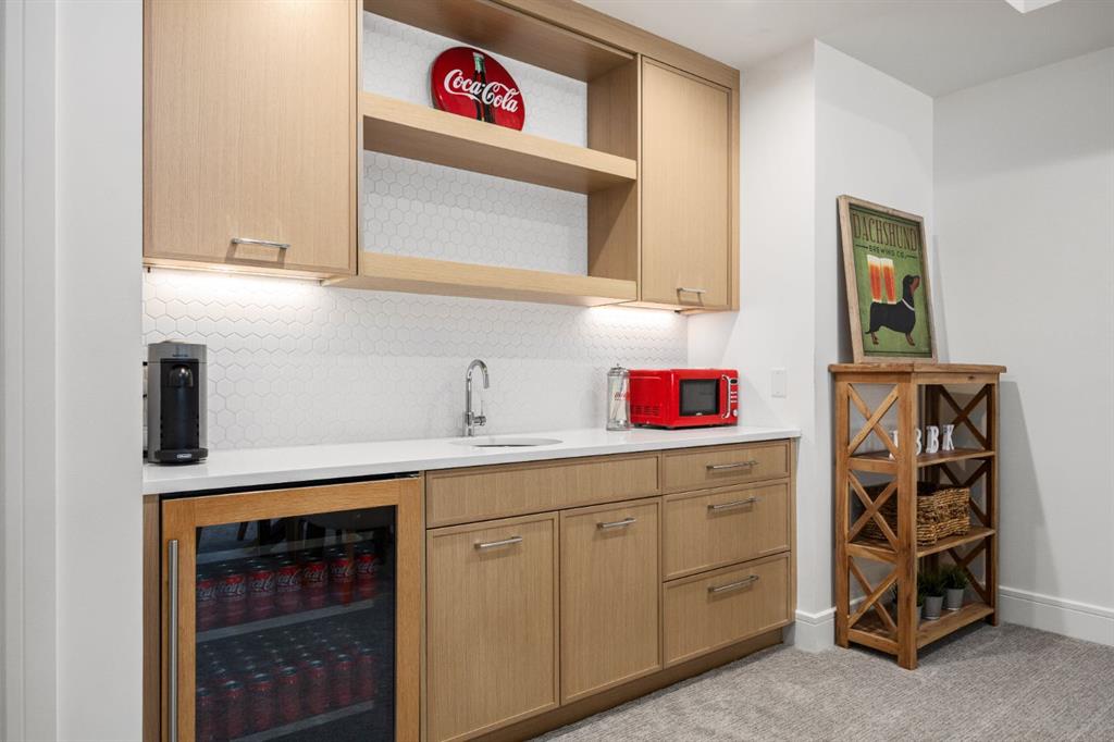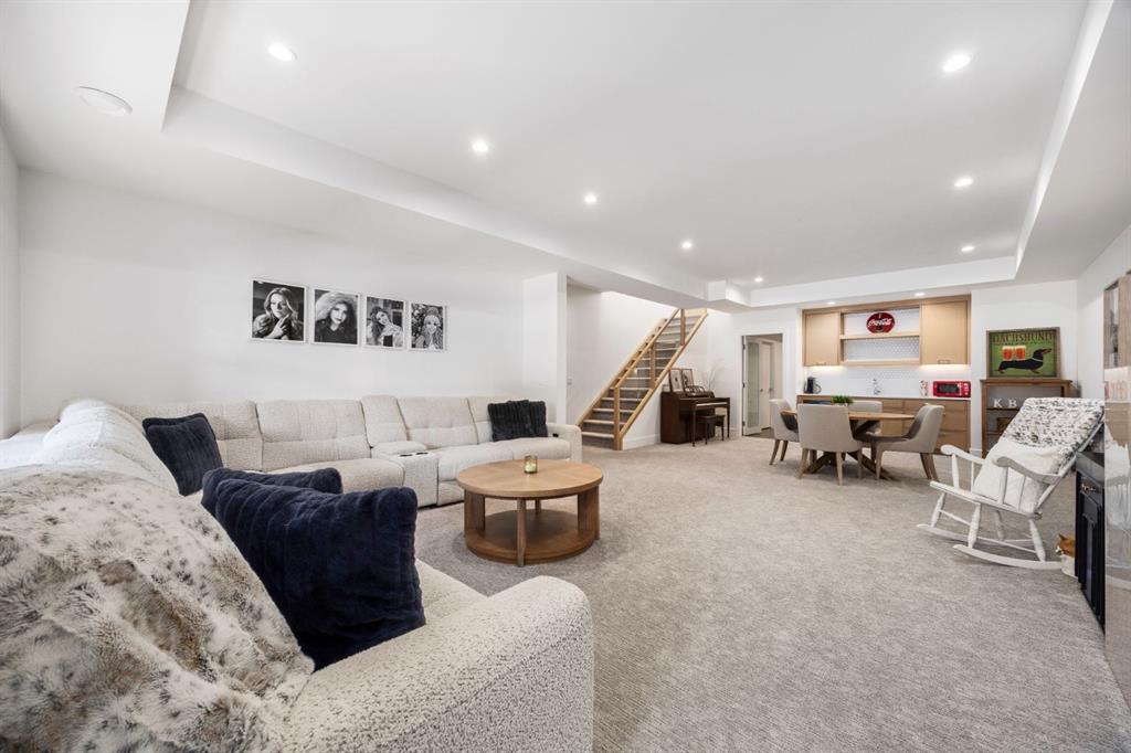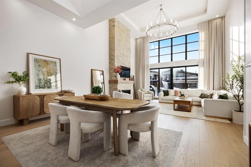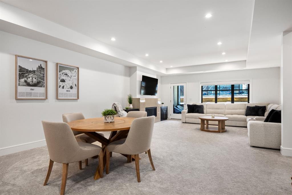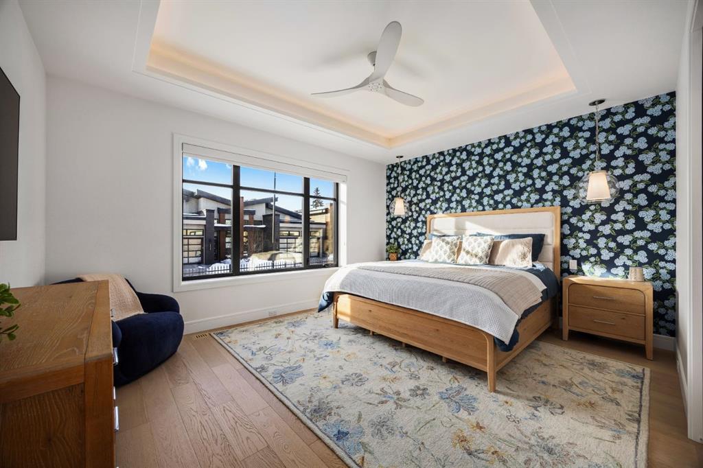 Open House Saturday March 14th 12-2pm. Introducing a rare offering in the sold out luxury bungalow community of Elveden Court on Calgary’s coveted west side, made up of only 26 units. This refined residence represents the pinnacle of lock-and-leave living, designed for discerning homeowners who appreciate exquisite craftsmanship paired with the ease of a low-maintenance, lock and leave lifestyle. This unit is elegantly finished with tile, flooring, millwork, wallpaper and stone upgrades from an already elevated build quality to create a serene, warm and inviting atmosphere. Builder owned, rest assured, every detail has been carefully executed! The open-concept main level is warm and inviting, with light oak hardwood flooring, soaring ceilings, ample skylights and expansive windows that flood the entire living space with natural light. A striking hand built stone fireplace anchors the great room under 16’ ceilings, while large doors open to a west facing patio with a built-in gas fireplace, perfect for indoor-outdoor entertaining. The kitchen is a true showpiece, appointed with a premium Wolf & Sub-Zero appliance package. Custom cabinetry including an enhanced walk up pantry design is complemented by an upgraded quartz backsplash and a waterfall island creating both visual impact and exceptional functionality. The main level primary suite offers a tranquil retreat, featuring a spacious bedroom, walk-in dressing room, and a spa-inspired ensuite with in-floor heat, upgraded tile selections, dual vanities, a freestanding soaker tub, and an oversized 10mm glass shower. Custom, elegantly exciting wallpaper feature walls adorn many of the tranquil spaces throughout the home. A beautifully appointed den with custom millwork, a powder room and a well appointed laundry area complete the main floor. The fully developed walk-up level with 9’ ceilings is designed for entertaining and lifestyle flexibility. A spacious recreation area is highlighted by an upgraded gas fireplace and a wet bar. Two additional bedrooms with custom closets and a full three-piece bath provide ideal accommodation for guests or older children. This lower level also has a thoughtfully upgraded home gym, and additional storage in the mechanical room. The oversized double attached garage features a heated slab, epoxy flooring, transom windows for natural light, and a custom storage mezzanine. Built to an exceptional standard, the home was constructed with full Insulated Concrete Forms (ICF) to the soffit line, including the party wall, delivering superior thermal efficiency, sound attenuation, and long-term durability. Triple-glazed windows and skylights enhance comfort and natural light further exemplifying the quality of construction. Minutes to Aspen Landing, Westside Recreation Centre, Stoney Trail, and the Rocky Mountains, this villa community offers an un offers an unparalleled blend of privacy, quality, and convenience.