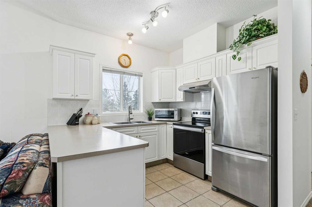 Top-floor corner unit with 9-foot ceilings in the Fairways Pavilions complex. This 2-bedroom, 2-bathroom condo offers an open layout with a tiled foyer, vaulted ceilings, and good natural light from large windows. The kitchen features a wrap-around counter with a breakfast bar and a separate eating area. The living room includes a corner gas fireplace. The primary bedroom has a walk-in closet and a 3-piece ensuite. The second bedroom is next to a 4-piece bathroom. There is in-suite laundry with additional storage. The balcony includes a gas line for a BBQ and a separate storage room. The unit comes with titled parking in a heated underground parkade. Located close to transit, schools, and shopping. Condo fees include heat and water. One pet allowed with board approval.