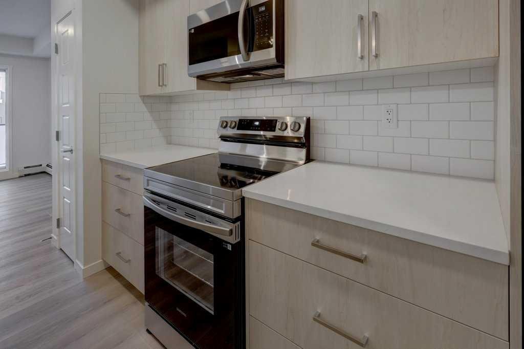INTRODUCING GLACIER RIDGE, IN BEAUTIFUL NORTHWEST CALGARY. BUILT BY CEDARGLEN LIVING, WINNER OF THE Customer Insight BUILDER OF CHOICE AWARD, 6 YEARS RUNNING! BRAND NEW “GR04” unit with high-spec features. You will feel right at home in this well thought-out, 586.94 RMS sq.ft. 1 bed, 1 bath home with open plan, 9′ ceilings, LVP flooring throughout (NO CARPET), Low E triple glazed windows, BBQ gas line on the patio, Fresh Air System (ERV), A/C rough-in, and so much more. The kitchen is spectacular with full height, two tone cabinets, quartz counters, upgraded bank of drawers for pots and pans, undermount sink, rough-in water line to the fridge and S/S appliances. The island is extensive with built in flush breakfast bar, which transitions into the spacious living area, perfect for entertaining. The spacious primary bedroom has a large bright window (triple pane windows) and sizeable walk-in closet. Right beside your bedroom is a 4pc bath with quartz counters, upgraded tiles to the ceiling, and undermount sink. Nearby is the spacious laundry/storage room, this is a must see (washer & dryer included). Highlights include: Hardie board siding, designer lighting package, sound reducing membrane to reduce sound transmission between floors, clear glass railing to balconies and 1 titled underground parking stall included. A once in a lifetime community in Northwest Calgary. Framed by views of the Rocky Mountains and distinguished by natural coulees that cross the land, Glacier Ridge offers a rare chance for families to live in a new community. PET FRIENDLY COMPLEX, IMMEDIATE POSSESSION AVAILABLE AND DON’T FORGET TO CHECK OUT THE VIRTUAL TOUR.