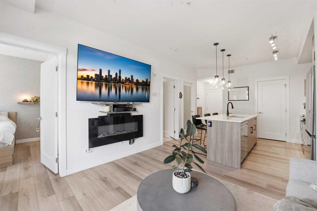This 2-bedroom, 2-bathroom condo with AC offers a refined take on lake community living, complete with low condo fees of $327.50 including heat and water, titled underground parking, an assigned storage locker, in-suite laundry, and full access to the highly desirable Auburn Bay lake community. As you step inside, you’re welcomed by a well-appointed entryway with a convenient coat closet to your left. From here, the home opens up beautifully into the kitchen and main living space, immediately setting the tone with its bright, modern feel and thoughtful design. The kitchen is both stylish and functional, featuring ceiling-height cabinetry, quartz countertops, a stunning tile backsplash, black modern hardware, and upgraded lighting that adds warmth and character. Stainless steel appliances, a built-in microwave, sleek hood fan, and a silgranite undermount sink complete the space. Tucked seamlessly into a storage closet beside the kitchen is the in-suite laundry, keeping daily tasks out of sight while remaining easily accessible. Flowing openly from the kitchen, the living room is inviting and comfortable, anchored by a cozy electric fireplace with a built-in mantle. Large sliding glass doors fill the space with natural light and lead you onto the balcony, a outdoor retreat perfect for morning coffee, evening wine, or summer entertaining. The primary bedroom offers a calm and comfortable escape, featuring two closets and plenty of natural light. The private ensuite elevates the experience with a floor to ceiling tiled walk-in shower, quartz countertops, and an undermount sink, creating a spa-like feel without being overdone. Nearby, the second bedroom is generously sized and versatile, perfect as a guest room and/or office. The second bathroom is a full 4-piece with a tub and shower, ideal for guests or shared living. Throughout the home, thoughtful upgrades such as wide luxury vinyl plank flooring, 9-foot ceilings, air conditioning, and modern finishes create a polished, cohesive look that balances comfort with style. Add in the convenience of underground parking with a storage locker located directly behind the stall, and the everyday ease of condo living truly shines. Set between Auburn Bay and Mahogany, with walkable access to shops, dining, groceries, parks, and an off-leash dog park, this upgraded condo delivers everything you could hope for in a lake community – lifestyle, design, and value, without compromise.