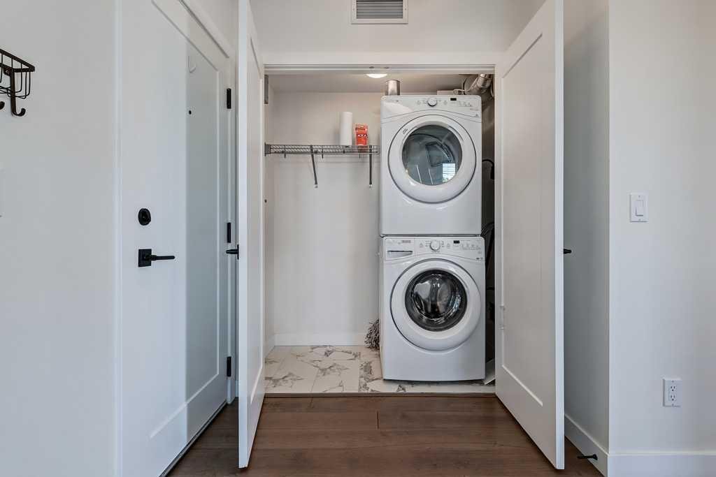 Corner end unit on the 3rd floor in a prime location, on the quiet side of the building. This home has ultra modern interiors with wide plank engineered hardwood flooring, high gloss white cabinetry with soft close drawers and doors, striking black fixtures. Well planned and scaled home with not a square inch of unused space. Gourmet kitchen offers Cesarstone quartz countertops, gas countertop stove, AEG pullout hoodfan, built in wall oven, Double door Stainless steel fridge, and anthracite undermount sink with Kohler touchless Faucet. Private and quiet location with no view obstructions, or neighbours looking into your windows. This building is just 3 blocks to the Shaganappi Point LRT station, and a 5 min drive to DT and 17th ave. An Unbeatable inner city location. Insuite Laundry. One underground Parking Stall. Same floor out of suite storage locker.Secure Bike storage in parkade.