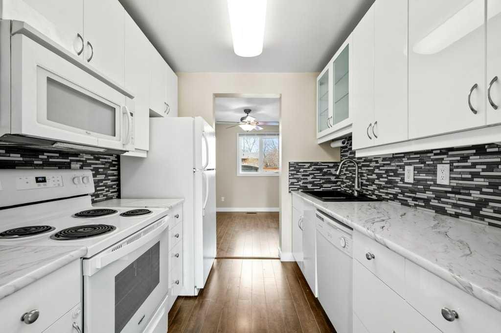The main floor features laminate flooring and a functional layout with a bright front living room, convenient 2-piece bath, and a very spacious dining area with a garden door leading to the north-facing backyard complete with a storage shed and plenty of space for the kids and pets to play. The galley-style kitchen offers white cabinetry, tiled backsplash, extended-height cabinets, and a full appliance package.