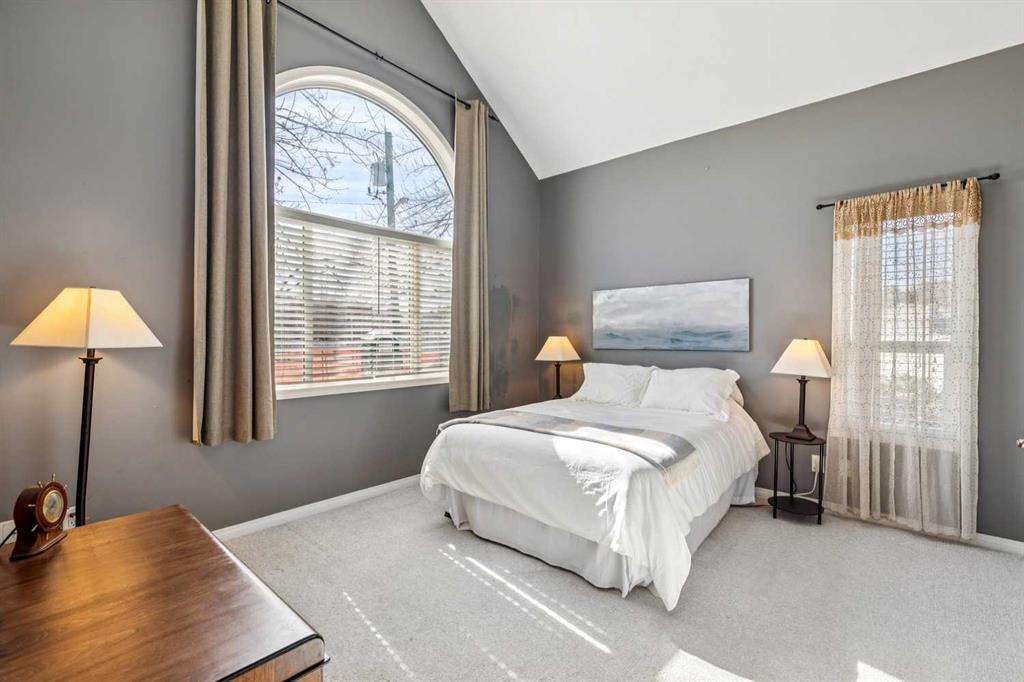 Soaring vaulted ceilings and large windows flood the open-concept main floor with natural light, highlighting the elegant living area with gas fireplace, generous dining space, and a well-appointed kitchen with breakfast bar, pantry, and updated appliances. A main-floor bedroom with full ensuite and walk-in closet offers exceptional flexibility for guests or a home office, while the private patio provides a quiet outdoor retreat.