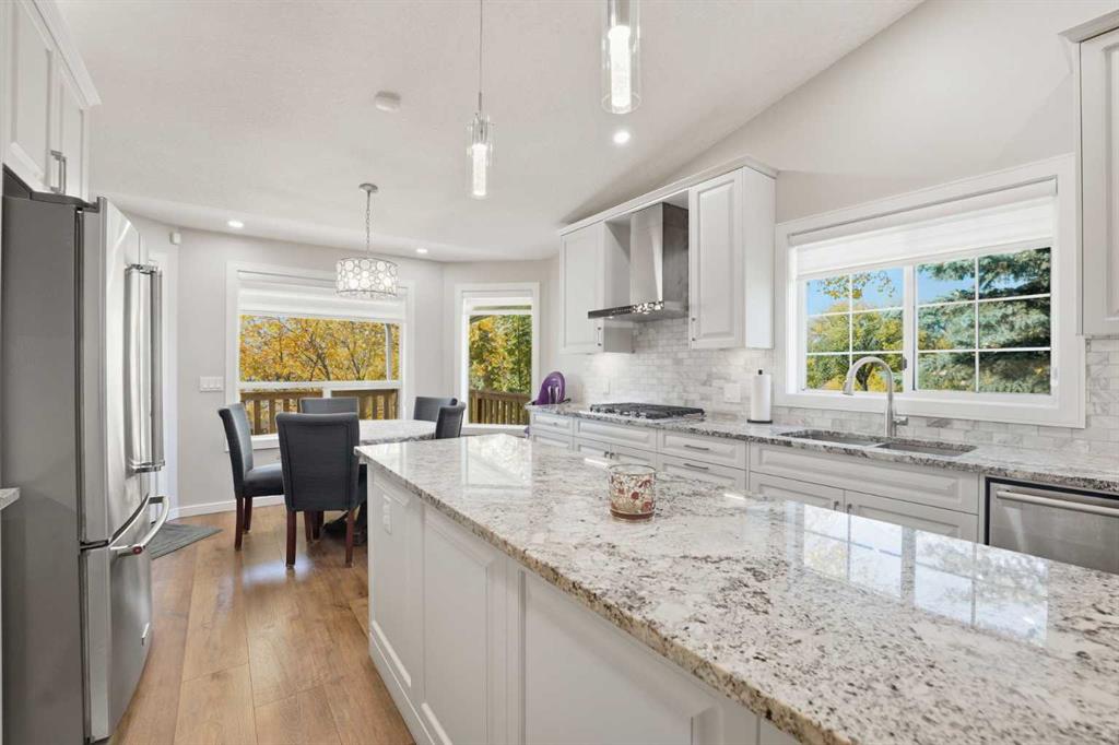 HONEY! START THE CAR! Welcome home to this BEAUTIFUL corner lot, adjacent to GREENSPACE, where MODERN ELEGANCE meets FUNCTIONALITY. This spacious 2,382 square feet in total bi-level DETACHED home with a DOUBLE ATTACHED GARAGE is sure to IMPRESS! This property has many FEATURES that you will LOVE, including the unique floor-plan with the living room located on the main floor level, and the OPEN CONCEPT layout with MODERN flat textured high VAULTED CEILINGS. RECENT RENOVATIONS have been done inside this property from TOP to BOTTOM! This property FEATURES new high-end STAINLESS STEEL appliances, GRANITE counter tops, CUSTOM cabinetry with tons of storage space, a LARGE kitchen Island, BUILT-IN convection oven and microwave, a 5-burner GAS RANGE STOVETOP, GORGEOUS wide-plank scratch resistant flooring throughout, NEW carpets throughout, MODERN flat textured ceilings throughout, high-end CLASSY light fixtures and pot lights, CUSTOM window coverings, DECK access conveniently located off of the kitchen, 4 spacious sized bedrooms, including the primary bedroom with a WALK-IN CLOSET and 4-PIECE ENSUITE, 3 full bathrooms FEATURING TILE FLOORING, TILE BACKSPLASH, and GRANITE countertops, JETTED bathtub on the lower level, LOTS of windows throughout allowing for lots of NATURAL sunlight, the laundry room features a LARGE window and a LARGE sink, lots of STORAGE SPACE, a WELL-KEPT and spacious FULLY FENCED backyard, the lower level features a SUITE that can be kept as so, or can easily be converted back into a non-suite, included with this property is an A/C unit for those hot spring and summer months, and the ICING ON THE CAKE – this property features high-end GEMSTONE EXTERIOR lighting!!! Make this IMPRESSIVE property your new home, this property will not last long, call your favourite realtor today!