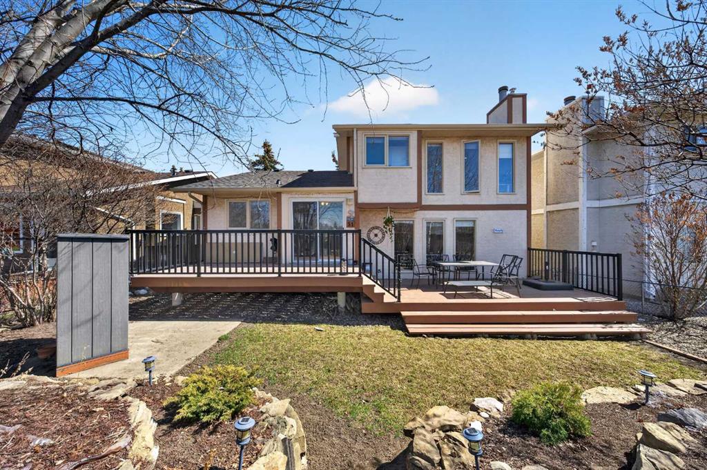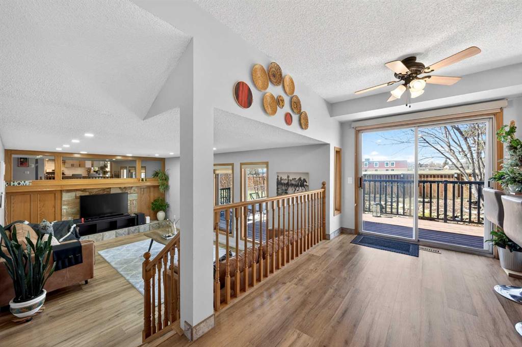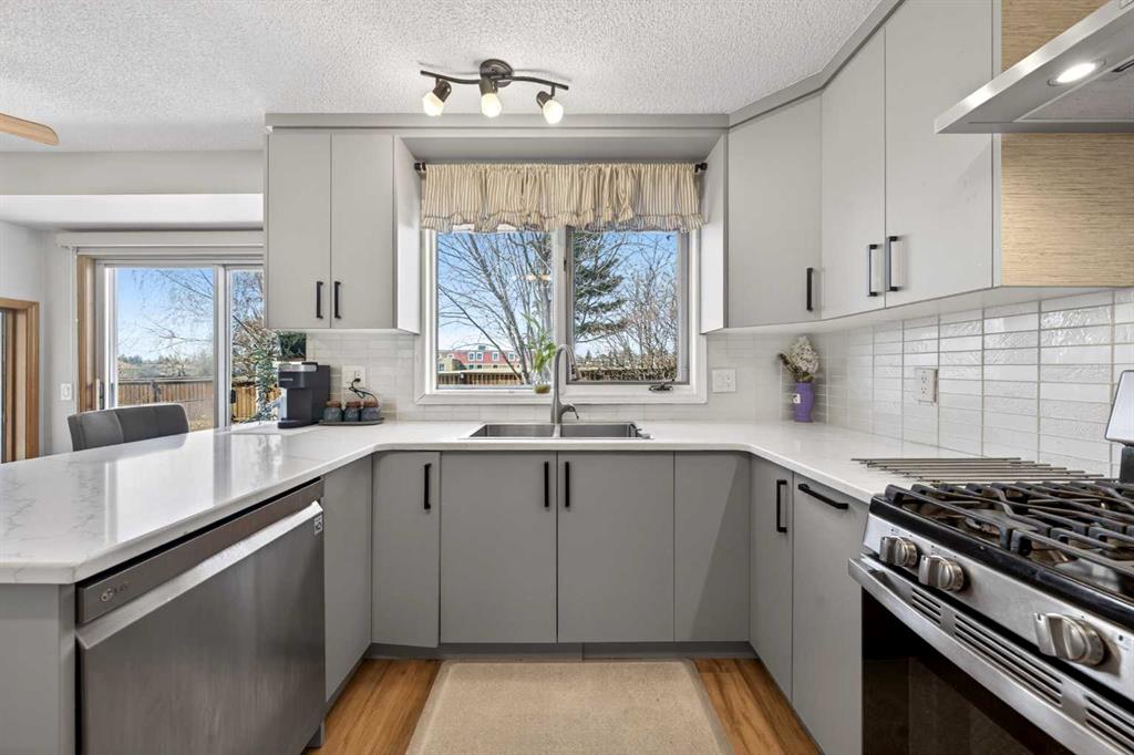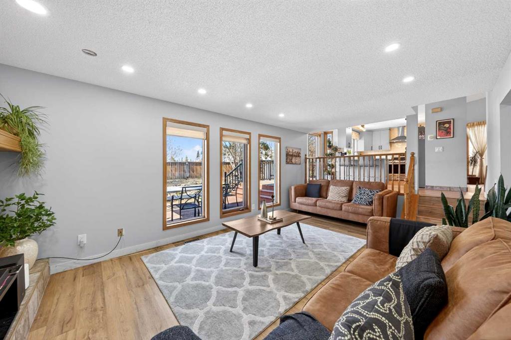 Beautifully updated 5-level split in prestigious Edgemont, backing onto Greenspace with private gate access. This exceptional family home offers 4+1 Bedrooms, 3 Baths, and over 2,844 sq ft of total developed living space. With extensive upgrades and a highly functional layout, this is a rare opportunity in one of Northwest Calgary’s most sought-after communities. Step inside the main living space and be greeted by soaring 10’11” vaulted ceilings over the Living Room and Dining Room, creating a bright, open atmosphere and refreshing airflow throughout the home. Durable Vinyl Plank flooring runs throughout the Main level, while large windows enhance the spacious feel. The beautifully renovated Kitchen is both stylish and functional, featuring quartz countertops, full-height cabinetry, stainless steel appliances, gas stove, modern backsplash, and peninsula seating. Large windows above the sink overlook the backyard and Greenspace beyond. The sunny West-facing Nook opens through patio doors to the fully fenced and low maintenance backyard oasis with mature trees, terraced stonework, and direct gate access to Greenspace and Tom Baines School. The two-tier Deck offers multiple seating areas to relax and enjoy the peaceful setting with no neighbors behind. A few steps down, the inviting Family Room features a stone fireplace and 3 tall windows framing backyard views. This level also includes a Bedroom and full 3-piece Bath, ideal for elderly family members, guests, or a private home office. Upstairs offers 3 Bedrooms and 2 full Baths. The spacious Primary Bedroom includes 3 windows, a walk-in closet, a ceiling fan, and a 4-piece ensuite with double vanity and an oversized shower. Two additional well-sized Bedrooms are served by another 4-piece Bath. The lower level features a generous Recreation Room with a dry bar, plus an additional Bedroom—perfect for teenagers, hobbies, or guest space. The basement level provides a large Flex Area ideal for a home gym, games room, studio, or media room. Major upgrades include Roof (2023), High-Efficiency Furnace (2024), Vinyl flooring (2022), upper and lower carpet (2022), renovated Kitchen (2022), updated range, dishwasher, washer and dryer (2023/24), and pot lights throughout the Main and Upper floors. Located close to parks, pathways, transit, shopping, and top-rated schools including Edgemont School, Tom Baines School, and Sir Winston Churchill High School. Quick access to Shaganappi Trail, Crowchild Trail, John Laurie Boulevard, and Stoney Trail makes everyday commute a breeze. Book your private showing today!