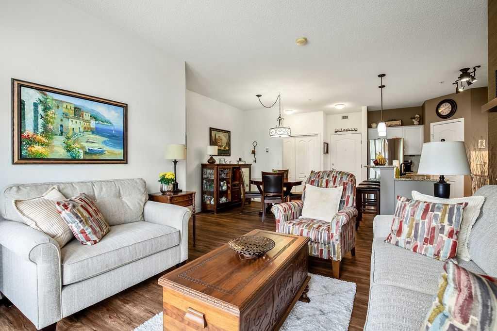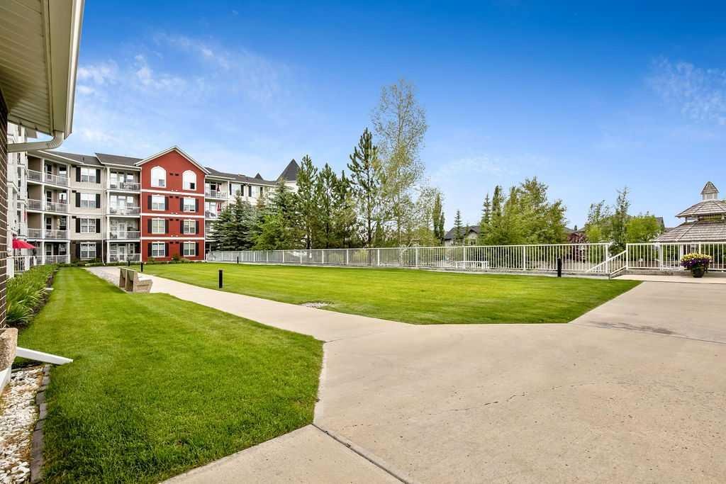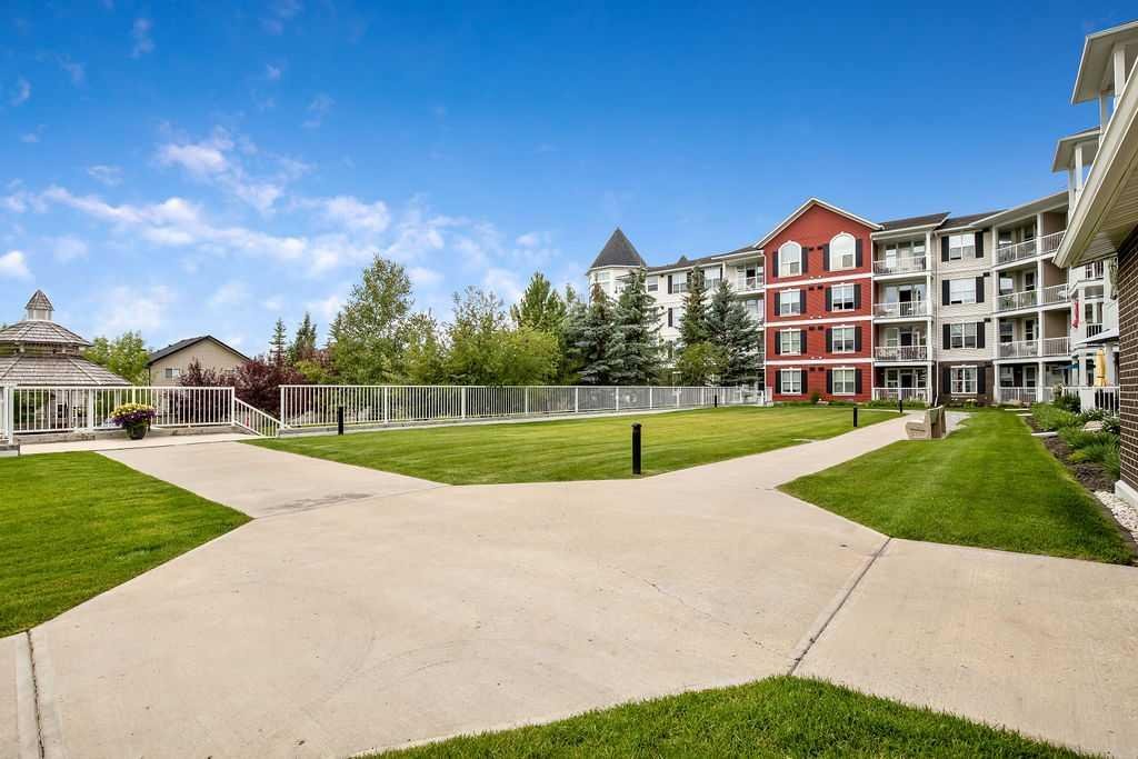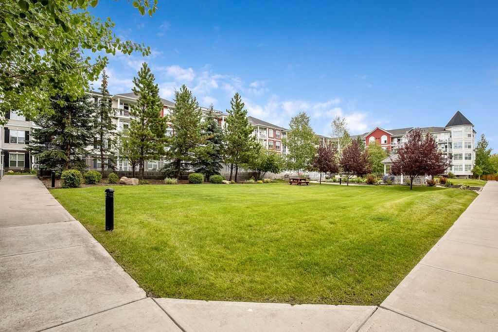 This is a lovely, immaculately maintained, 2 bedroom, 2 bath condo in the attractive Penncross condo building which is located next door to the Crystal Green Golf Course in the north side of Okotoks, convenient to all of Okotoks services, facilities & conveniences. The condo has lots of light filled rooms, a spacious feel with 9’ ceilings, easy care luxury vinyl plank in the main great room, all the stainless steel kitchen appliances have been upgraded in the last year inviting cooks to enjoy the modern kitchen, while providing plenty of storage for your cooking needs. The master bedroom has a large walk through closet area and a private 3 piece ensuite. The second bedroom is currently used as a cozy den/office area with walk through storage to the 4 piece bath and laundry area. The balcony is a welcoming outdoor space to spend leisure time with a gas BBQ hook up in place. There is one underground titled, heated parking space with storage in front and 1 assigned parking stall above ground. The building features amenities of a welcoming foyer with comfortable seating, themed areas off the elevators – a putting green, library, sitting and games area to enjoy, as well as a large fitness room that leads to the fully landscaped, south facing courtyard. Living here also facilitates access to Crystal Shores Lake with beach house & lake access for additional activities (Lake HOA fees are included in the monthly condo fee). When you enter the front door you will appreciate the secure, quiet ambiance. This may be the one for you!
