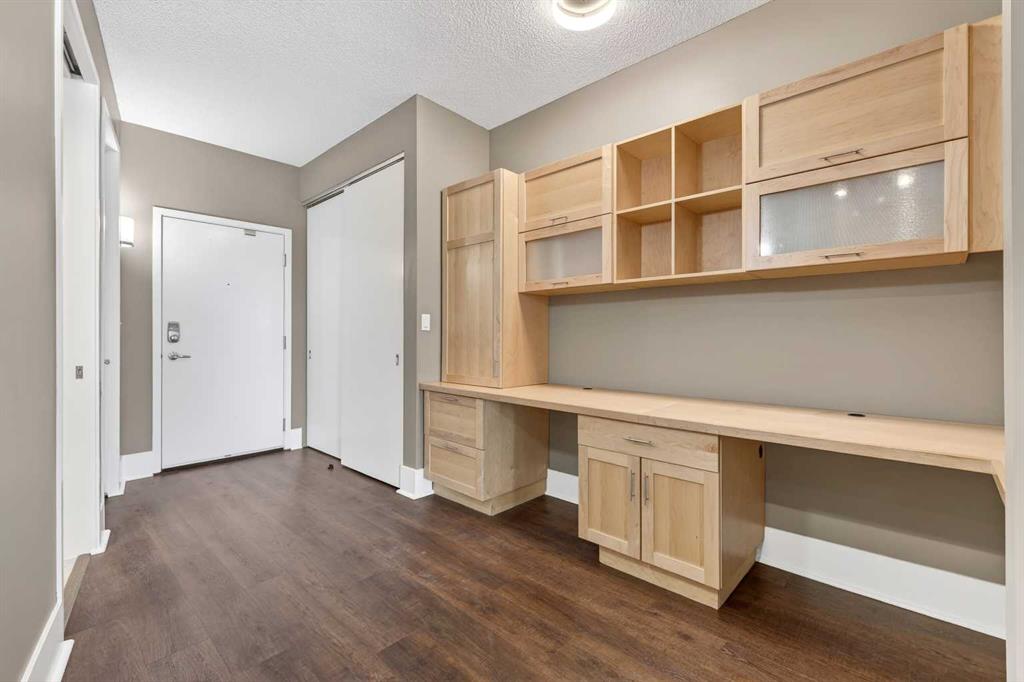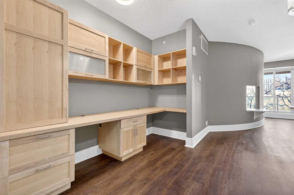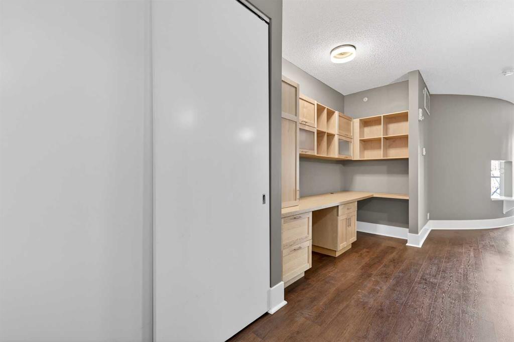 Walk in, drop your bag on the custom built-in desk, and you’re already home. This isn’t 657 square feet of compromise — it’s a downtown condo that actually works. A dedicated office with the built-in already done for you. A walk-in closet off the bedroom. Custom built-ins and a full storage room that turn a one-bedroom footprint into a unit with a real place for everything. And a nearly 18-foot balcony looking out at mature trees.