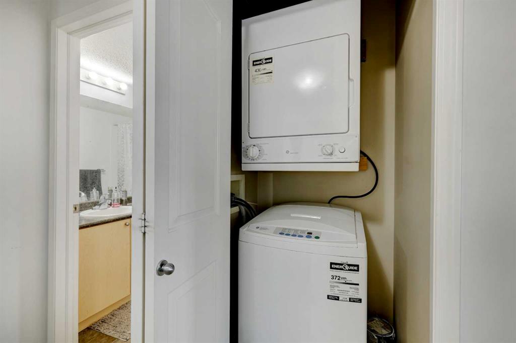 The thoughtfully designed layout places the two bedrooms on opposite sides of the unit, ensuring privacy and functionality. The modern kitchen includes a breakfast bar and a full black appliance package, flowing into the open-concept living and dining area. A walk-through closet in the spacious primary bedroom leads to a private 4-piece ensuite. The versatile den provides the perfect space for a home office or additional storage, while the convenience of in-suite laundry adds to the ease of everyday living.