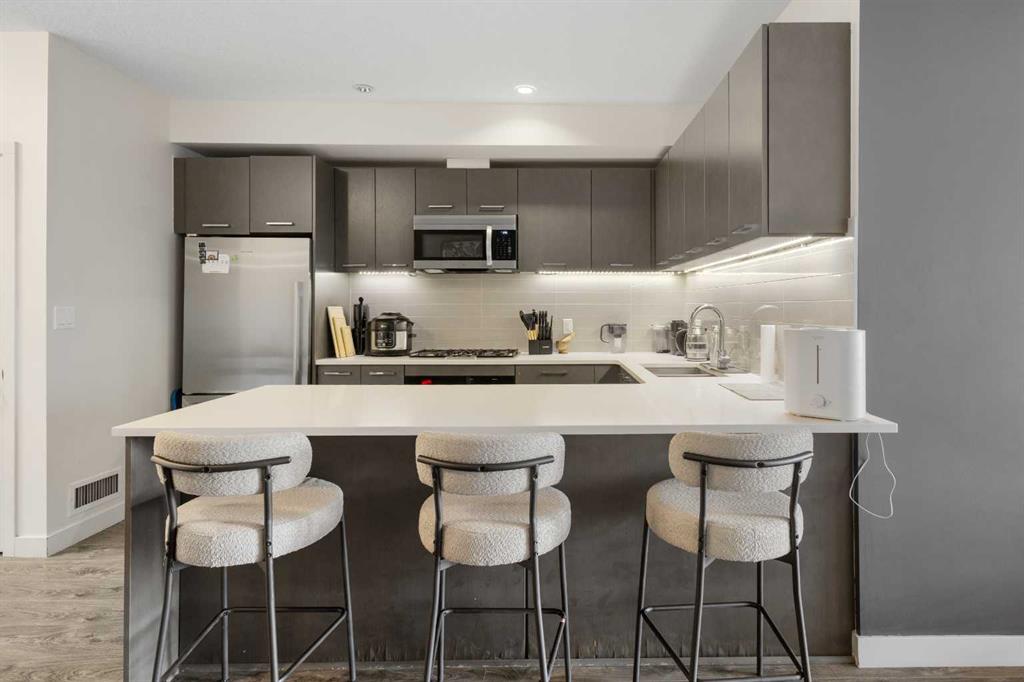 The kitchen impresses with espresso cabinetry, luminous white quartz counters, stainless steel appliances, gas cooktop, and modern under-cabinet lighting. Wide-plank flooring, 9’ ceilings, and a sunny southwest-facing balcony with gas hookup elevate the living experience.