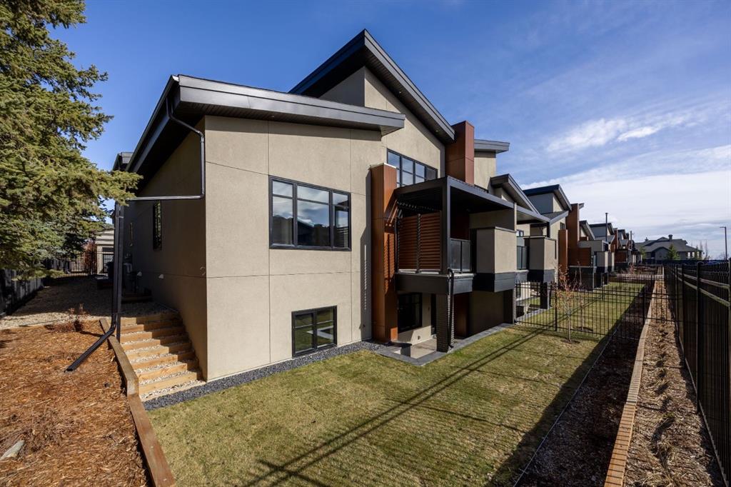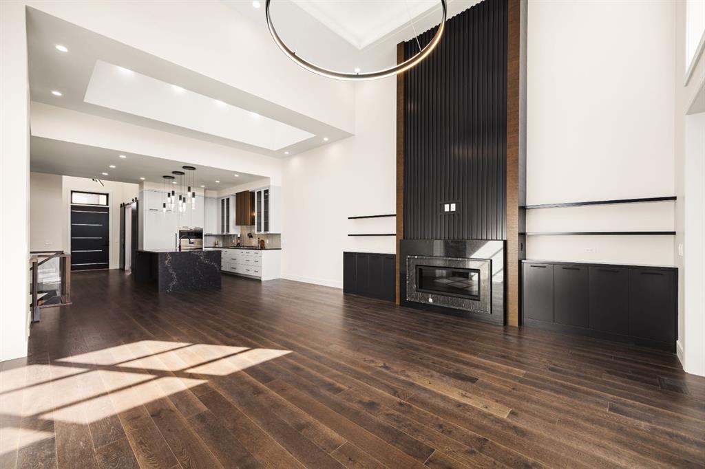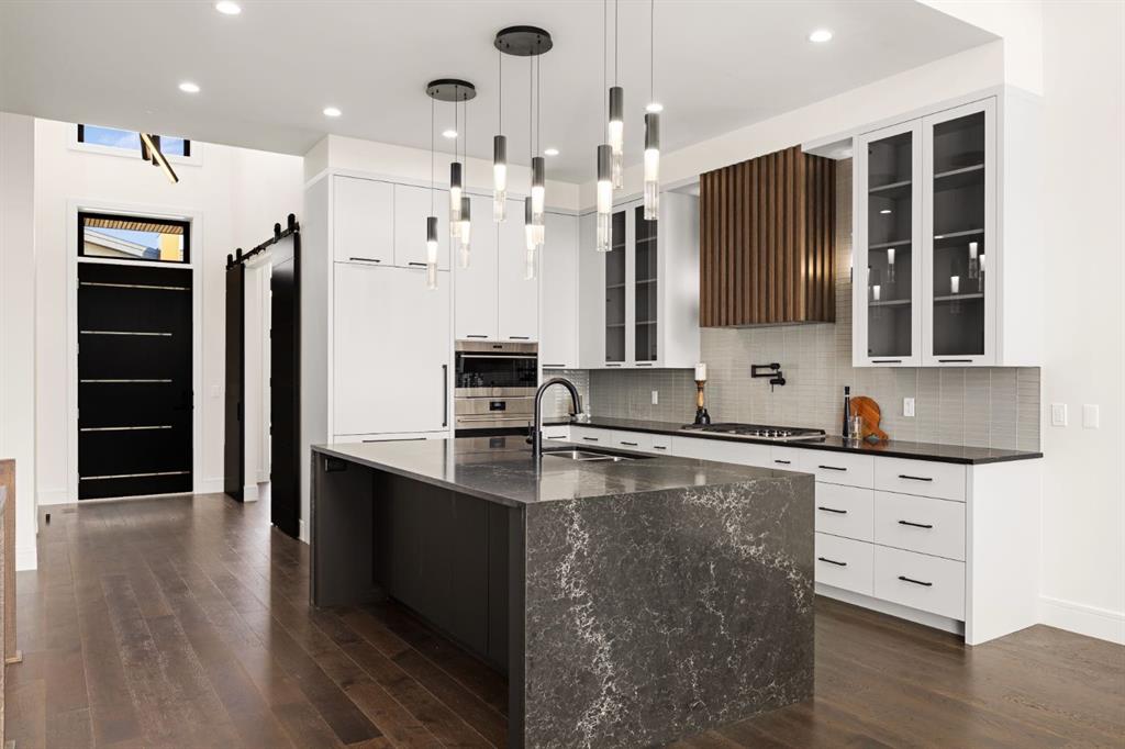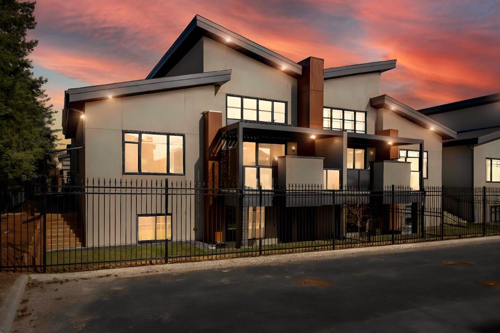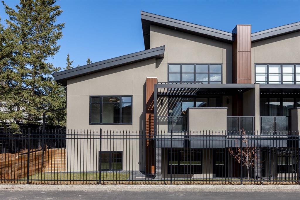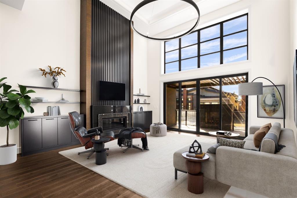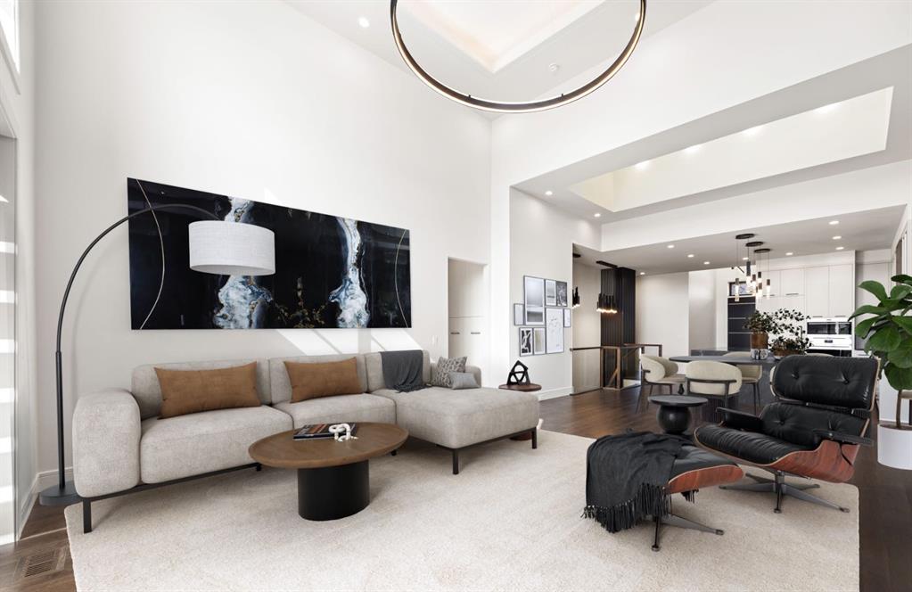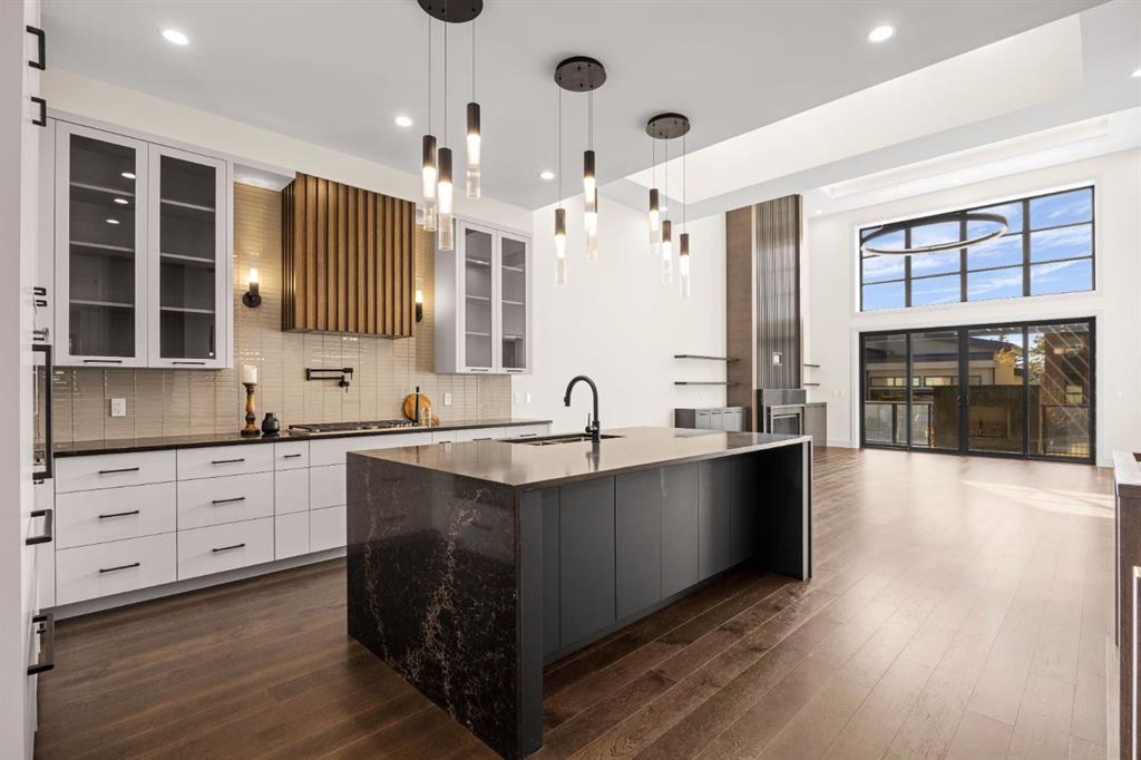 Presenting an opportunity to own a never-lived-in residence in Elveden Court, a prestigious and sold-out community of only 26 bungalow villas on Calgary’s west side. This luxury home represents the pinnacle of “smartsizing,” specifically designed for discerning homeowners who refuse to compromise on quality while seeking the ultimate lock-and-leave lifestyle. Whether you are spending your winters south or your weekends in the mountains, this home offers the peace of mind and maintenance-free ease you’ve been looking for without sacrificing bespoke finishes and premium construction. The interior is a masterclass in modern elegance, defined by a high-contrast palette where dark elements meet crisp gallery walls and gleaming floors. The open-concept main level features soaring ceilings, multiple skylights, and expansive windows that flood the space with natural light. A custom fireplace surround reaching the 16’ ceilings anchors the great room creating a chic focal point in the home, while large doors transition seamlessly to a west-facing patio. This outdoor oasis extends the living space and is elevated by a built-in gas fireplace and a remote-controlled louvred pergola, allowing customized sun exposure or protection from the elements while entertaining. The kitchen is a flawless blend of style and utility, featuring premium, integrated Wolf and Sub-Zero appliances, custom cabinetry, plenty of counter space and a commanding island wrapped in deep, inky quartz that provides a sophisticated contrast to the light cabinetry. The main floor continues to impress with a primary suite that serves as a true sanctuary, boasting a walk-in dressing room and a spa-inspired ensuite with in-floor heat, dual vanities, a sizeable shower and a freestanding soaker tub. A private den with sleek barn door access, a mood-filled powder room featuring bold designer wallpaper and a statement pendant light, and a well-appointed laundry room complete the main level, ensuring all your daily essentials are accessible on one floor. The fully developed lower level, with nine-foot ceilings and a second fireplace, is engineered for lifestyle flexibility and hosting. A generous recreation area features a designer wet bar with custom glossy millwork and dual refrigeration, while two additional bedrooms provide ideal accommodations for guests or teens. A flex room offers the perfect footprint for a home gym or hobby space. The spacious lower patio leads directly to the fenced, private west facing yard. The oversized double garage boasts a heated slab, transom windows and ceiling height to accommodate a car lift. Built to an exceptional standard with full Insulated Concrete Form (ICF) construction to the soffit line and triple-glazed windows, this home offers superior sound attenuation and thermal efficiency. Located just minutes from Aspen Landing and the Rocky Mountains, this villa offers an unparalleled blend of privacy and convenience for the next chapter of your life.