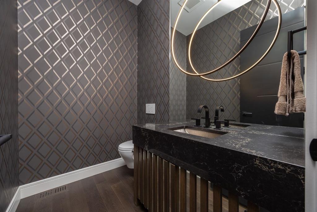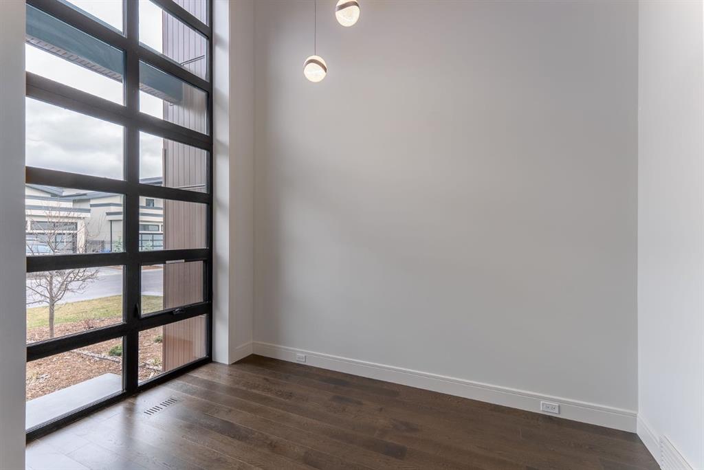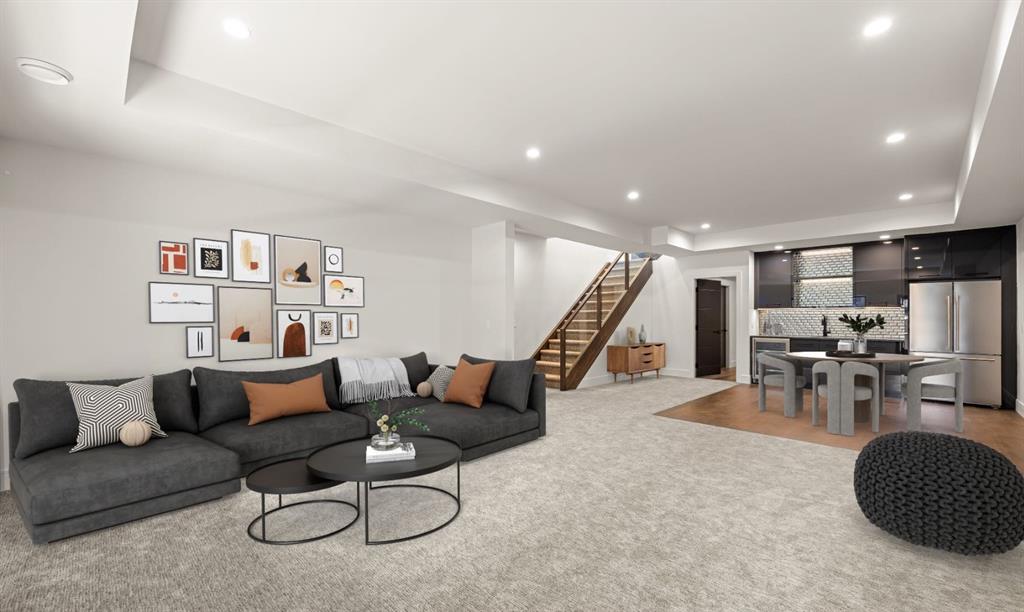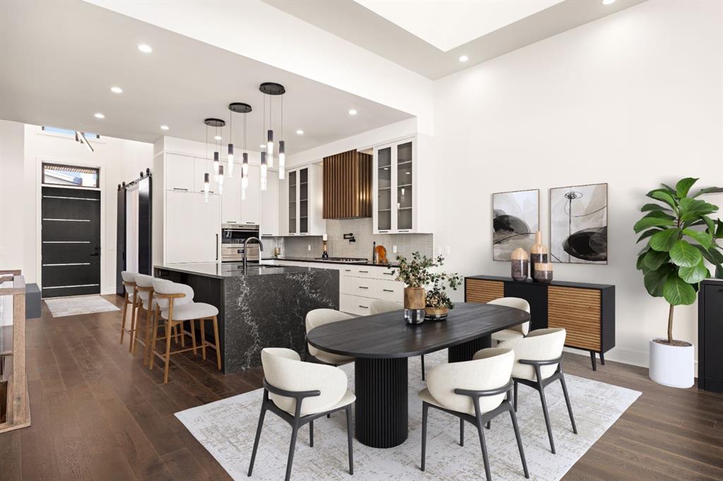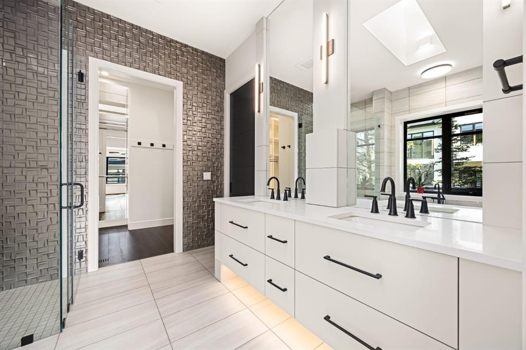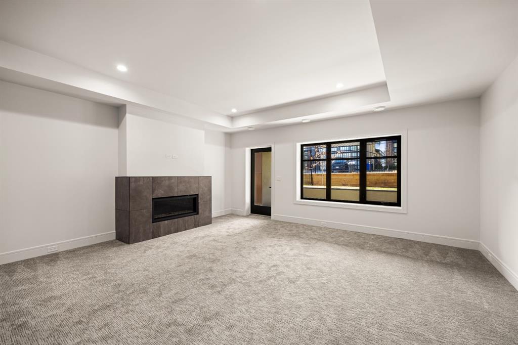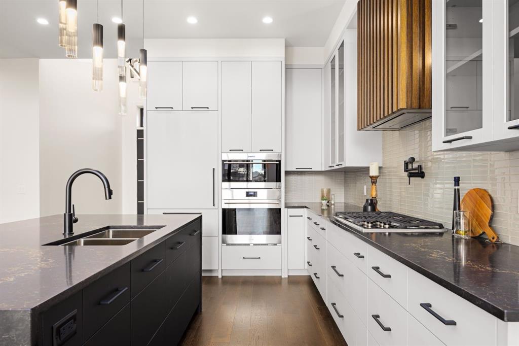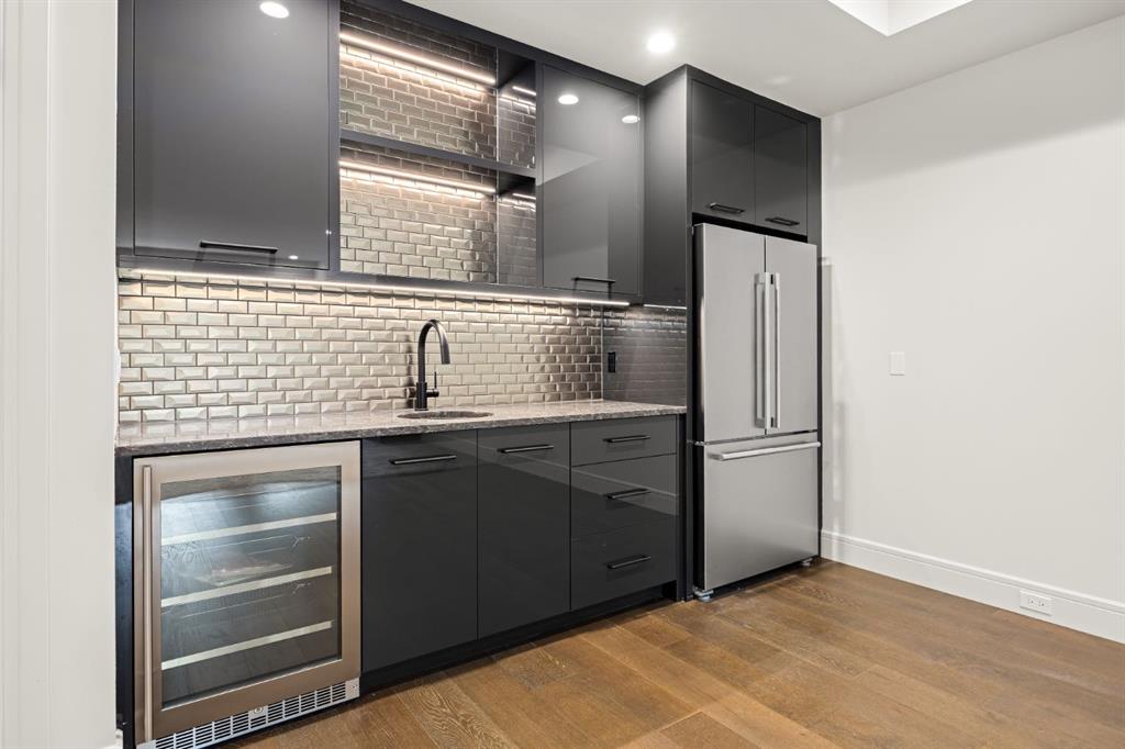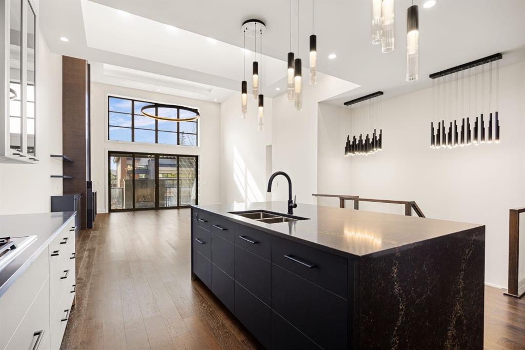 Presenting an opportunity to own a never-lived-in residence in Elveden Court, a prestigious and sold-out community of only 26 bungalow villas on Calgary’s west side. This luxury home represents the pinnacle of “smartsizing,” specifically designed for discerning homeowners who refuse to compromise on quality while seeking the ultimate lock-and-leave lifestyle. Whether you are spending your winters south or your weekends in the mountains, this home offers the peace of mind and maintenance-free ease you’ve been looking for without sacrificing bespoke finishes and premium construction. The interior is a masterclass in modern elegance, defined by a high-contrast palette where dark elements meet crisp gallery walls and gleaming floors. The open-concept main level features soaring ceilings, multiple skylights, and expansive windows that flood the space with natural light. A custom fireplace surround reaching the 16’ ceilings anchors the great room creating a chic focal point in the home, while large doors transition seamlessly to a west-facing patio. This outdoor oasis extends the living space and is elevated by a built-in gas fireplace and a remote-controlled louvred pergola, allowing customized sun exposure or protection from the elements while entertaining. The kitchen is a flawless blend of style and utility, featuring premium, integrated Wolf and Sub-Zero appliances, custom cabinetry, plenty of counter space and a commanding island wrapped in deep, inky quartz that provides a sophisticated contrast to the light cabinetry. The main floor continues to impress with a primary suite that serves as a true sanctuary, boasting a walk-in dressing room and a spa-inspired ensuite with in-floor heat, dual vanities, a sizeable shower and a freestanding soaker tub. A private den with sleek barn door access, a mood-filled powder room featuring bold designer wallpaper and a statement pendant light, and a well-appointed laundry room complete the main level, ensuring all your daily essentials are accessible on one floor. The fully developed lower level, with nine-foot ceilings and a second fireplace, is engineered for lifestyle flexibility and hosting. A generous recreation area features a designer wet bar with custom glossy millwork and dual refrigeration, while two additional bedrooms provide ideal accommodations for guests or teens. A flex room offers the perfect footprint for a home gym or hobby space. The spacious lower patio leads directly to the fenced, private west facing yard. The oversized double garage boasts a heated slab, transom windows and ceiling height to accommodate a car lift. Built to an exceptional standard with full Insulated Concrete Form (ICF) construction to the soffit line and triple-glazed windows, this home offers superior sound attenuation and thermal efficiency. Located just minutes from Aspen Landing and the Rocky Mountains, this villa offers an unparalleled blend of privacy and convenience for the next chapter of your life.