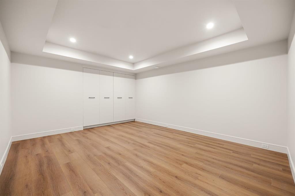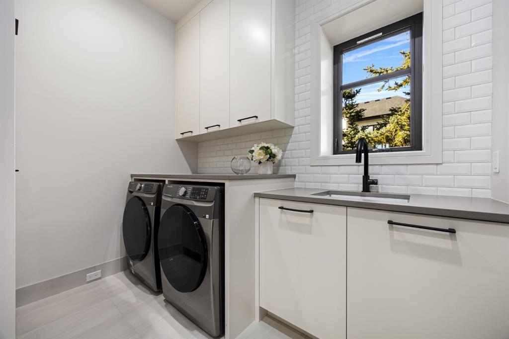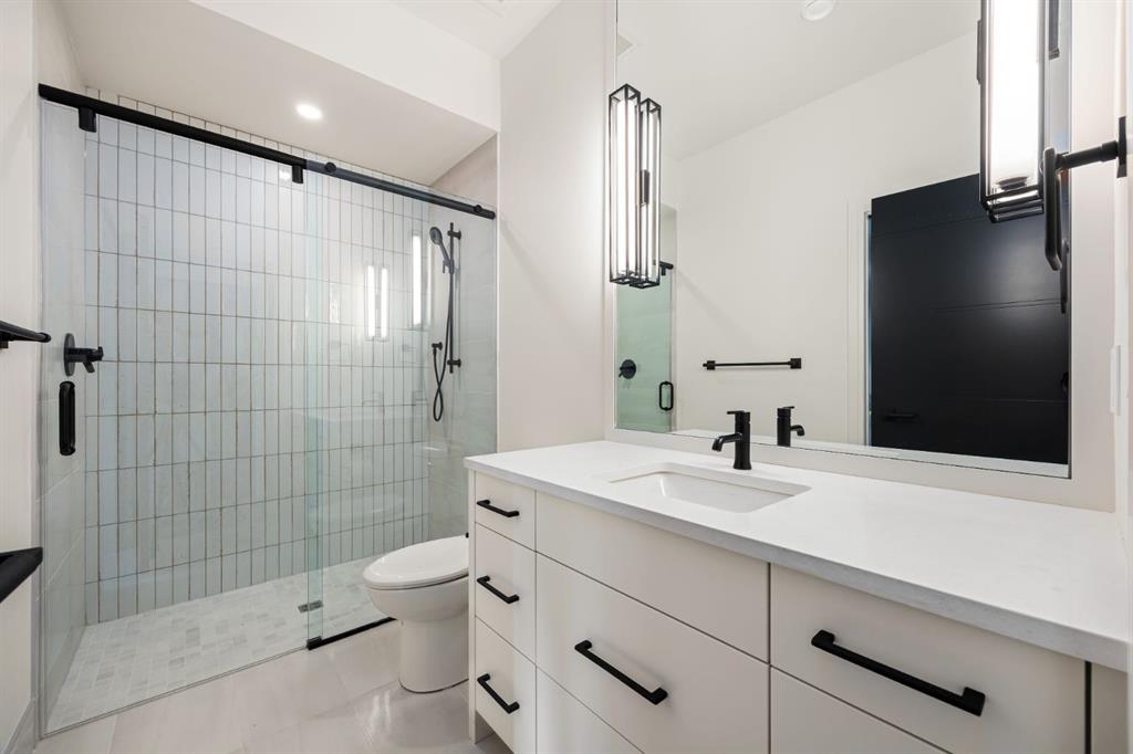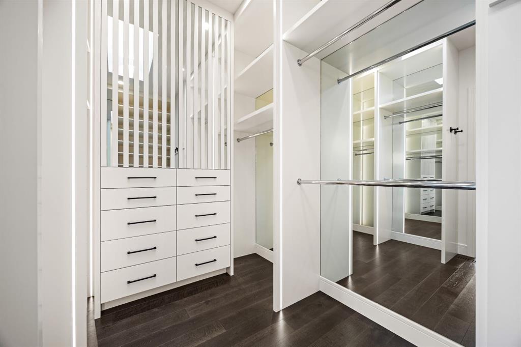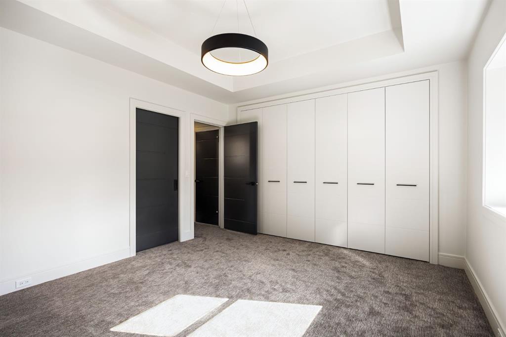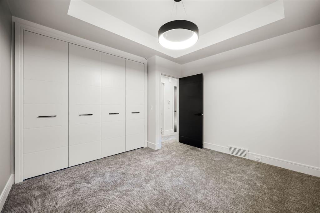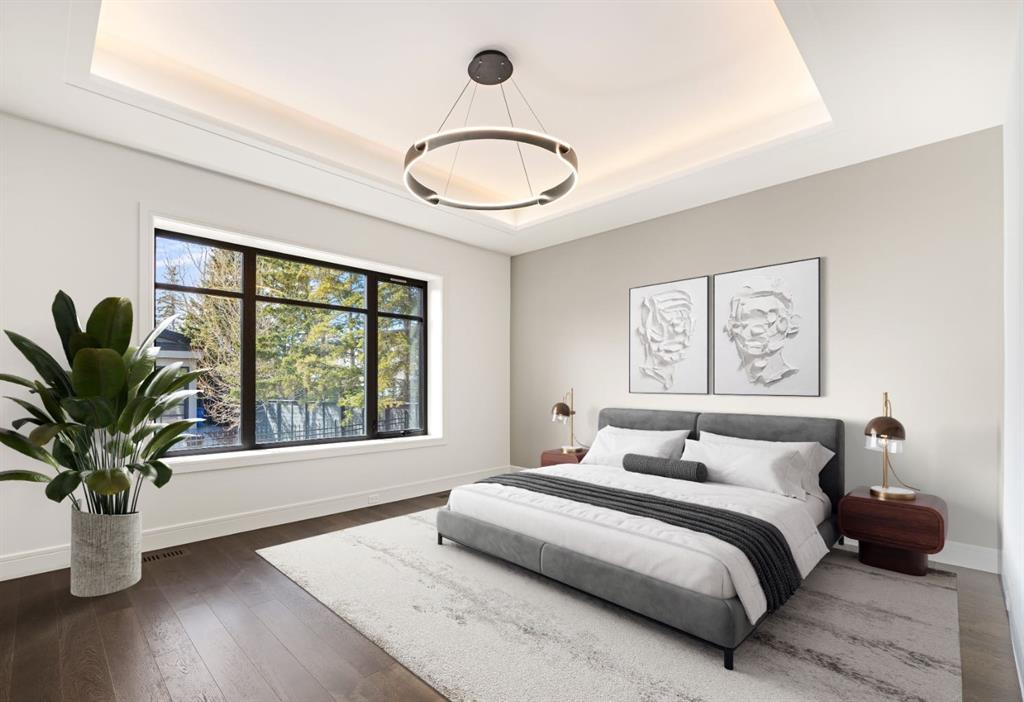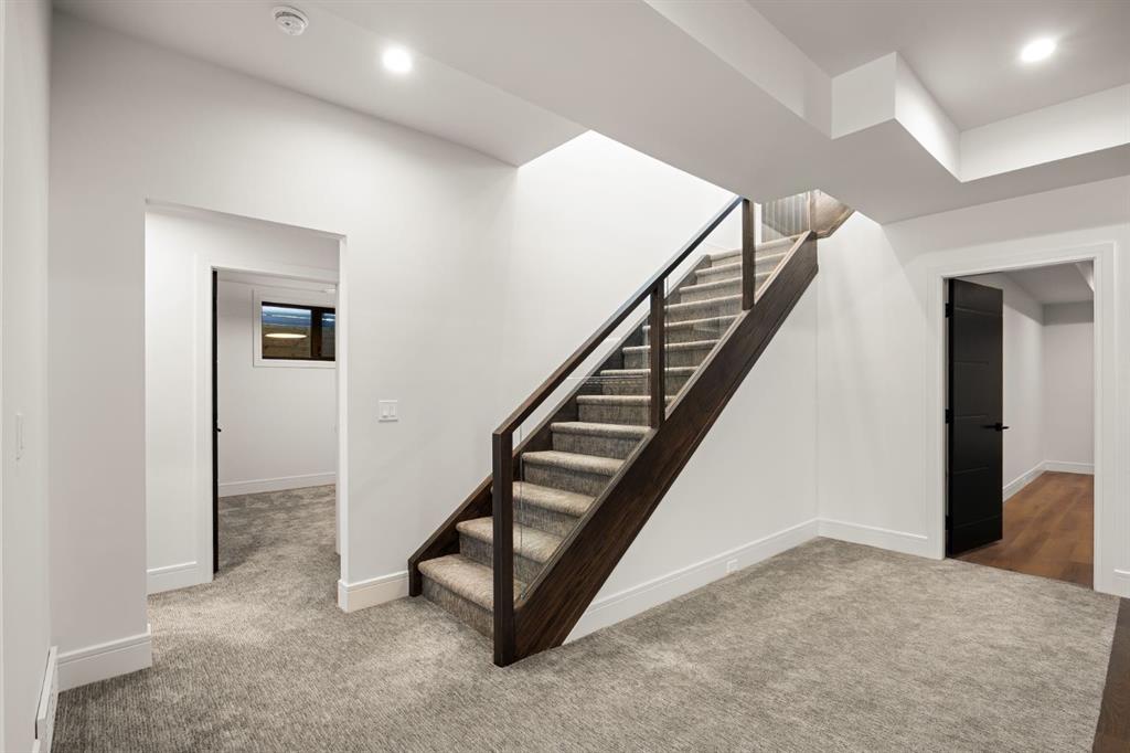 Presenting an opportunity to own a never-lived-in residence in Elveden Court, a prestigious and sold-out community of only 26 bungalow villas on Calgary’s west side. This luxury home represents the pinnacle of “smartsizing,” specifically designed for discerning homeowners who refuse to compromise on quality while seeking the ultimate lock-and-leave lifestyle. Whether you are spending your winters south or your weekends in the mountains, this home offers the peace of mind and maintenance-free ease you’ve been looking for without sacrificing bespoke finishes and premium construction. The interior is a masterclass in modern elegance, defined by a high-contrast palette where dark elements meet crisp gallery walls and gleaming floors. The open-concept main level features soaring ceilings, multiple skylights, and expansive windows that flood the space with natural light. A custom fireplace surround reaching the 16’ ceilings anchors the great room creating a chic focal point in the home, while large doors transition seamlessly to a west-facing patio. This outdoor oasis extends the living space and is elevated by a built-in gas fireplace and a remote-controlled louvred pergola, allowing customized sun exposure or protection from the elements while entertaining. The kitchen is a flawless blend of style and utility, featuring premium, integrated Wolf and Sub-Zero appliances, custom cabinetry, plenty of counter space and a commanding island wrapped in deep, inky quartz that provides a sophisticated contrast to the light cabinetry. The main floor continues to impress with a primary suite that serves as a true sanctuary, boasting a walk-in dressing room and a spa-inspired ensuite with in-floor heat, dual vanities, a sizeable shower and a freestanding soaker tub. A private den with sleek barn door access, a mood-filled powder room featuring bold designer wallpaper and a statement pendant light, and a well-appointed laundry room complete the main level, ensuring all your daily essentials are accessible on one floor. The fully developed lower level, with nine-foot ceilings and a second fireplace, is engineered for lifestyle flexibility and hosting. A generous recreation area features a designer wet bar with custom glossy millwork and dual refrigeration, while two additional bedrooms provide ideal accommodations for guests or teens. A flex room offers the perfect footprint for a home gym or hobby space. The spacious lower patio leads directly to the fenced, private west facing yard. The oversized double garage boasts a heated slab, transom windows and ceiling height to accommodate a car lift. Built to an exceptional standard with full Insulated Concrete Form (ICF) construction to the soffit line and triple-glazed windows, this home offers superior sound attenuation and thermal efficiency. Located just minutes from Aspen Landing and the Rocky Mountains, this villa offers an unparalleled blend of privacy and convenience for the next chapter of your life.