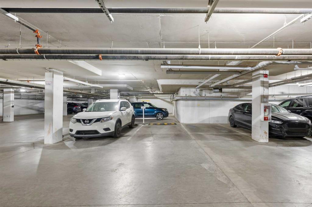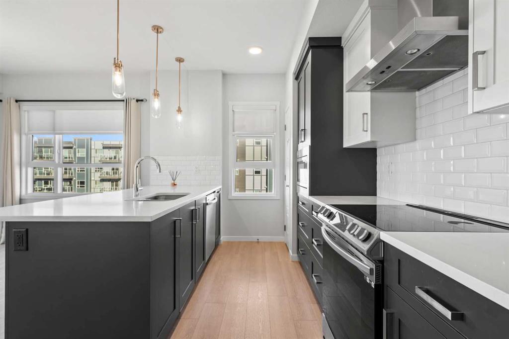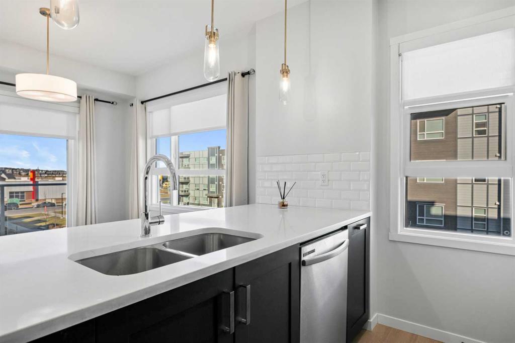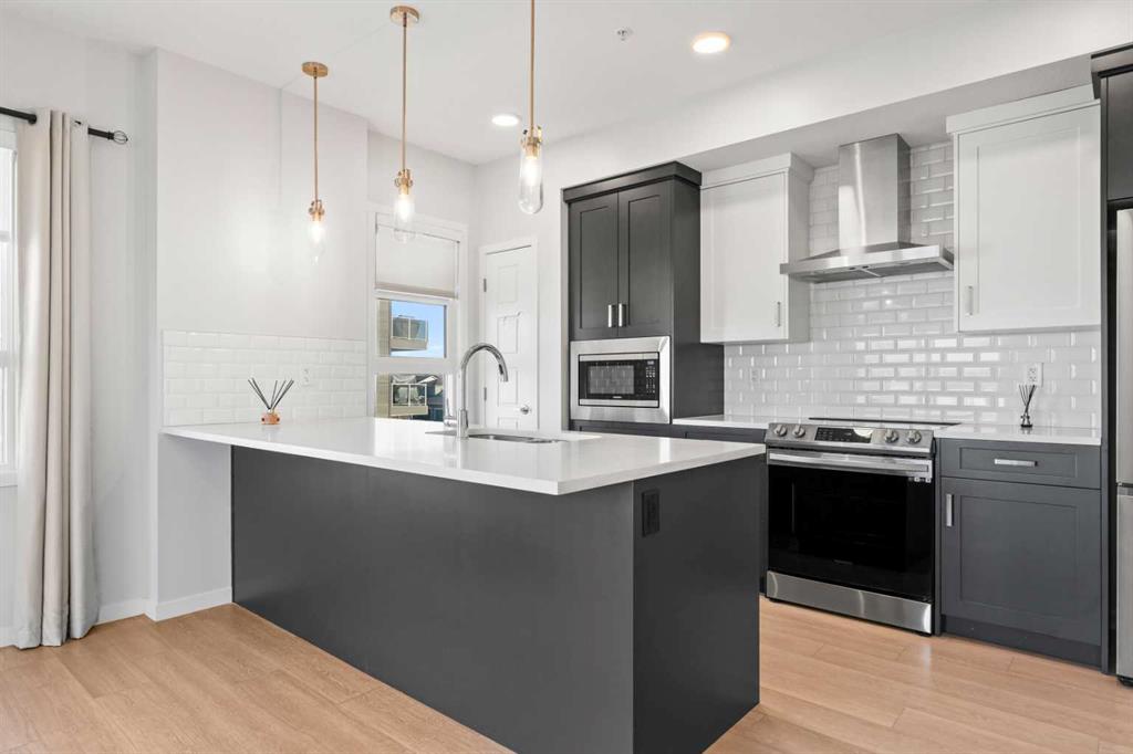 You will feel right at home in this newer condo built by Cedarglen Living Inc. Offering 965.24 sq.ft. RMS (1,043 sq.ft. builder size), this 2 bed, 2 bath unit features an open-concept layout that blends style and functionality with ease. From the moment you step inside, you’ll notice the 9 ft ceilings, luxury vinyl plank flooring throughout (NO CARPET), and Low E triple pane windows that enhance comfort and energy efficiency. The expansive kitchen is beautifully appointed with full-height cabinetry, quartz countertops, upgraded pull-out recycling centre, upgraded bank of pot and pan drawers, white subway tile backsplash, corner pantry, and stainless steel appliances: including an upgraded slide-in electric range, chimney hood fan, and built-in microwave. The island with seating overlooks the spacious living room, creating an inviting space for entertaining or cozy movie nights. The two bedrooms are thoughtfully positioned on opposite sides of the home for maximum privacy. The primary suite features its own full ensuite, while the second bedroom has easy access to the main bathroom perfect for guests, roommates, or a home office setup. Air conditioning is included, ensuring comfort year round. A generous laundry and storage room adds everyday convenience. The home also includes one 1 titled underground parking stall and 2x side by side storage lockers, providing ample space for your belongings. Enjoy evenings on the WEST facing balcony, complete with a BBQ gas line. This pet friendly complex is ideally located across from a beautiful park and green space, with a variety of nearby amenities just steps away.