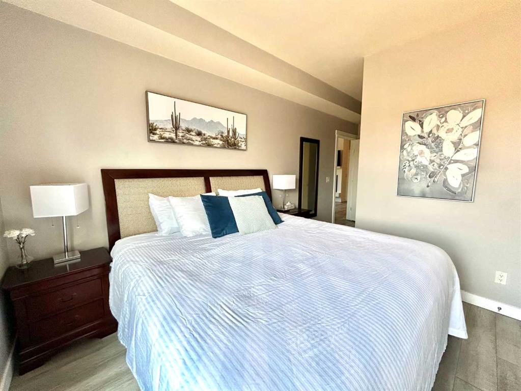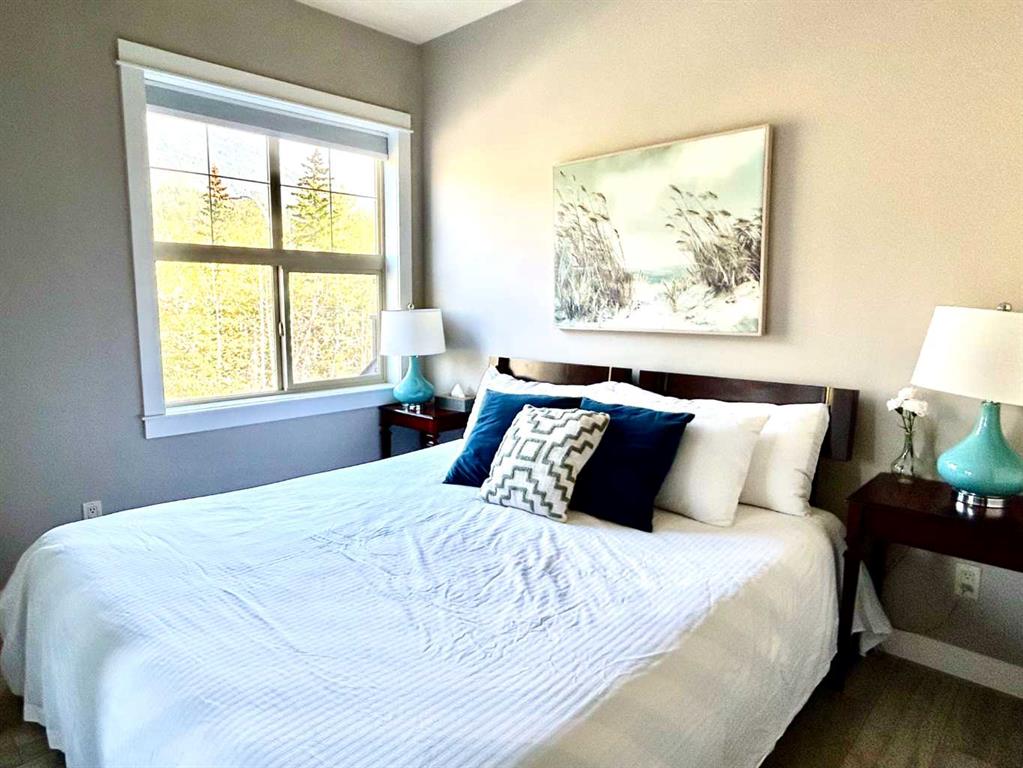 270 Degree Mountain view. Top Floor and end unit, This Hotel Condo zoning, offers you an great investment. This fully furnished 2-bedroom, 2-bathroom condo is designed for comfort and convenience, with an open-concept layout that seamlessly connects the spacious kitchen, and living room. A cozy fireplace creates the ideal setting to relax after a day of exploring the Rockies. Both bedrooms are generously sized, each featuring a king bed, and with the addition of a sofa bed, the property comfortably sleeps up to six guests. Step onto your private south-facing deck to enjoy sweeping views of the iconic mountain peaks, an ideal spot for morning coffee or evening barbecues. Additional highlights include in-suite laundry, ample storage, two outdoor hot tubs, a fitness room, and secure heated underground parking. With its prime location, you’ll be just steps from downtown Canmore’s shops, restaurants, cafes, and trail network, making it easy to enjoy everything this vibrant mountain community has to offer. This is a rare opportunity to own a mountain retreat with both lifestyle and investment benefits.