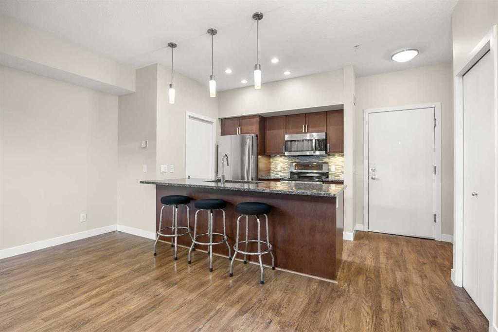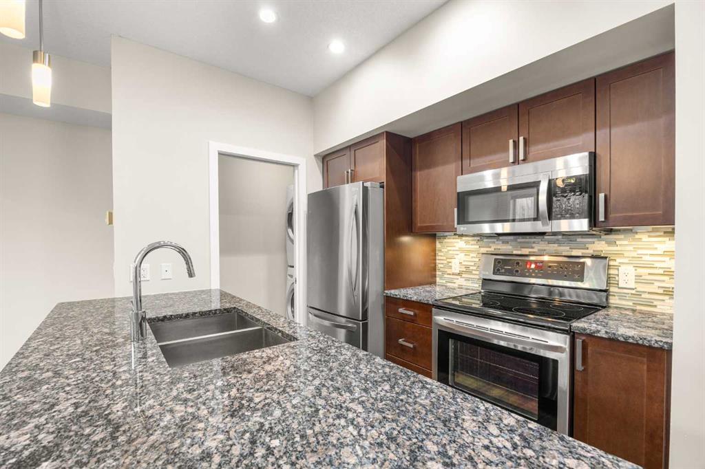 Welcome to this stylish 1 Bedroom Apartment in the established Highland Park community! The unit entrance faces east, with a big window overlooking the park, creating a bright and welcoming corridor as you walk in. Inside, the open-concept layout features 8’10” ceilings and a modern Kitchen with granite countertops, a large Breakfast Bar, and Stainless Steel Appliances, flowing seamlessly into a spacious Living and Dining Area. The Dining Room opens to a Patio with gas hookup—perfect for summer BBQs and relaxing outdoors. The Primary Bedroom offers a Walk-In Closet and a cheater door to the 4-Piece Bathroom with granite countertops. In-Suite Laundry with additional storage next to the Kitchen, plus 1 assigned underground Parking Stall, and one storage unit, complete this practical and comfortable home.