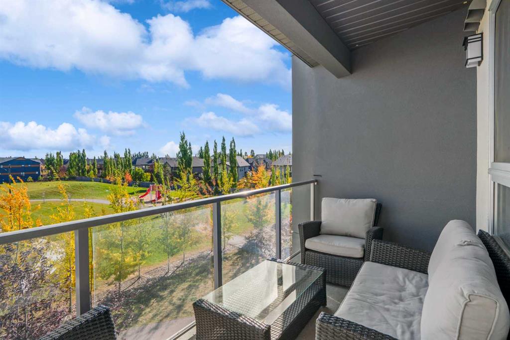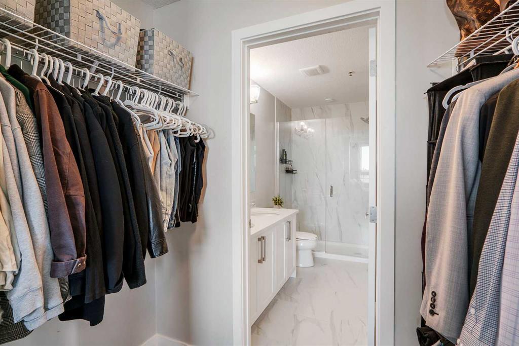 Welcome to Vivace North, where modern design meets effortless everyday living in the heart of West Springs. This beautifully upgraded 2-bedroom, 2-bathroom condo blends style and functionality, creating a home that feels as sophisticated as it is comfortable. The chef-inspired kitchen features sleek stainless steel appliances, full-height white cabinetry, and modern white quartz countertops. The step-down island is both practical and unique, offering bar seating on one side and a built-in dining table on the other, perfect for entertaining or relaxed daily meals. The open-concept living space is warm and inviting, with luxury vinyl plank flooring and large east-facing windows that fill the home with natural light. Step outside onto two private balconies, ideal for morning coffee or evening unwinding. Both bedrooms offer walk-through closets with direct access to bathrooms, while the second room makes a perfect guest bedroom or home office. This unit has NO CARPET and pride of home ownership is evident! Enjoy added convenience with in-suite laundry, a storage locker, bike storage, and tandem double parking stalls. Outside your door, you’re steps away from Mercato West, Vin Room, Blanco, Fergus & Bix, Una Pizza, and more, plus grocery stores, boutique shops, and top-rated schools. Downtown is only 15 minutes away, and the mountains are within easy reach for your next weekend escape. Perfect for investors, first-time buyers, or downsizers, this home at Vivace North combines modern comfort, unbeatable convenience, and the vibrant energy of Calgary’s west end.