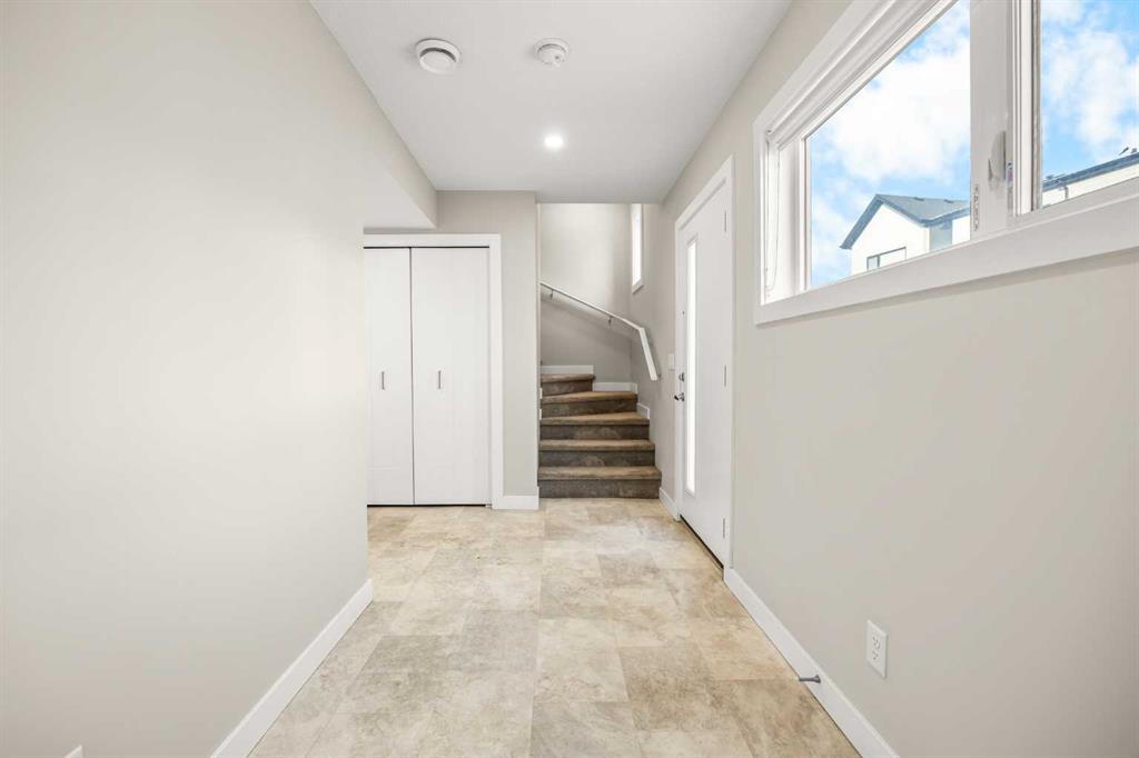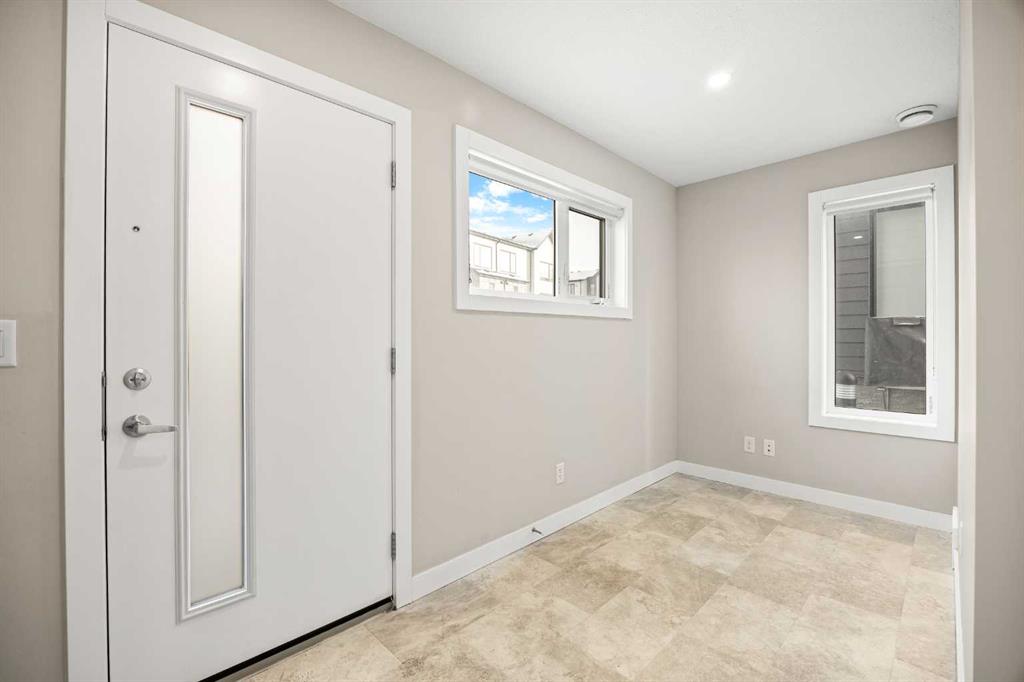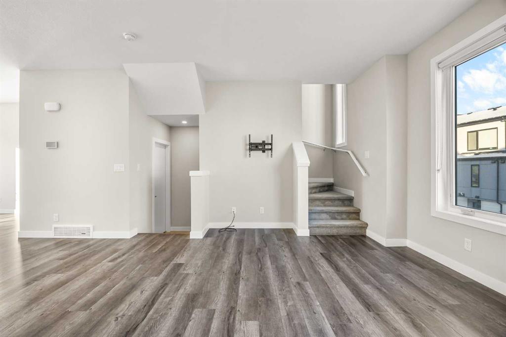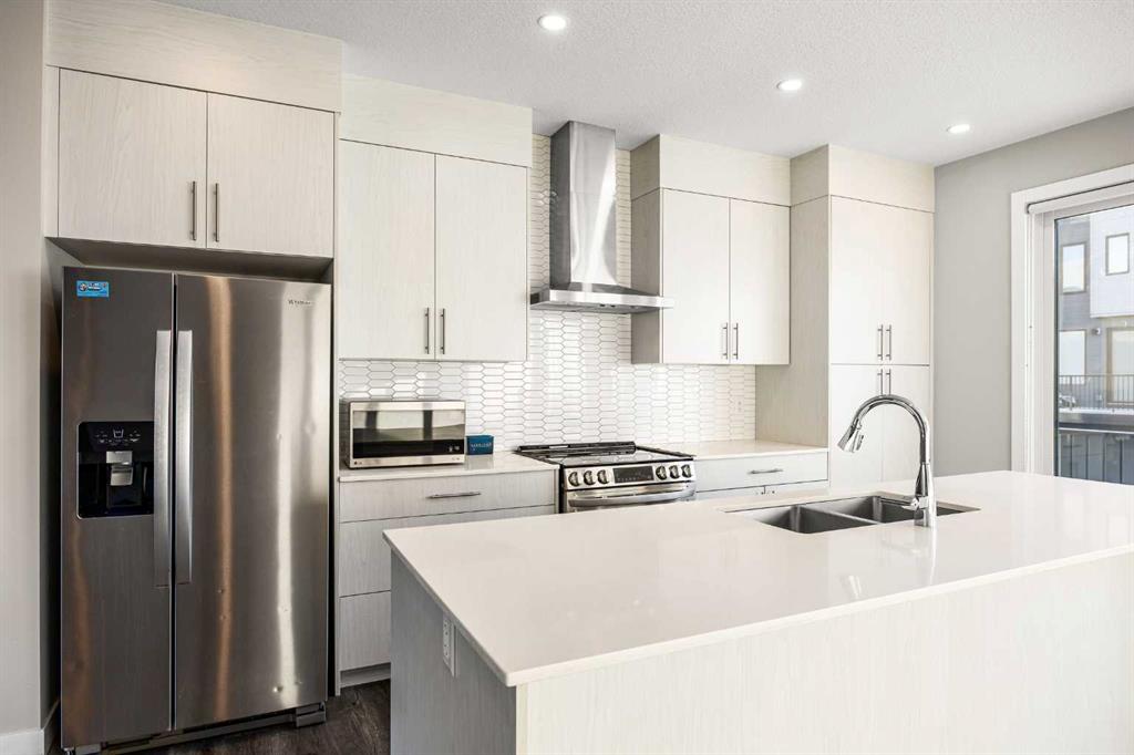 **OPEN HOUSE this SUN, Feb 1st at 2-4PM** Located in the family-friendly community of Evanston, just minutes from schools, parks, shopping, and dining, this 3-Bedroom, 2.5-Bath, 1,500 sq.ft. End unit townhouse offers a perfect blend of space, function, and modern living. The main floor features a spacious open-concept layout with 9-ft ceilings, starting with a bright east-facing Living Room that fills the space with natural light. The Kitchen is highlighted by a large center island, quartz countertops, and stainless-steel appliances including a new stove, flowing seamlessly into the Dining area, which leads to the expansive balcony with gas hookup, perfect for BBQs and outdoor entertaining. A convenient 2-Piece Bath completes this level.