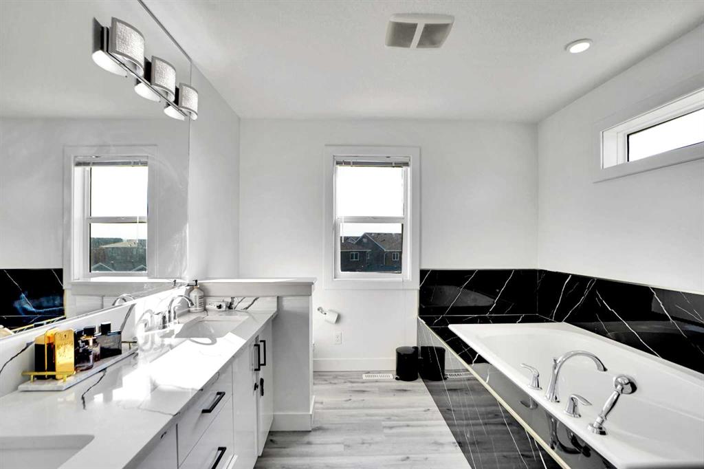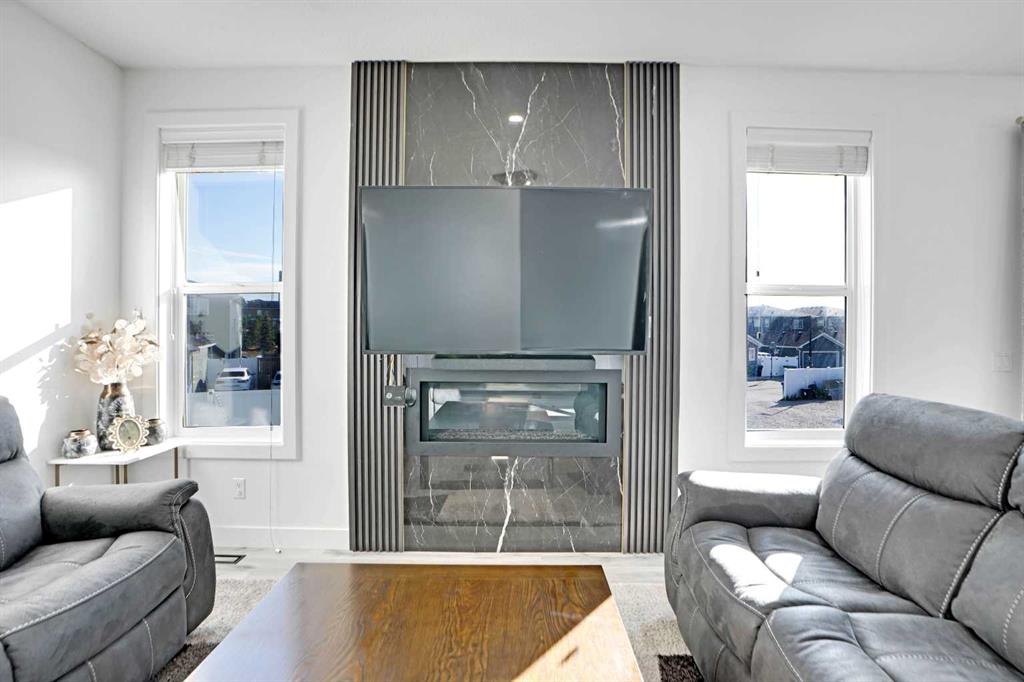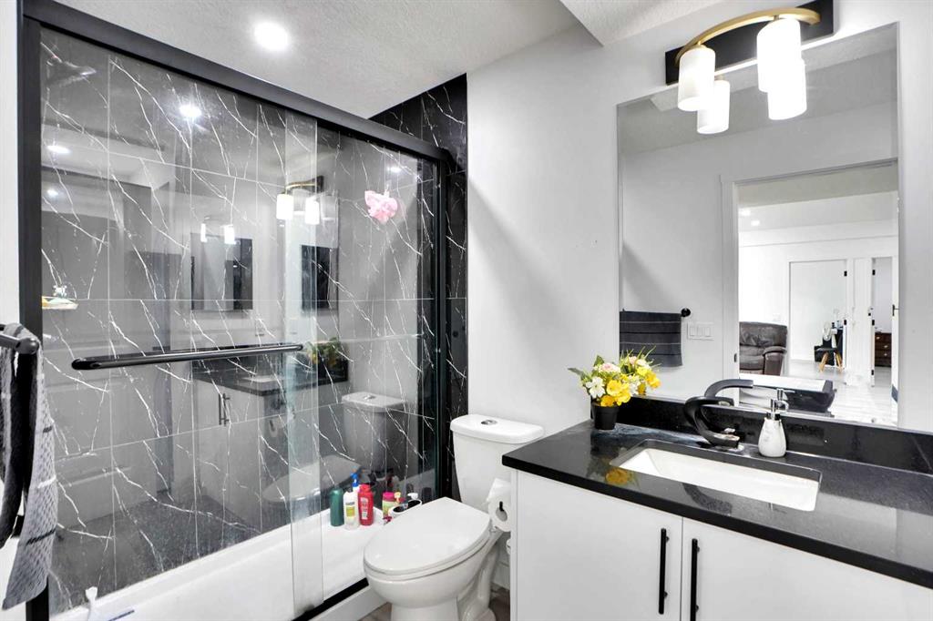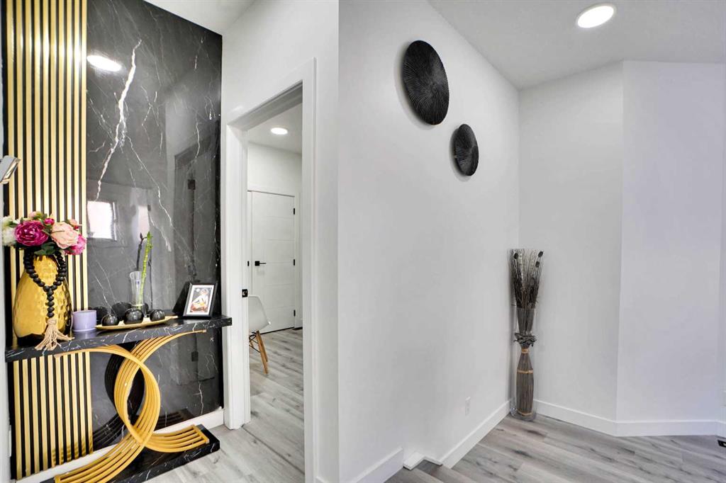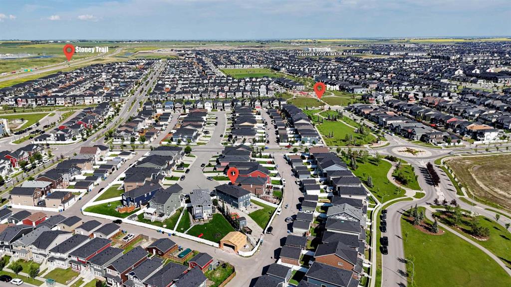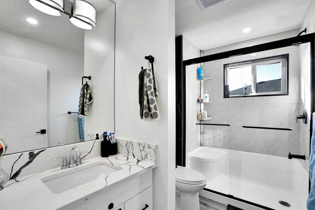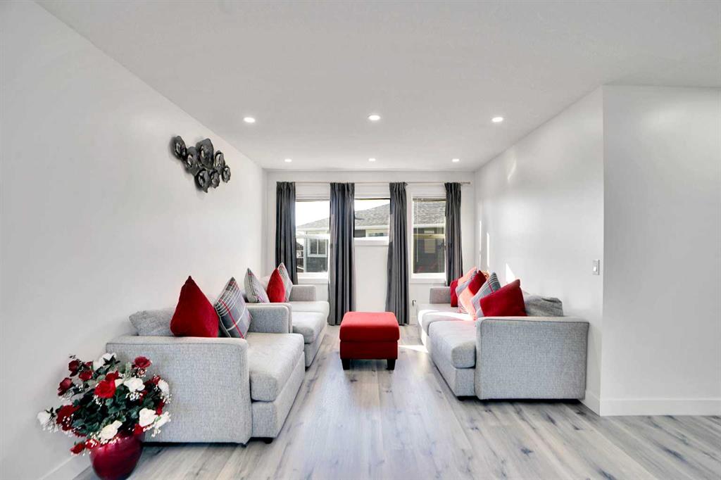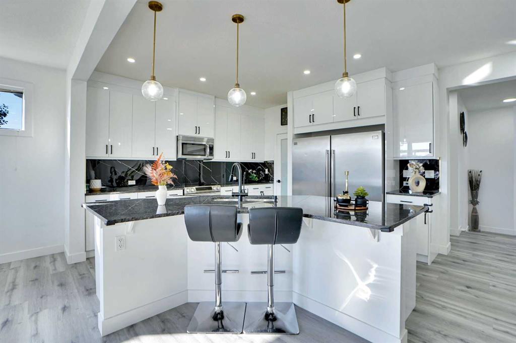 A Rare Opportunity on One of Redstone’s Largest Pie-Shaped Lots! This fully renovated detached home offers over 2,450 SQFT. of thoughtfully designed living space, with a front-attached garage, rear street access, ample street parking, and City-approved commercial parking—ideal for home-based businesses or extra vehicles. Inside, you’re welcomed by a spacious foyer, a custom feature wall, home office, and mudroom. The main kitchen boasts granite countertops, high-end finishes, and opens to a large living room with a gas fireplace and feature wall. A separate spice kitchen with its own pantry adds convenience. Upstairs, enjoy a bright bonus room, a luxurious primary suite with a 5-piece ensuite and custom walk-in closet, plus three additional bedrooms, a full bath with standing shower, and upstairs laundry. The fully finished basement suite (illegal) with separate side entrance includes two generous bedrooms, a modern kitchen with pantry, a full bathroom, and stacked laundry. Set on one of the largest lots in the community with unique dual access and commercial-use potential, this home is truly a rare opportunity in Redstone. Don’t miss your chance to own this exceptional property!