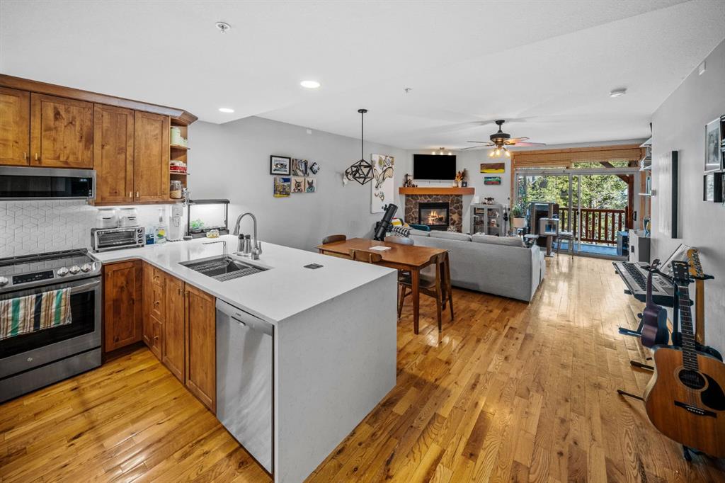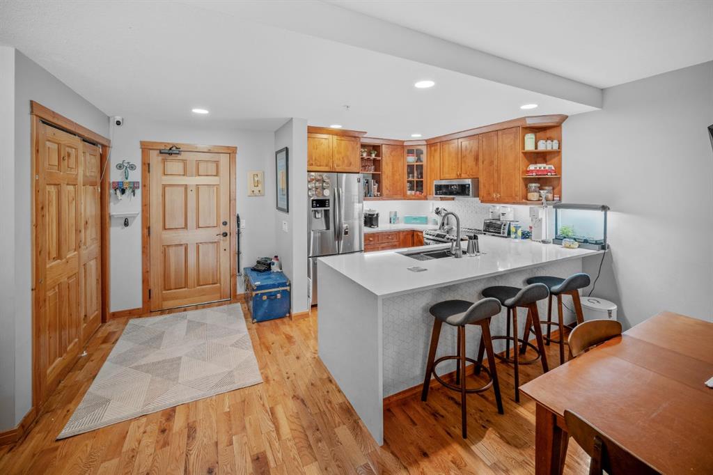 Located in the sought-after Trailside Lodge in Three Sisters Mountain Village, this beautifully updated one-bedroom plus den residence offers the perfect balance of mountain lifestyle and modern comfort. Spanning 1,005 sqft, the home enjoys a bright, open layout with a sunny south-facing deck overlooking the private owners’ clubhouse. Inside, thoughtful updates elevate the space — from refreshed finishes to upcoming refinished flooring scheduled for this fall. The spacious kitchen and living area flow seamlessly to the deck, inviting you to enjoy morning coffee or unwind after a day on the trails. The den provides flexible space for guests or a home office, while two full bathrooms offer convenience and privacy for owners and visitors alike. Residents enjoy exclusive access to the clubhouse amenities, including an indoor pool, hot tub, gym, movie room, and lounge — creating a true resort-style experience year-round. Whether you’re seeking a full-time residence, weekend escape, or investment in Canmore’s most desirable alpine community, this home embodies comfort, convenience, and connection to the mountains.
