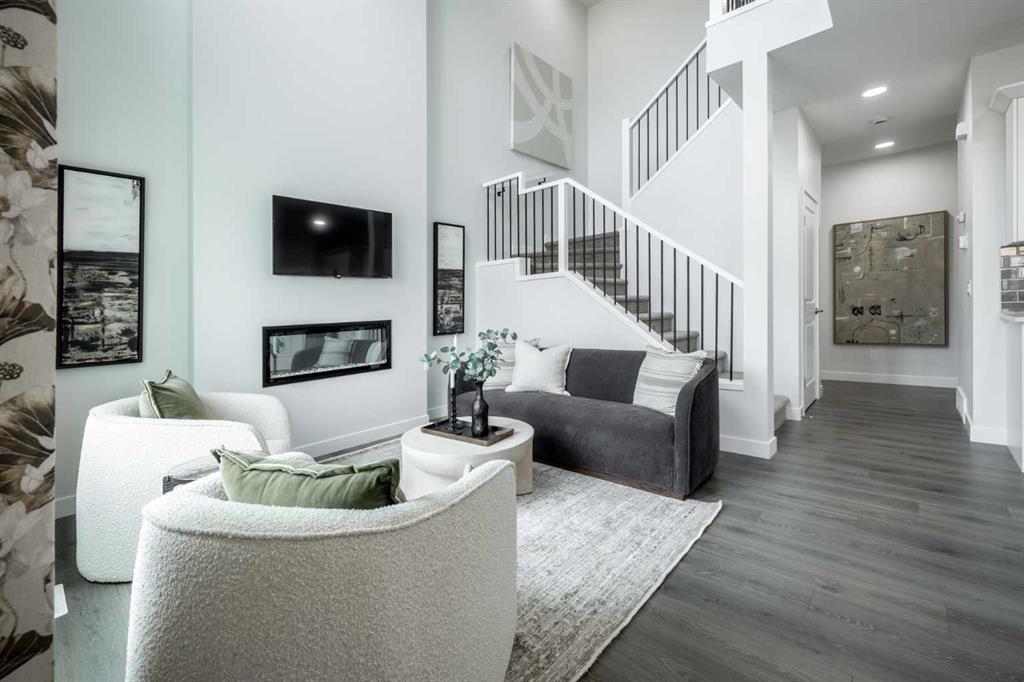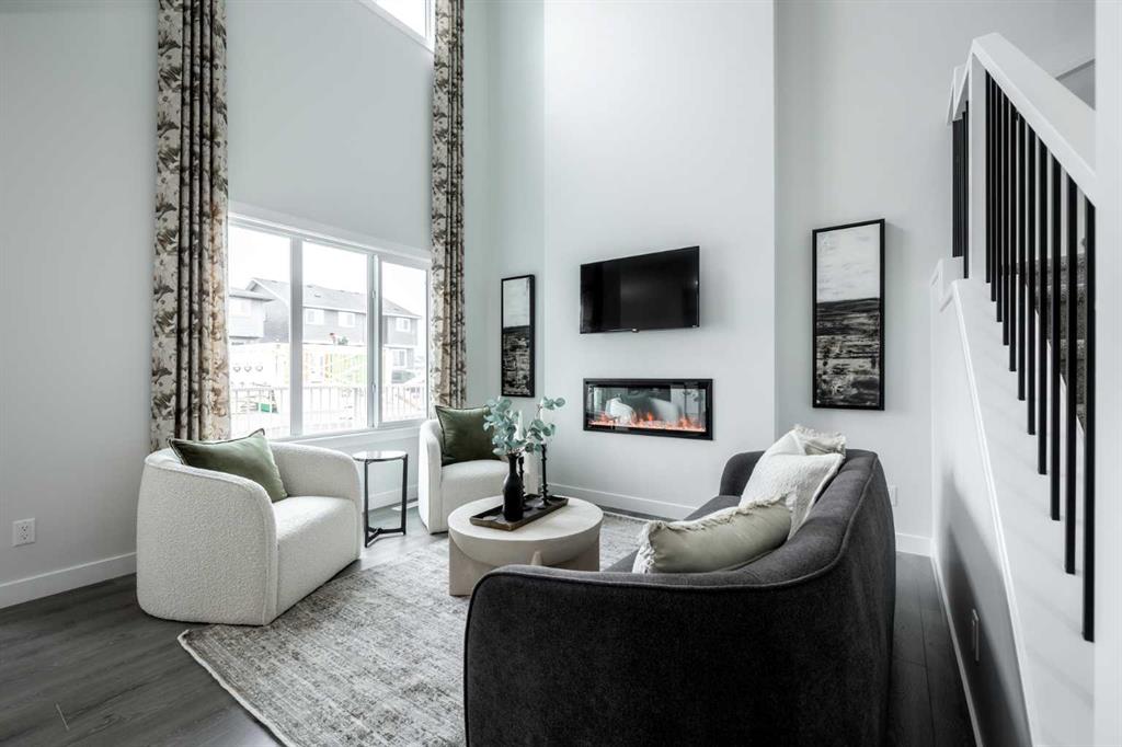 Designed with families in mind, the home features 3 bedrooms and 2.5 bathrooms, including a spacious primary retreat with a large walk-in closet and a spa-inspired 5-piece ensuite complete with double vanity, soaker tub, and separate shower. The main floor is bright and welcoming with 9’ ceilings, quartz countertops throughout, a dedicated den/home office, and a stylish electric fireplace that anchors the living space.