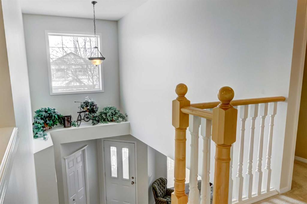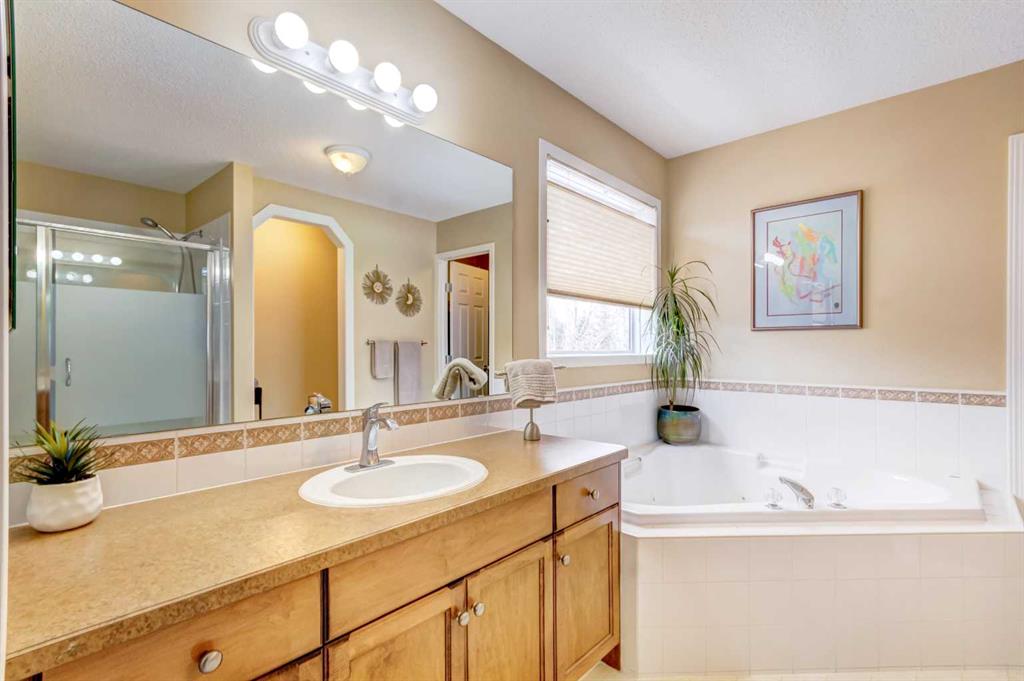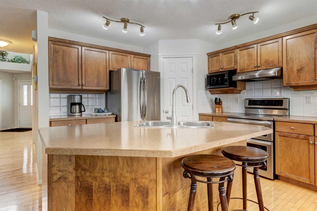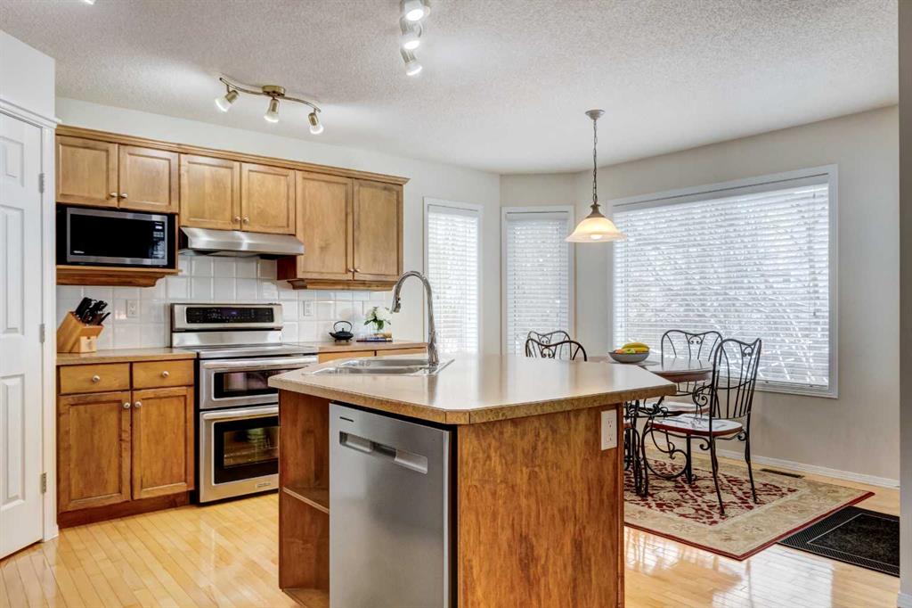 RARE O/S triple car garage | West backyard | Steps to Fish Creek Park. Original Owners. Pride of ownership is evident in this well-maintained home in desirable McKenzie Lake, offering 3 bedrooms plus a main floor den and a bright, functional layout. The front living room and dining room provide an ideal space for hosting family gatherings and entertaining guests. Toward the back of the home, the kitchen offers plenty of maple cabinetry which is carried into all bathrooms as well, upgraded S/S appliances, an island with seating, and a cozy dining nook, all open to the comfortable family room with a gas fireplace—perfect for everyday living and relaxing evenings. The main level also features hardwood flooring and has been freshly painted. Upstairs you will find three generously sized bedrooms along with the convenience of second-floor laundry. The spacious primary bedroom easily accommodates a king-size bed and includes a large ensuite and Walk/in closet. The two additional bedrooms are also well sized, each comfortably fitting queen beds, and share a 4-piece main bathroom. The unspoiled basement is unique with 5 oversized windows offering excellent potential for future development. Step outside to the private west-facing backyard, which includes a large shed, mature trees and a rear deck, ideal for enjoying afternoon and evening sun. The home is located beside a walkway with quick access to the ridge at Fish Creek Park and is close to schools, parks, and everyday amenities. Additional highlights include high-efficiency modulating furnace(2018), 50 gallon HW tank (2019), central A/C(2018), H20 softener(2022), newer taps/toilets (2014), Vacuflo system and NO Poly-B plumbing. A fantastic opportunity in a sought-after community.
