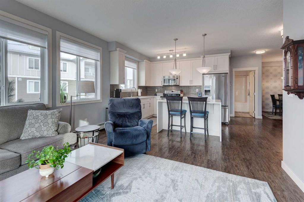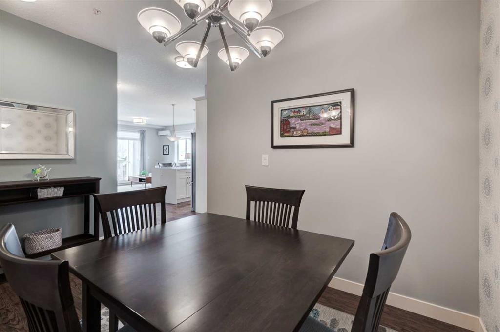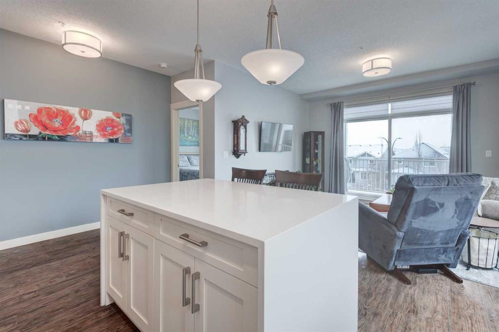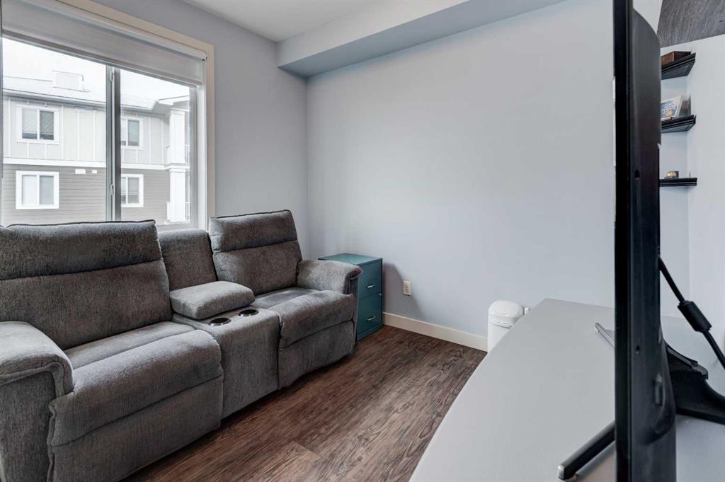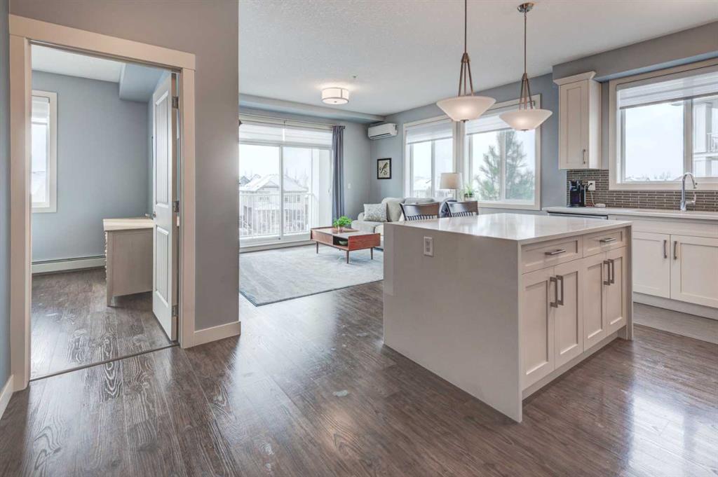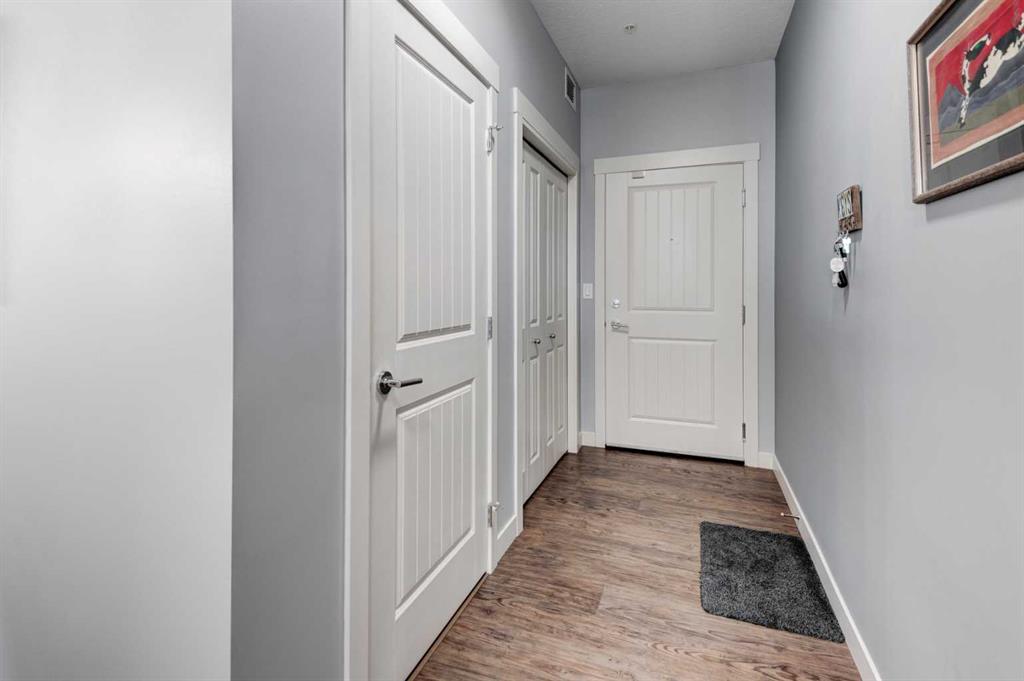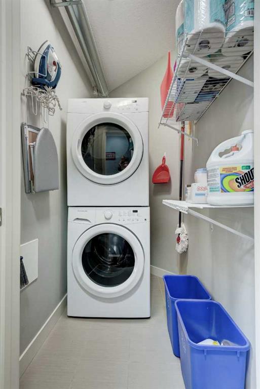 The original owners have kept this bright unit in impeccable condition. As you enter thru the front door, note the vinyl plank flooring throughout and the air conditioning to keep the unit at a comfortable temperature. The coat closet is conveniently on your right. The next door is a laundry room, and it is deep enough for additional storage. The den/flex area is currently used as a dining room. Continuing, there is a 4-piece bathroom and a second bedroom, that is currently used as a TV room. The open kitchen has quartz counters with upgraded waterfall countertops on the island. The 4 stainless steel appliances and breakfast bar stools are all included! The living room, with an electric fireplace, leads to the west facing balcony, complete with a hooked-up gas barbeque. The primary bedroom is off to the side and has a walk thru closet leading to the 3-piece bathroom with a lovely walk in shower. You won’t be disappointed in this lovely unit that has two titled parking stalls, one underground, in front of the storage unit and one outside.