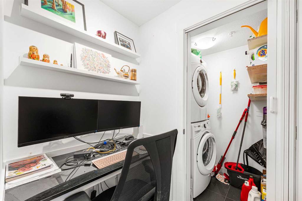 The modern kitchen is a culinary dream, boasting floor-to-ceiling cabinetry, granite countertops, stainless steel appliances, and a sleek eat-in bar for quick meals. Flow seamlessly into the formal dining room, or retreat to the cozy, quiet den with discreetly integrated laundry. The living area serves as the heart of the home, anchored by a striking stone feature wall and sliding doors that open to your sun-drenched balcony.