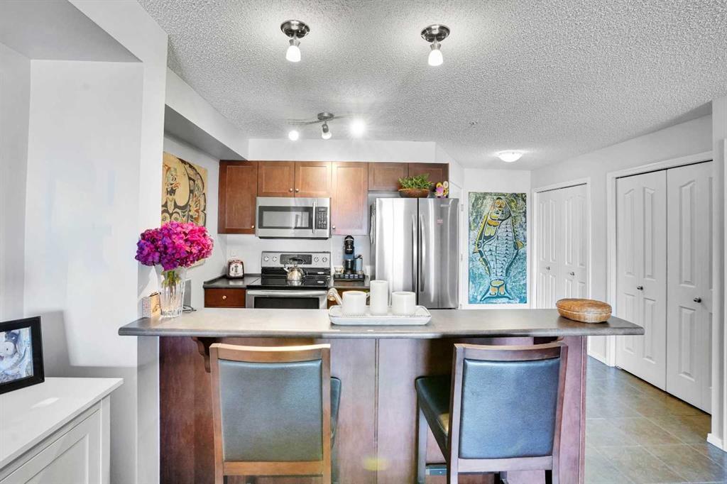 Welcome Home! This sweet condo is absolutely perfect for those who want a peaceful place to call their own. You can feel it as soon as you step into the suite. This corner suite overlooks walking paths, community spaces and greenery and the east exposure guarantees bright mornings. A generous size balcony is accessed through sliding patio doors from the living room: add some patio furniture, then sit back and enjoy the view. Tastefully decorated and well kept with dark stained wooden cabinetry, ceramic floor in the entry, kitchen and bathroom, laminate flooring in the living room and dining area, raised breakfast/casual/dining counter and upgraded appliances. The corner electric fireplace adds to the ambiance of this home. When it’s cold outside, the heater fan can be turned on to gently warm the living area. Can you say “cozy”…?? There is abundant storage in the closets with built in shelving and space savers. An oversized, tiled, walk in shower in the main bath is both beautiful and functional. Care and thought was absolutely put into its design. Pride of ownership is both felt and seen in every part of this delightful condo. Walking distance to shopping complex with Shopper’s Drug Mart, Save-On-Foods, banks, restaurants and… of course…. a Timmy’s. A short drive will take you to the full Country Hills Shopping complex boasting a theatre, flower shops and the Calgary Public Library at Country Hills! CrossIron Mills is 15 minutes away. If you don’t drive, Calgary Transit offers good service with connections at the North Pointe Terminal that’s beside the Country Hills Complex. Check out the Panorama Pointe Community Centre, an active and expansive recreation facility for the area. A golf course is close by. Your designated parking stall #15 with power is right in front of the building. Condo fees include all utilities, even electricity. This home offers affordable, low maintenance living in a lovely area of Calgary. Contact your realtor to see it today!!