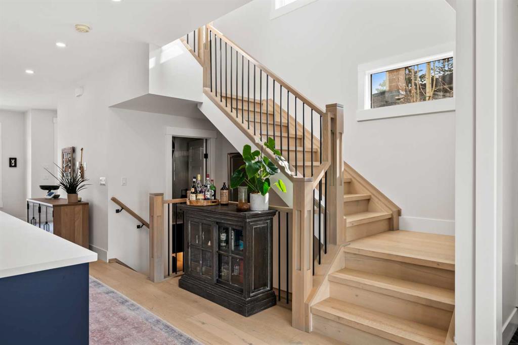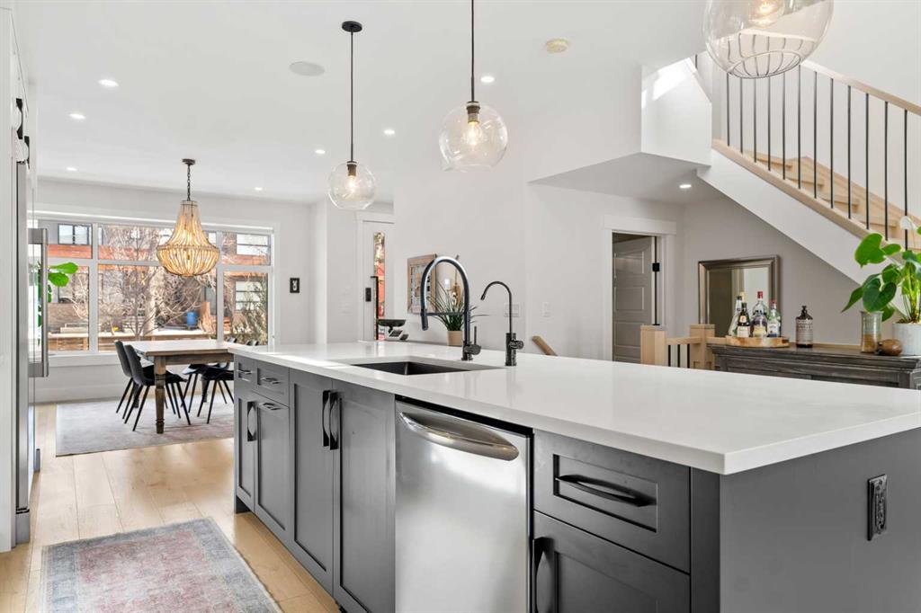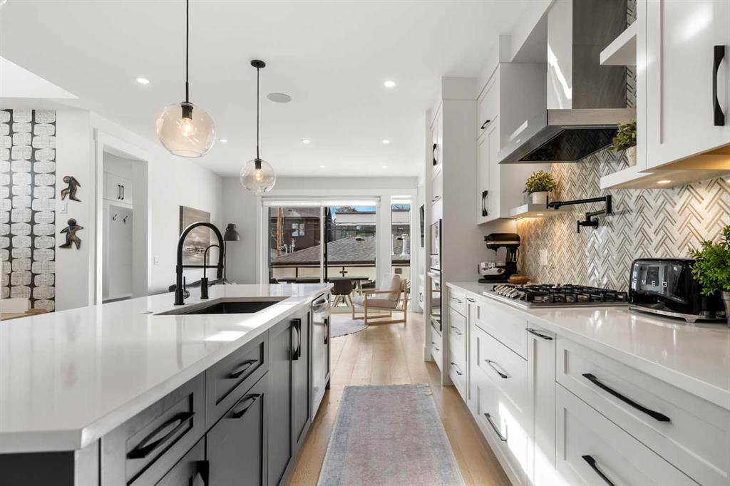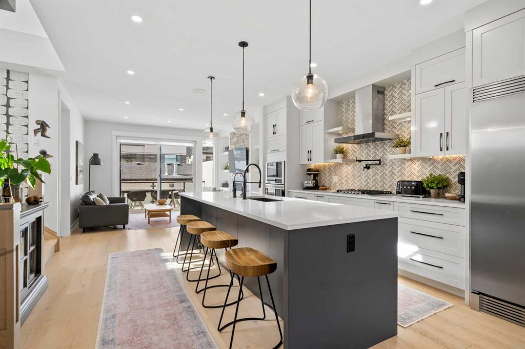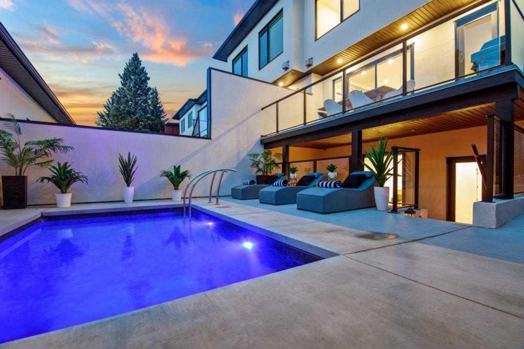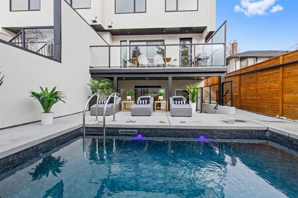 Welcome to this exceptional modern family home in the heart of the inner city, where thoughtful design and upscale finishes combine to create a truly refined living experience. Perfectly positioned to take advantage of both sunrise and sunset views, this beautifully crafted residence showcases meticulous attention to detail throughout. Step inside to a professionally curated interior featuring soaring 9-foot ceilings on two levels, wide-plank hardwood flooring spanning all three levels, and elegant marble tile accents. Restoration Hardware lighting paired with recessed lighting creates a warm and sophisticated atmosphere, while built-in speakers add to the home’s modern comfort. The designer kitchen is both stunning and highly functional, outfitted with professional-grade appliances including a gas cooktop, built-in oven and microwave, chimney-style range hood, and an impressive side-by-side refrigerator and freezer. Quartz countertops, floor-to-ceiling cabinetry, under-cabinet lighting, and abundant storage ensure the space is as practical as it is beautiful. Designed for effortless day-to-day living, the home also includes custom storage solutions throughout, a central vacuum system, and central air conditioning. The inviting living room features a striking marble-tiled fireplace framed by custom built-in cabinetry and shelving. Expansive floor-to-ceiling windows and a sliding patio door fill the space with natural light while seamlessly connecting the interior to the sunny west-facing backyard. A stylish powder room completes the main level. Upstairs, the primary suite offers a luxurious private retreat with soaring ceilings and a spa-inspired five-piece ensuite. Heated marble floors, a double vanity, a large steam shower with rain shower head, and an expansive walk-in closet create a space designed for relaxation. Two additional spacious bedrooms, a beautifully appointed main bathroom, and a conveniently located laundry room complete the upper level. The walk-out basement continues the home’s impressive design with nearly 9-foot ceilings and comfortable in-floor radiant heating. This level is ideal for entertaining, featuring a generous recreation room with a wet bar, a large fourth bedroom, and an additional bathroom perfect for guests or extended family. A well-designed mudroom with extensive storage adds even more functionality. Step outside to enjoy the private, low-maintenance backyard oasis. The heated saltwater pool can be warmed to hot-tub temperatures or used as an exercise pool with the training tether for fitness enthusiasts. Surrounding decking and professional landscaping create an inviting outdoor space for relaxing or entertaining. Completing the property is a heated and insulated double detached garage and beautifully landscaped front yard. Situated on a quiet street in the desirable inner-city community of Glenbrook, this home offers outstanding convenience with a short walk to all nearby amenities, plus quick access to Marda Loop.