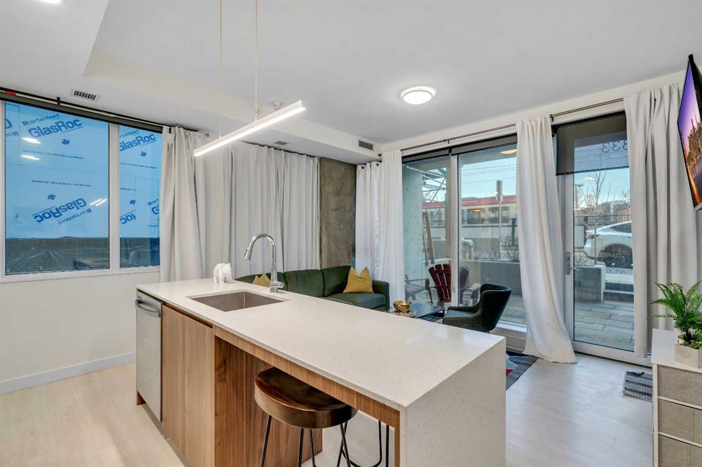 Set within the heart of Sunnyside, this ground-level end unit at The Annex by Minto delivers modern design, urban energy and thoughtful livability in one of Calgary’s most walkable communities. An open floor plan creates a natural flow between kitchen and living spaces, supporting everyday function while maintaining a clean, contemporary feel ideal for city-focused living. The kitchen is beautifully finished with abundant 2-toned cabinetry, stainless steel appliances, a gas stove for precision cooking and a centre island with built-in seating that encourages casual meals, entertaining and connection. Adjacent living space invites relaxation with an entire wall of west-facing glass that fills the home with afternoon light while framing downtown views and adding warmth and visual depth throughout the day. Direct access to a ground-level patio extends the living area outdoors, offering a front-row seat for summer barbecues, people watching and soaking in the vibrant character of this highly urban setting. A spacious bedroom provides a quiet retreat with room to unwind, while a stylish 4-piece bathroom complements the modern aesthetic with clean lines and practical finishes. In-unit laundry adds everyday convenience, and an assigned storage locker keeps seasonal items organized and out of sight. Built with concrete construction, The Annex is known for its quiet interiors, low condo fees and sustainable design as a LEED Gold V4 mid-rise, featuring award-winning Nyhoff architecture and a pet-friendly policy (upon board approval). An unbeatable location places restaurants, coffee shops, boutique fitness, grocery options, the C-Train and the Bow River pathway system just steps away, offering a Walk Score of 94, seamless transit access and a lifestyle that supports connection, movement and effortless access to downtown Calgary!