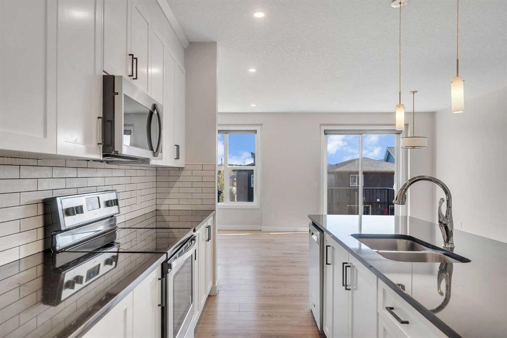 Chef’s kitchen with a long granite island, sleek white cabinetry, stainless steel appliances, and upgraded backsplash.