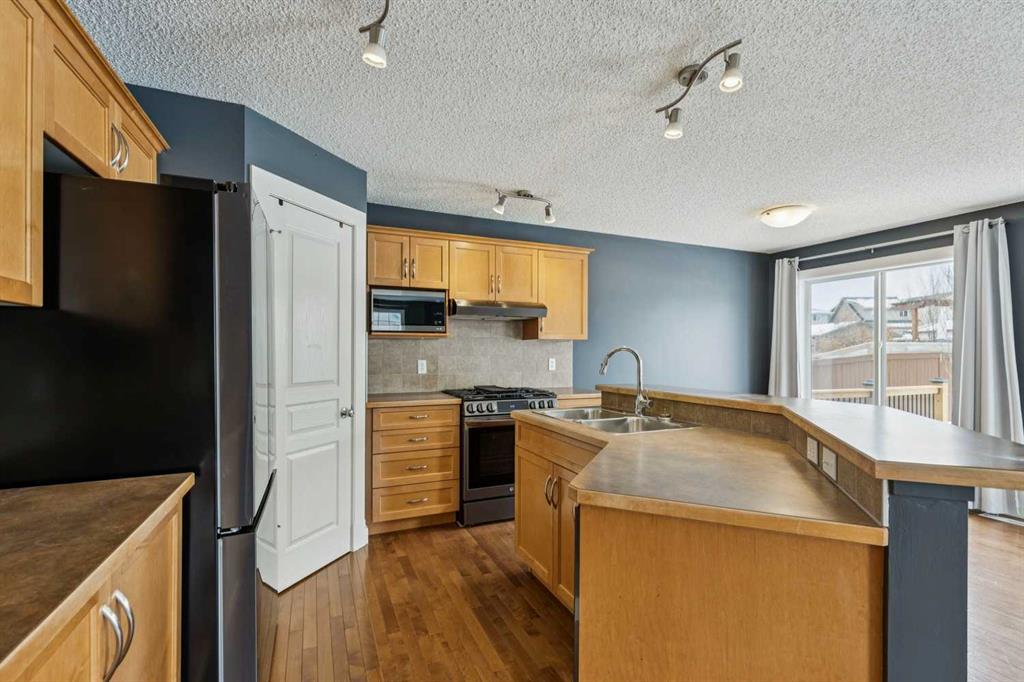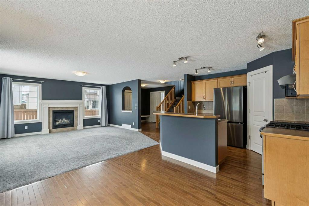 Meet “Sage” – The Natural Light Lover’s Dream – Situated on a large corner lot in Sagewood, this well-maintained home offers space, light, and flexibility both inside and out, complete with an attached double garage. The west-facing backyard is ideal for evening sun and features a brand new deck (2025), with potential for RV parking, adding even more versatility. Inside, the main floor is bright and inviting with abundant natural light, a functional kitchen complete with pantry and eating bar, and recent upgrades including a new fridge (2025), gas range (2022), and hood fan (2026). The living room centers around a cozy gas fireplace with an abundance of windows, while a convenient 2-piece bathroom and laundry room featuring a new washer (2025) and dryer (2026) complete the level.