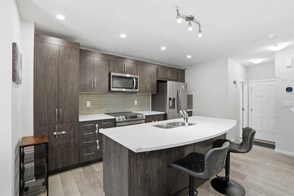 The open-concept main floor was built to host. A bright kitchen with white quartz countertops, stainless steel appliances, sleek track lighting, and a statement island that says, “pull up a chair and stay awhile.” The dining area is elevated with a modern chandelier, and luxury vinyl plank flooring runs throughout, durable, stylish, and ready for whatever life throws at it.