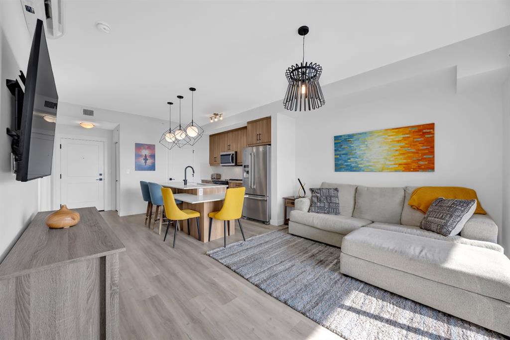 The modern kitchen has been thoughtfully updated with quartz countertops, upgraded stainless steel appliances, sleek cabinetry, and ample counter space, perfect for both everyday living and entertaining. The kitchen flows seamlessly into the dining and living areas, where you can step out onto your private balcony and take in the breathtaking west-facing mountain views and evening sunsets.