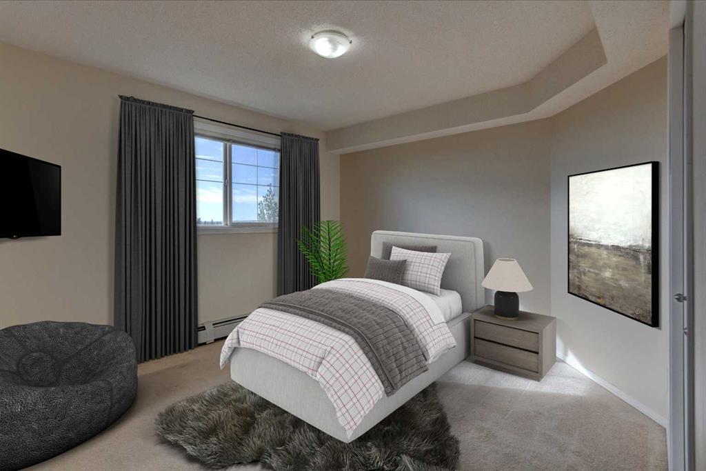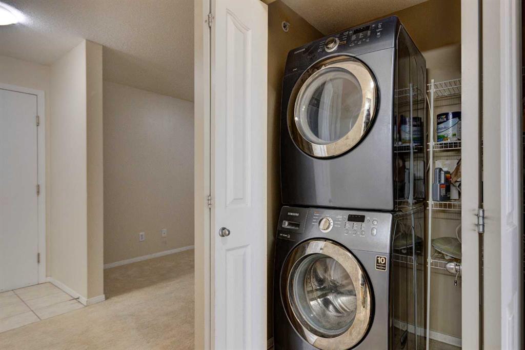 This top floor (nobody upstairs from you is a true bonus) 2 bedroom, 2 bathroom unit features an additional room that could be used for a home office, child’s play area, man cave, home gym, library or whatever you wish, At over 1050 sq ft, it’s the largest floorplan in the complex. Both bedrooms are a good size so a guest room, roommate or child’s room are all possibilities. The in suite laundry is full size front loaders! You’ll love the balcony, overlooking the community below and there’s even a mountain view to enjoy while sipping your morning coffee, a glass of wine before dinner, or a Saturday afternoon beer with a friend. A titled underground parking space is so welcome in winter and summer, for comfort and security, and the long term leased spot above ground is near the entrance and is very handy for a large vehicle and especially handy for a second vehicle. Easy access to Stoney or Deerfoot for commuting purposes and lots of shopping, restaurants and amenities are so close! The entire unit is Freshly painted and your Condo fees include all utilities for easy budgeting. This unit is move- in ready or easy to rent out as an income property if you prefer. Cats are welcome in the building