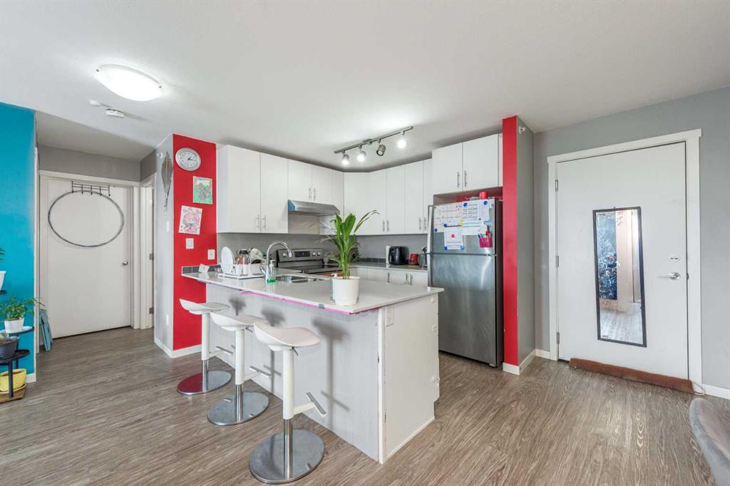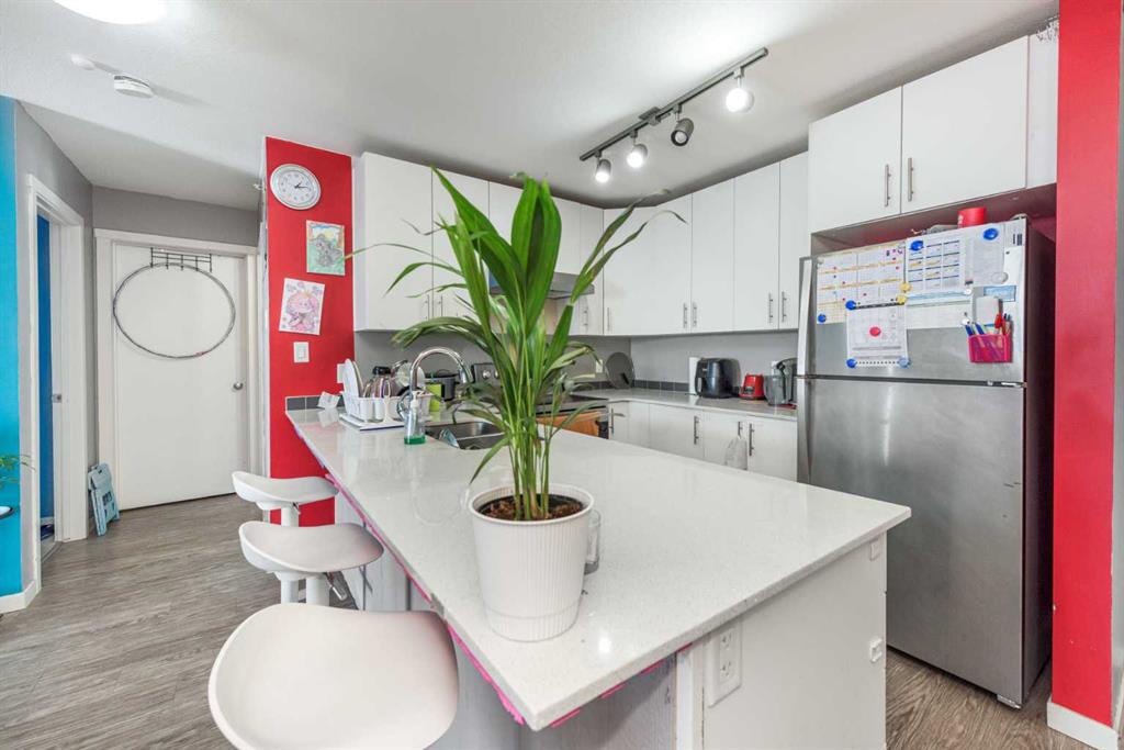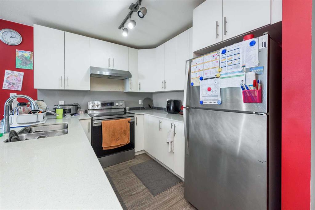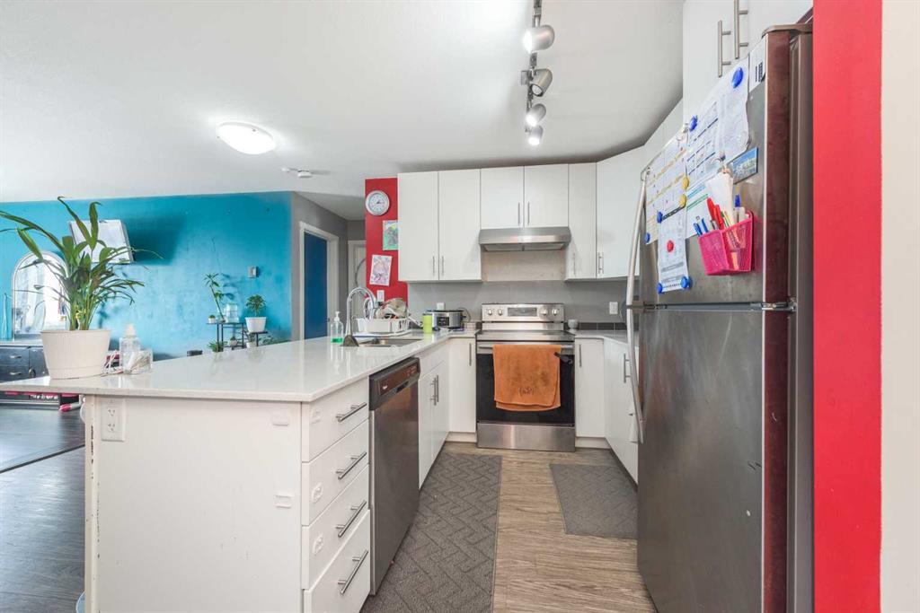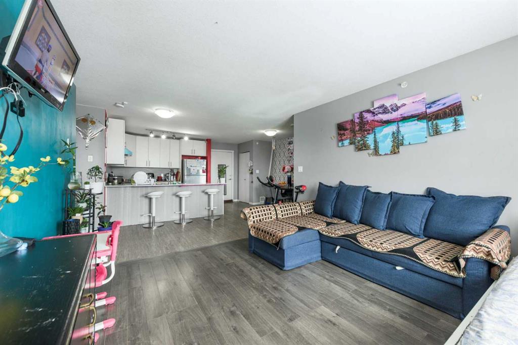 WELCOME to this Top floor 2 bedroom condo in a 4 storey high apartment building. The impressive noise reducing features include triple pane windows and floor & wall assemblies engineered to provide top rated soundproofing. This spacious unit 839 sqft boasts an open floor plan with contemporary island kitchen, with white quartz countertops, stainless steel appliances and laminate flooring. The Dining space is ideal for entertaining family and friends. Abundance of storage including large laundry room with washer and dryer. The garden door opens to the large covered South facing balcony with ample space for relaxing and year round BBQ’s. SOUTH FACING BALCONY MEANS ?? LIGHT THE WHOLE DAY. BUILDING COMPLEX FEATURES THE ENTERTAINMENT FACILITY WHICH INCLUDES THE FITNESS GYM AND PARTY HALL WITH FULL KITCHEN THAT HAS A GATHERING CAPACITY UPTO 30 PERSONS . The titled, heated underground parking and 35 plus visitor parking stalls completes this lovely home. Enjoy an affordable carefree lifestyle. Near by Amenities Includes various shopping plazas including restaurants, Dollar store, and Gas stations, Combined Primary and secondary School is at the walking distance, Calgary International Airport is 10 minutes away. Building complex also features Bicycle storage, fenced pet play area and vegetable grow garden which includes elevated grow beds.