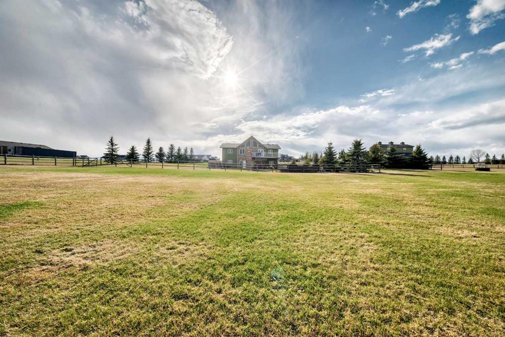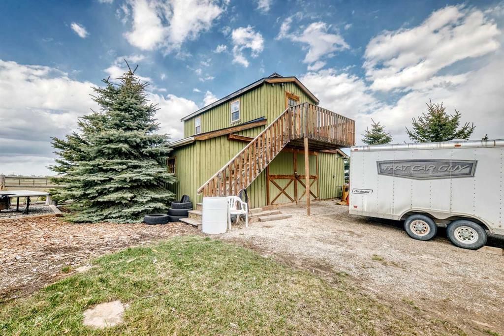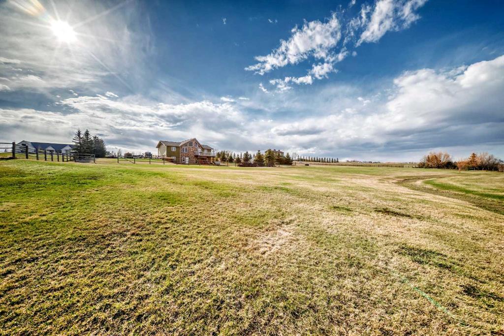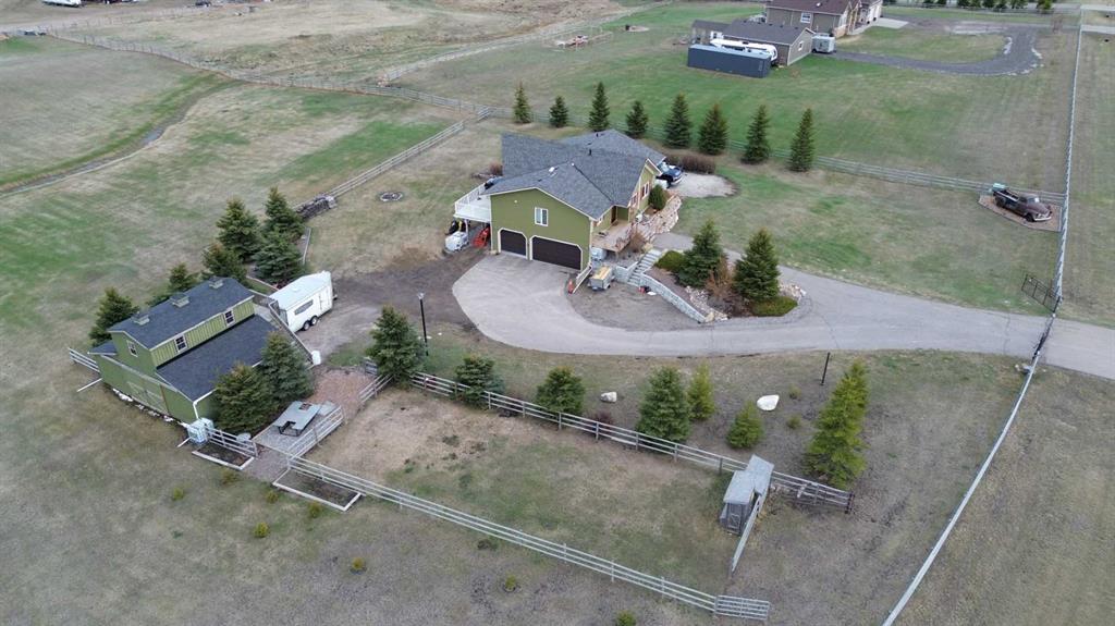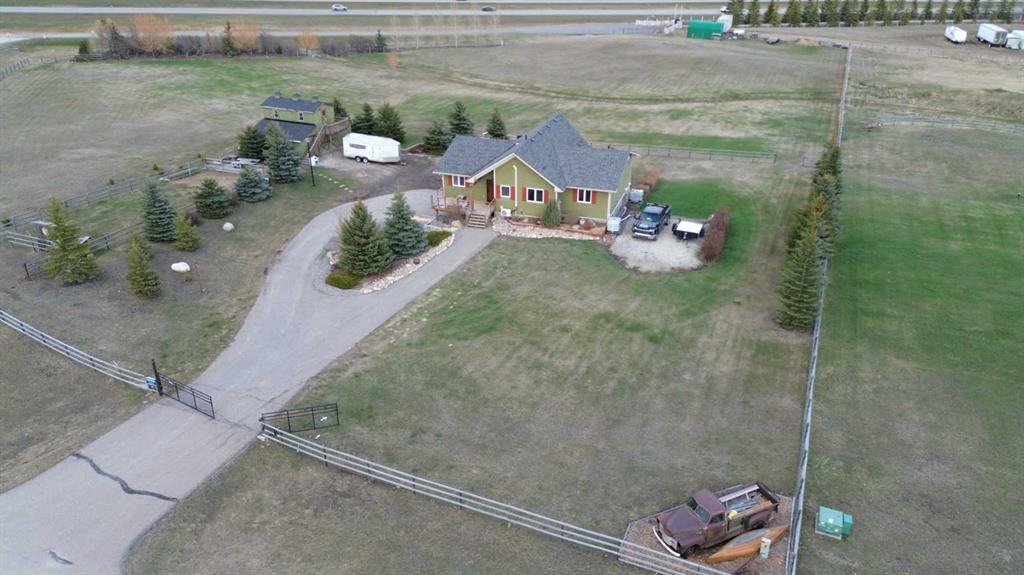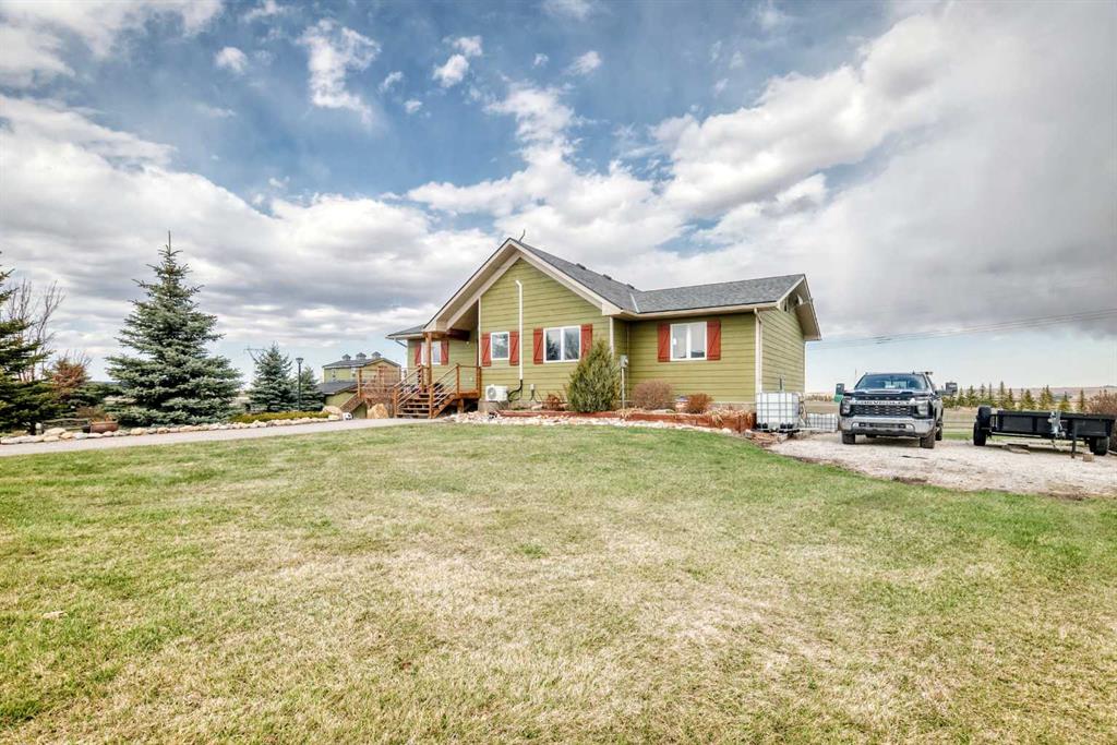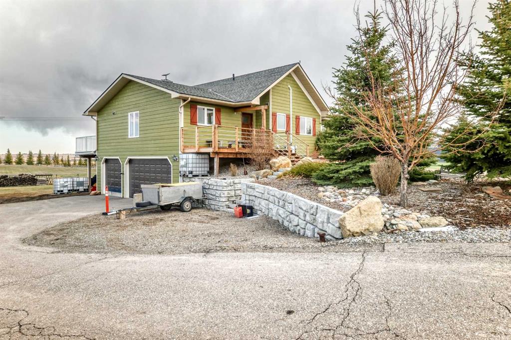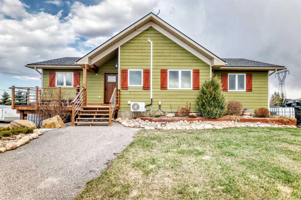 Incredibly well maintained acreage property with fast access to Okotoks and Calgary. Set on 4.3 acres, this home is move in ready. This walkout bungalow is open concept with vaulted ceilings. Main floor features white kitchen with stainless steel appliances, corner pantry and large island. Plenty of room for friends and extended family in the large dining room. The living room offers large windows and has room for even the largest sectional. Primary bedroom also has vaulted ceiling, walkin closet and newly renovated ensuite with dual sinks, and tiled shower. Laundry is tucked away off the ensuite. Two more bedrooms and main bathroom complete the main floor. Basement has additional bedroom, full bathroom and family room. Plenty of space of hobbies in the lofted barn, Currently used as a workshop, it could easily be converted into a 3 stall barn. Upstairs loft has heat and electricity and was used as a teen hangout but would work well as a creative space. Lots of trees have been planted over the years and the spring stream that flows through the back of the property adds more interest to the landscape. Triple garage will fit your F150! RV parking to the south of the house has sani-dump hook up to the septice system. Impressive mechanical system with infloor heating that heats the entire home. Split AC in primary bedroom for those warmer summer nights.