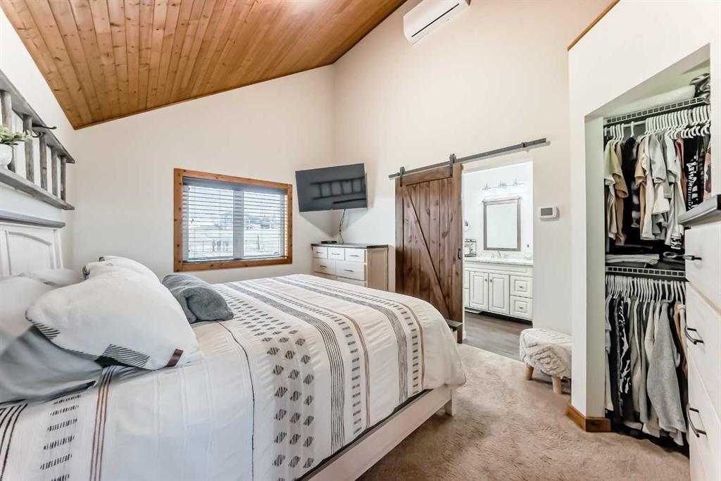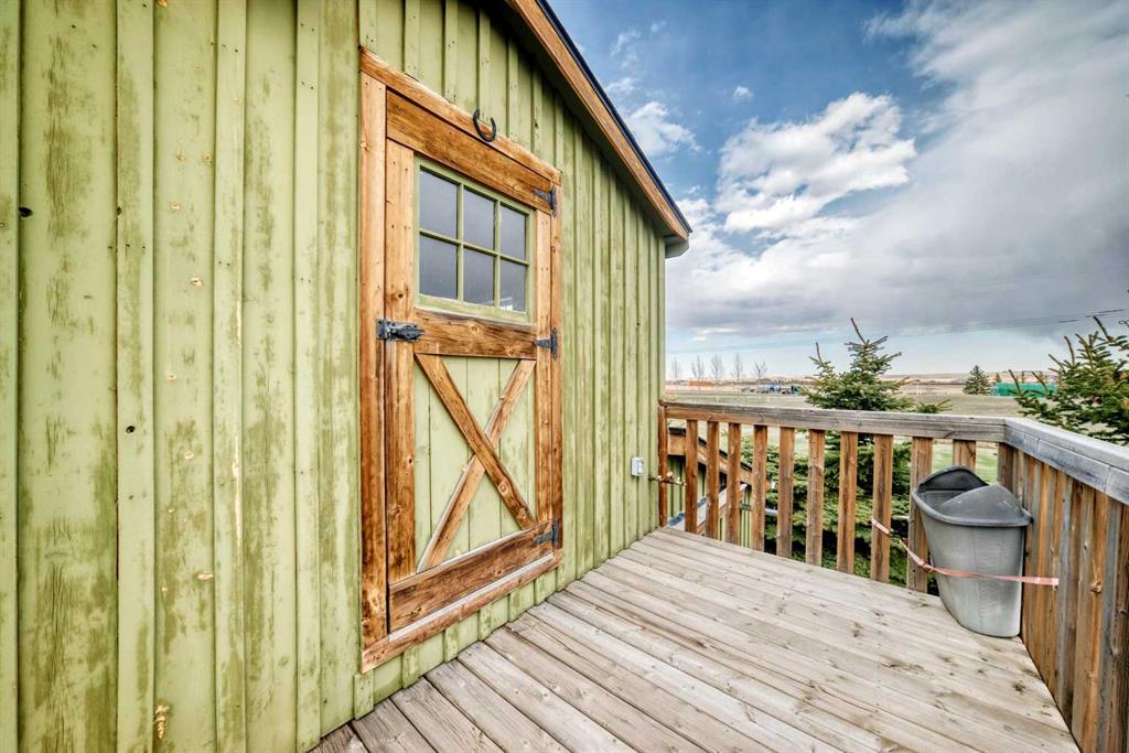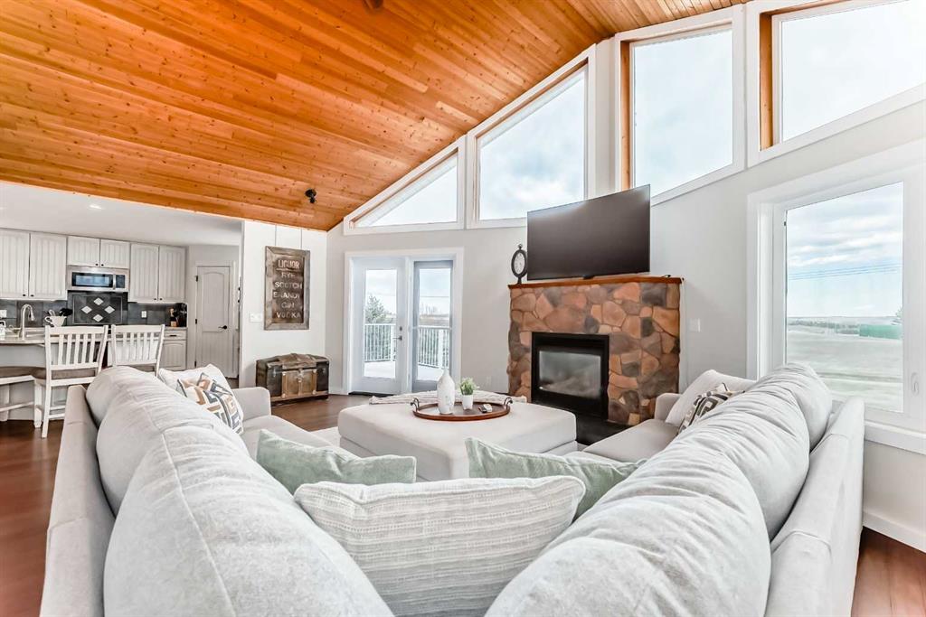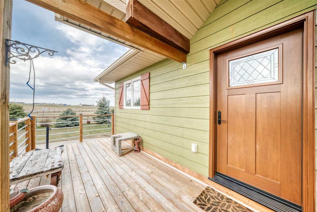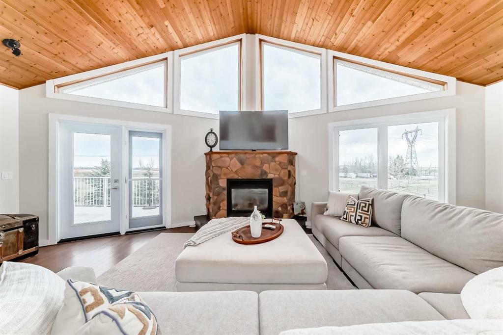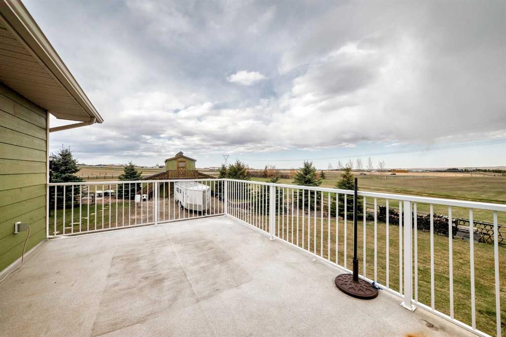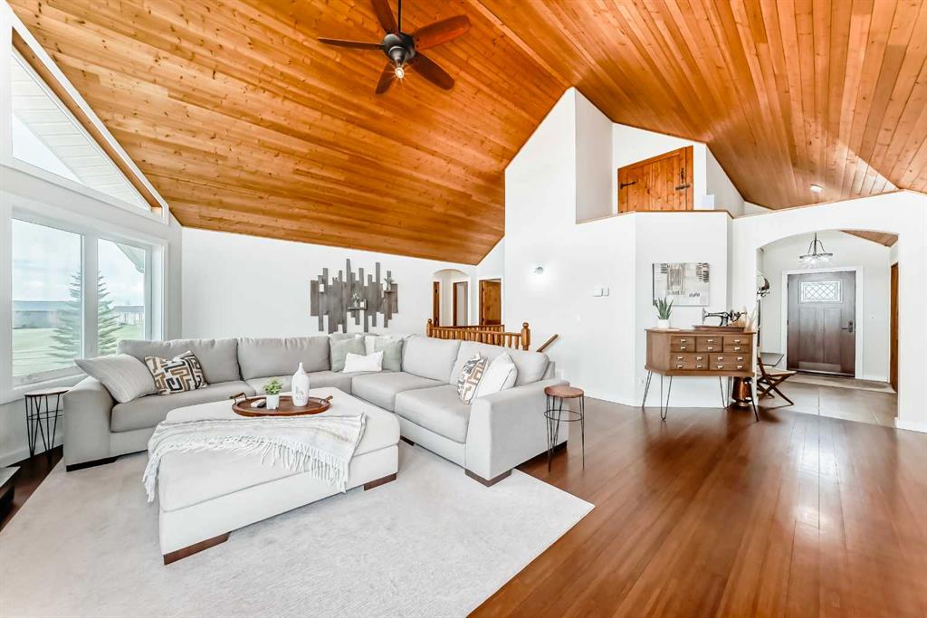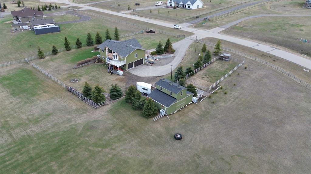 Incredibly well maintained acreage property with fast access to Okotoks and Calgary. Set on 4.3 acres, this home is move in ready. This walkout bungalow is open concept with vaulted ceilings. Main floor features white kitchen with stainless steel appliances, corner pantry and large island. Plenty of room for friends and extended family in the large dining room. The living room offers large windows and has room for even the largest sectional. Primary bedroom also has vaulted ceiling, walkin closet and newly renovated ensuite with dual sinks, and tiled shower. Laundry is tucked away off the ensuite. Two more bedrooms and main bathroom complete the main floor. Basement has additional bedroom, full bathroom and family room. Plenty of space of hobbies in the lofted barn, Currently used as a workshop, it could easily be converted into a 3 stall barn. Upstairs loft has heat and electricity and was used as a teen hangout but would work well as a creative space. Lots of trees have been planted over the years and the spring stream that flows through the back of the property adds more interest to the landscape. Triple garage will fit your F150! RV parking to the south of the house has sani-dump hook up to the septice system. Impressive mechanical system with infloor heating that heats the entire home. Split AC in primary bedroom for those warmer summer nights.