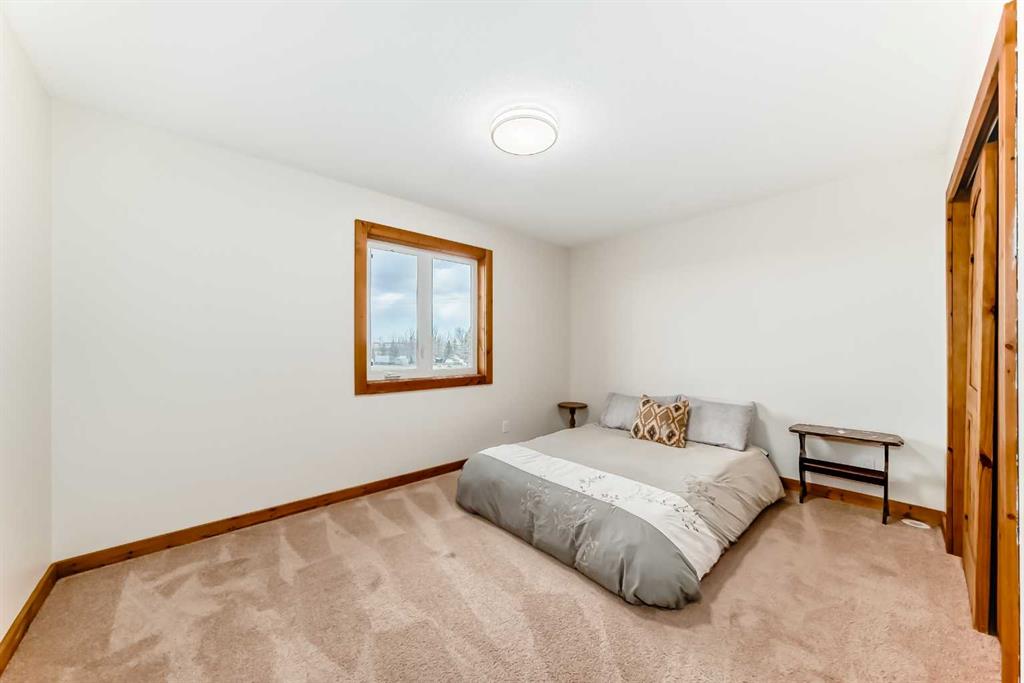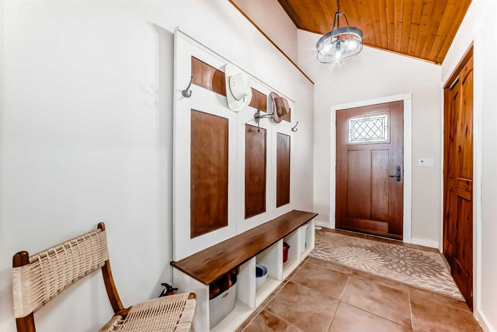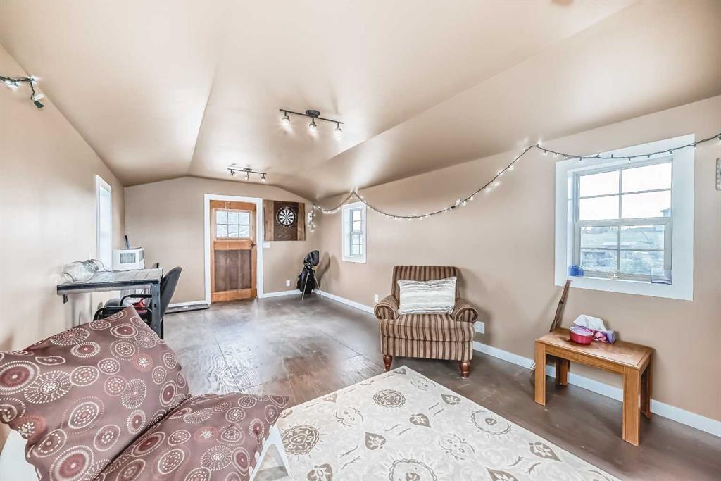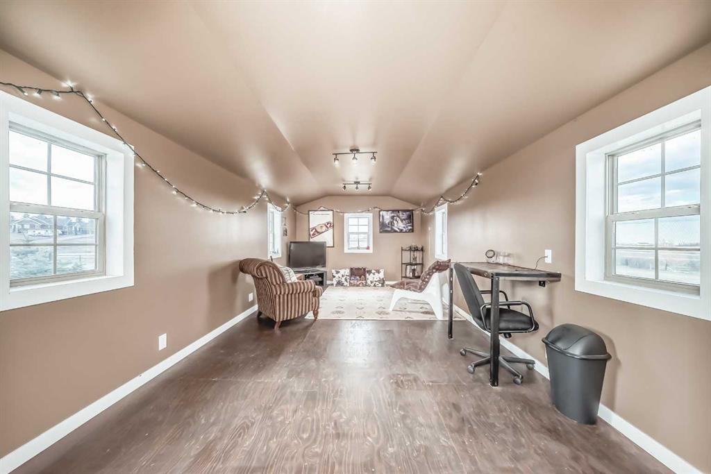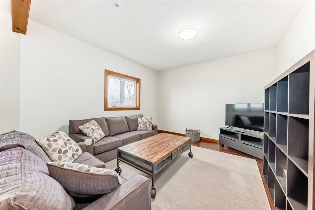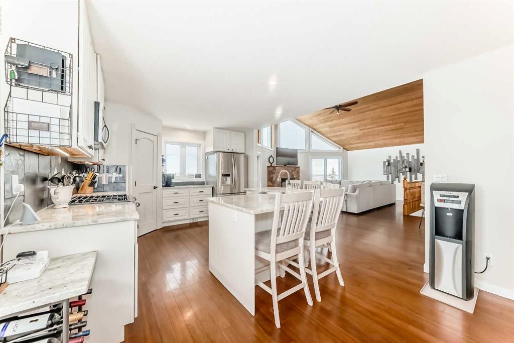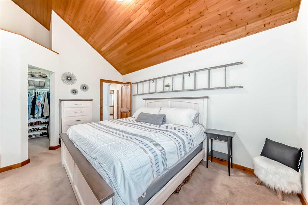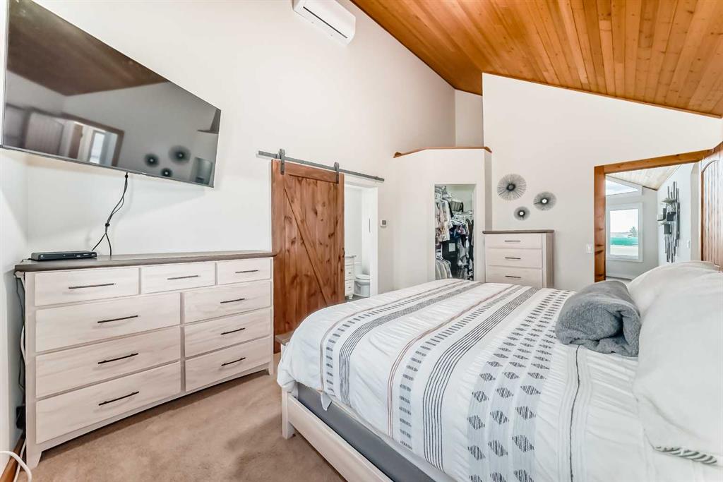 Incredibly well maintained acreage property with fast access to Okotoks and Calgary. Set on 4.3 acres, this home is move in ready. This walkout bungalow is open concept with vaulted ceilings. Main floor features white kitchen with stainless steel appliances, corner pantry and large island. Plenty of room for friends and extended family in the large dining room. The living room offers large windows and has room for even the largest sectional. Primary bedroom also has vaulted ceiling, walkin closet and newly renovated ensuite with dual sinks, and tiled shower. Laundry is tucked away off the ensuite. Two more bedrooms and main bathroom complete the main floor. Basement has additional bedroom, full bathroom and family room. Plenty of space of hobbies in the lofted barn, Currently used as a workshop, it could easily be converted into a 3 stall barn. Upstairs loft has heat and electricity and was used as a teen hangout but would work well as a creative space. Lots of trees have been planted over the years and the spring stream that flows through the back of the property adds more interest to the landscape. Triple garage will fit your F150! RV parking to the south of the house has sani-dump hook up to the septice system. Impressive mechanical system with infloor heating that heats the entire home. Split AC in primary bedroom for those warmer summer nights.
