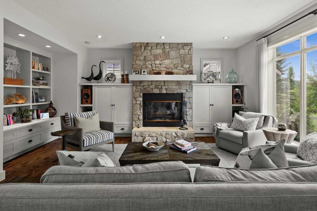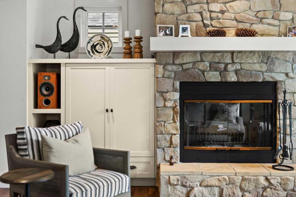 A spacious foyer welcomes you in and draws your gaze immediately toward the back of the home, where the family room unfolds around a wood-burning fireplace — an increasingly rare find – flanked by custom built-ins and complemented by bookshelf cabinetry that gives the space an inviting, lived-in warmth. The picture window here frames the backyard like a painting you’ll never tire of looking at.
