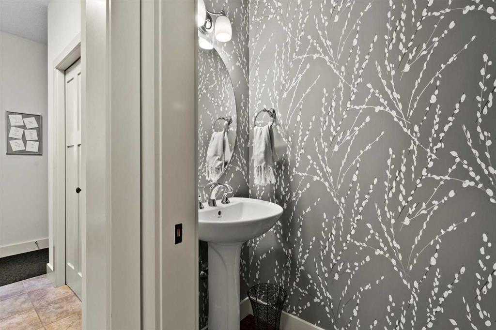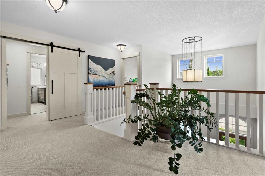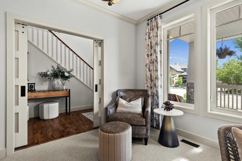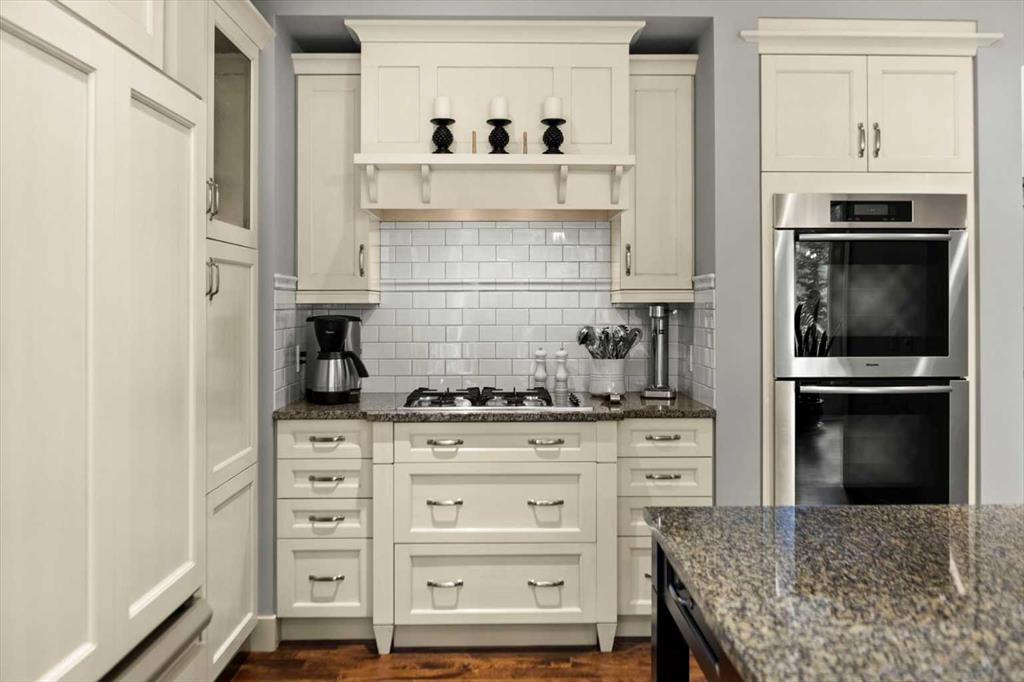 The kitchen is genuinely lovely: ivory cabinetry with granite counters, subway tile backsplash, gas cooktop, Miele double wall ovens, and a panel-front refrigerator. A slightly lowered counter section is a baker’s delight, and a cozy nook – originally designed as a breakfast area – has been reimagined as a quiet sitting spot with views over the yard and pond. The main floor also includes a well-appointed mudroom with garage access, a family command station, a powder room with charming wallpaper, and a flex room with sliding barn doors – ideal as a home office or reading room.