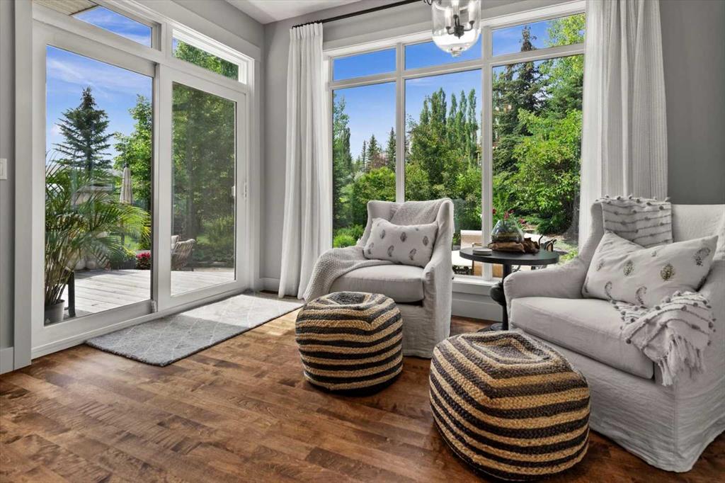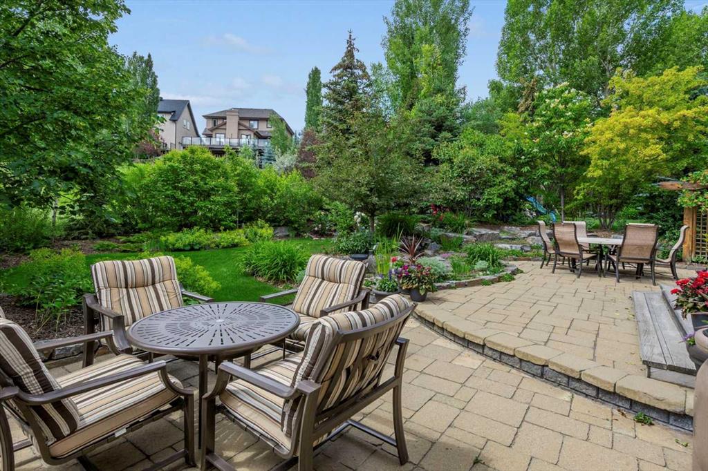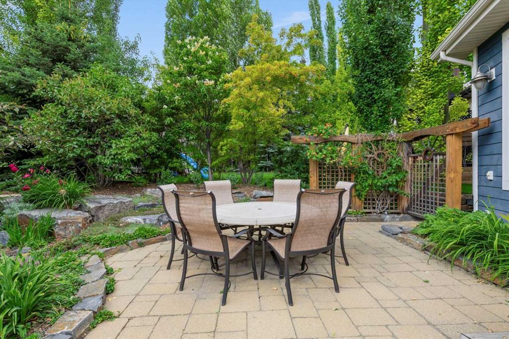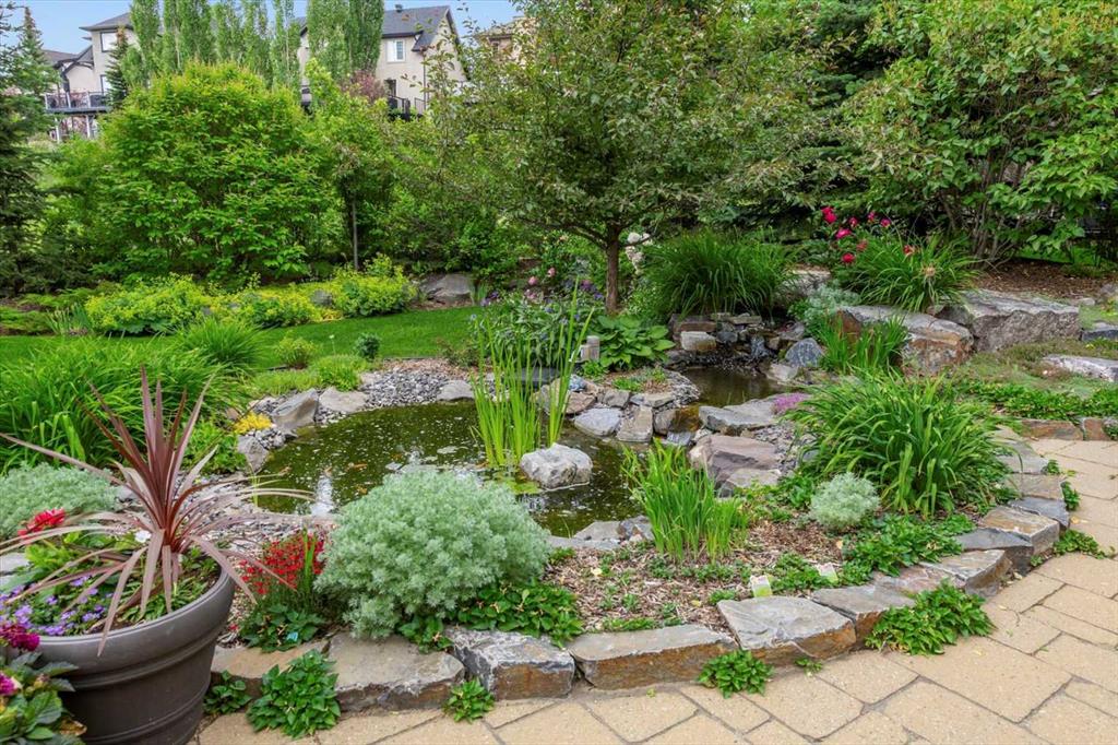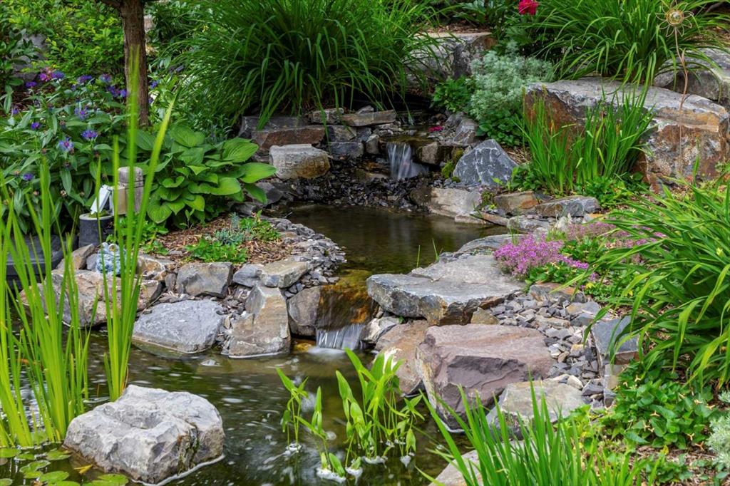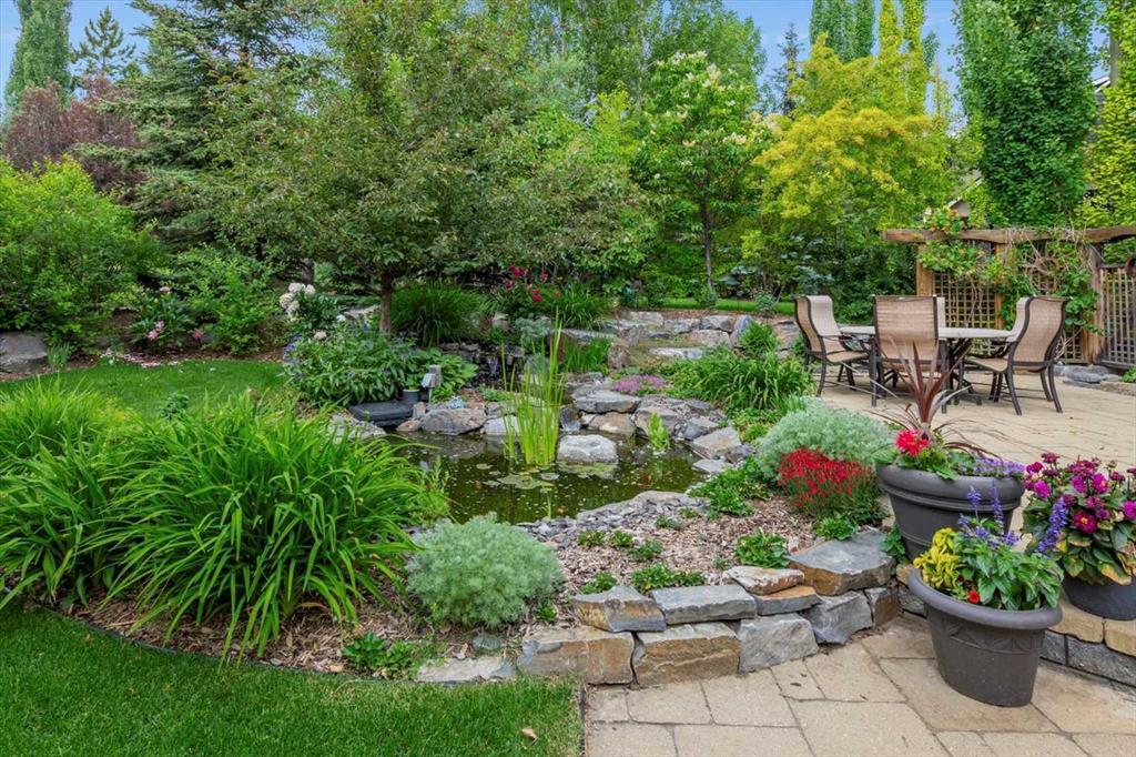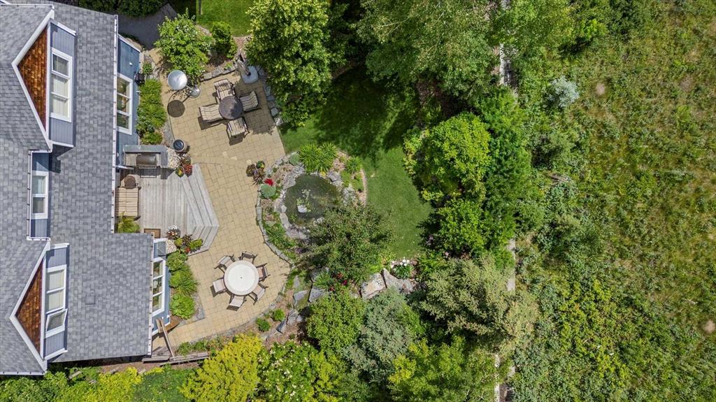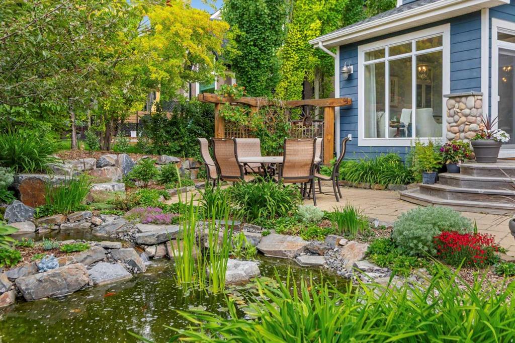 And then there is the backyard. Mature trees, a stone-edged pond, layered gardens bursting with perennials, multiple stone patio areas, a pergola, and additional green space beyond the property line – it is a garden sanctuary unlike anything you’ll find in a typical suburban yard. The seamless flow between the indoor and outdoor spaces makes entertaining feel entirely natural here.