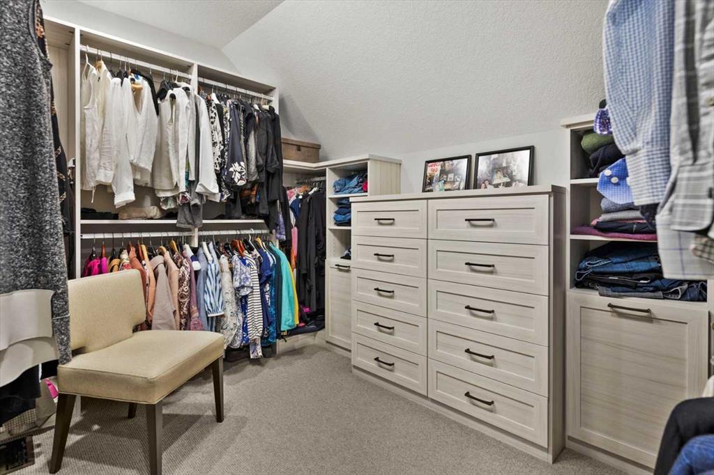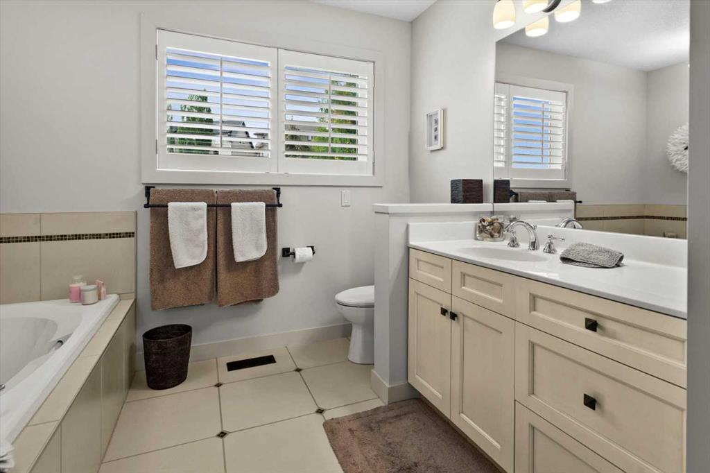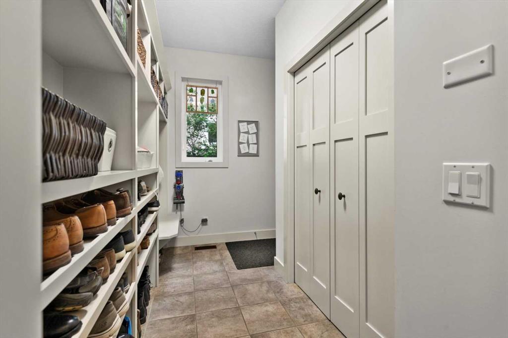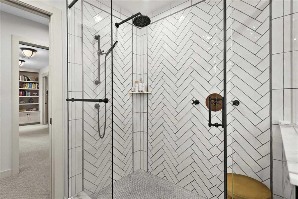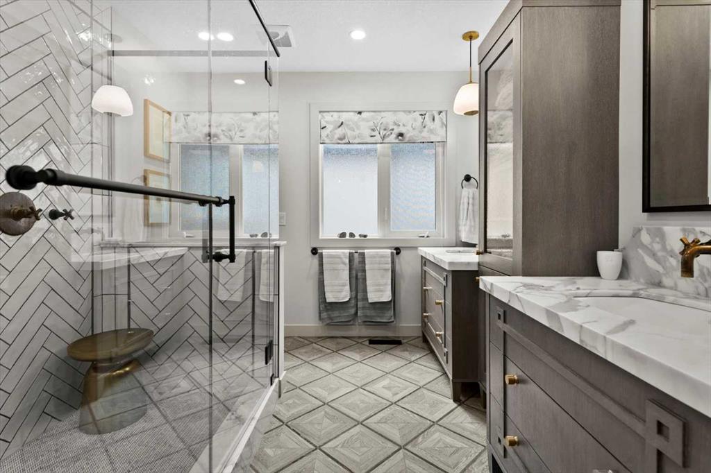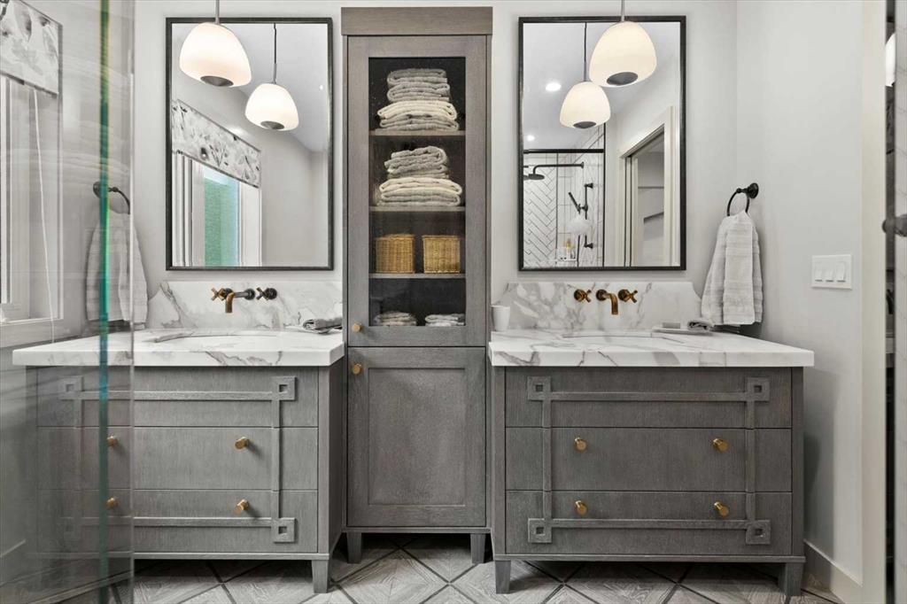 Upstairs, the wide staircase leads to a generous landing before arriving at the recently updated primary suite. It overlooks the yard, and the renovated ensuite is exceptional – thick marble counters, aged brass fixtures, and a herringbone-tiled shower where every detail has been chosen with care. The walk-in closet, outfitted with custom built-ins and his-and-hers laundry hampers, renders dressers unnecessary. Two additional bedrooms, a full bath, and a laundry room with sink complete the upper level.