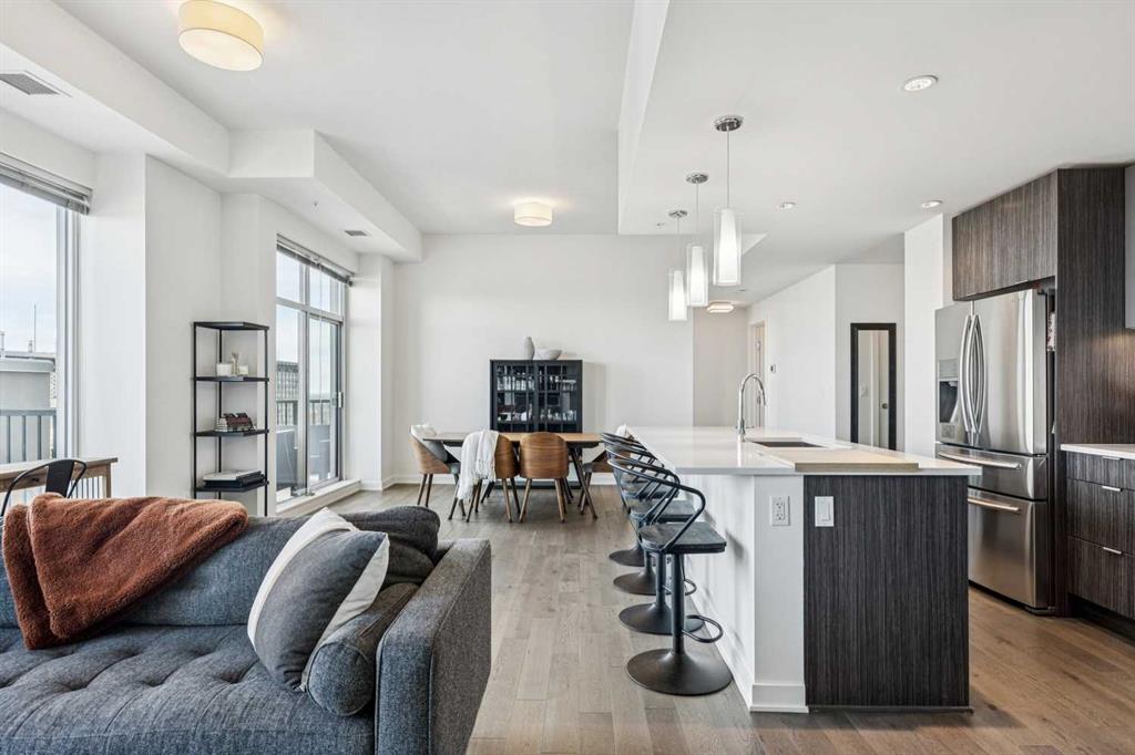 Experience elevated penthouse living at The Vogue, perched high above the city’s financial core. This rare 2 bedroom, 2 bathroom residence features soaring vaulted ceilings, floor-to-ceiling windows, and TWO well-placed balconies that capture sweeping urban views, river views, and natural light throughout the day. The thoughtfully designed layout includes a spacious primary retreat with a walk-in closet and an exceptional 5-piece ensuite with double vanity, a separate in-unit laundry room, and open-concept living ideal for both everyday comfort and entertaining. Offered in only a limited number of high-rise units, this penthouse delivers a truly exclusive living experience. Completing the package are TWO TITLED underground parking stalls (UNITS 1 & 2) with immediate access from the parkade entrance, a rare and valuable convenience in the downtown core.