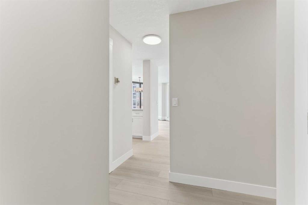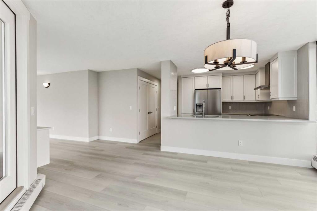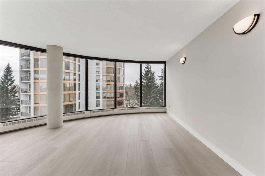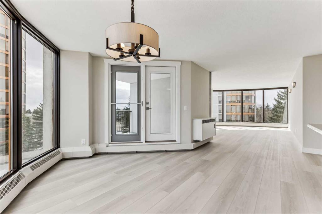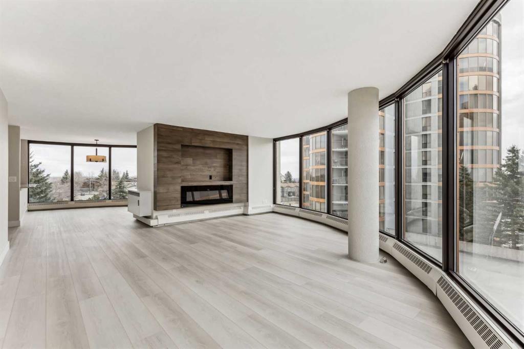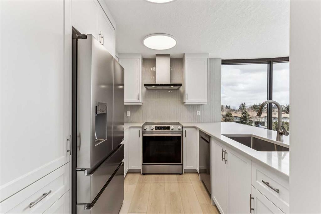 Impressive adult living 18+ COMPLETELY RENOVATED top to bottom 5th floor condo with exceptional workmanship and finishing in the exclusive Odyssey Towers of Coach Hill, with only four units per floor. Enjoy panoramic views from the floor-to-ceiling curved windows in this beautifully appointed 1178sq ft, bright and open floor plan. The condo features a CUSTOM KITCHEN, two bedrooms, an updated bathroom with a walk-in shower, in-suite laundry with a sink, a large in-suite storage room, and a generous-sized balcony. Renovations include a custom kitchen, vanities with quartz throughout, a complete stainless steel appliance package, air conditioning, a stunning feature wall with a built-in electric fireplace, new flooring throughout (luxury vinyl plank, and carpet), a new laundry sink, a wall-to-wall walk-in shower, knockdown textured ceilings throughout, upgraded plumbing and electrical, and much more. There are two parking stalls—one secured underground and a second convenient outdoor stall, as well as ample visitor parking. Amenities include a personalized building manager, a guest suite in each building for overnight guests, a sauna/steam room, a resident’s club, beautifully manicured green spaces and gardens, and a very well-managed and maintained complex. Enjoy maintenance-free living in one of Calgary’s premier adult living communities! Conveniently located within minutes to the bus stop/direct line to West Side LRT Station, Ambrose University, Rundle College, West Side Rec Center, parks, pathways, restaurants, and less than fifteen minutes to downtown. Quick possession and move-in ready!